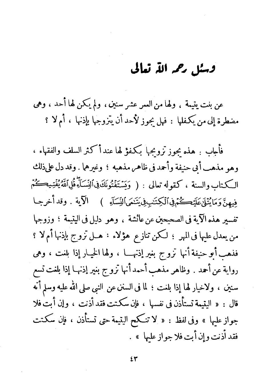 هَذِهِ يَجُوزُ تَزْوِيجُهَا بِكُفُؤِ لَهَا عِنْدَ أَكْثَرِ السَّلَفِ وَالْفُقَهَاءِ وَهُوَ مَذْهَبُ أَبِي حَنِيفَةَ وَأَحْمَد فِي ظَاهِرِ مَذْهَبِهِ؛ وَغَيْرِهِمَا. وَقَدْ دَلَّ عَلَى ذَلِكَ الْكِتَابُ وَالسُّنَّةُ كَقَوْلِهِ تَعَالَى: {وَيَسْتَفْتُونَكَ فِي النِّسَاءِ قُلِ اللَّهُ يُفْتِيكُمْ فِيهِنَّ وَمَا يُتْلَى عَلَيْكُمْ فِي الْكِتَابِ فِي يَتَامَى النِّسَاءِ} الْآيَةَ. وَقَدْ أَخْرَجَا تَفْسِيرَ هَذِهِ الْآيَةِ فِي الصَّحِيحَيْنِ عَنْ عَائِشَةَ وَهُوَ دَلِيلٌ فِي الْيَتِيمَةِ؛ وَزَوْجُهَا مَنْ يَعْدِلُ عَلَيْهَا فِي الْمَهْرِ؛ لَكِنْ تَنَازَعَ هَؤُلَاءِ: هَلْ تُزَوَّجُ بِإِذْنِهَا أَمْ لَا؟ فَذَهَبَ أَبُو حَنِيفَةَ أَنَّهَا تُزَوَّجُ بِغَيْرِ إذْنِهَا وَلَهَا الْخِيَارُ إذَا بَلَغَتْ وَهِيَ رِوَايَةٌ عَنْ أَحْمَد. وَظَاهِرُ مَذْهَبِ أَحْمَد أَنَّهَا تُزَوَّجُ بِغَيْرِ إذْنِهَا إذَا بَلَغَتْ تِسْعَ سِنِينَ وَلَا خِيَارَ لَهَا إذَا بَلَغَتْ؛ لِمَا فِي السُّنَنِ عَنْ النَّبِيِّ صَلَّى اللَّهُ عَلَيْهِ وَسَلَّمَ أَنَّهُ قَالَ: {الْيَتِيمَةُ تُسْتَأْذَنُ فِي نَفْسِهَا فَإِنْ سَكَتَتْ فَقَدْ أَذِنَتْ وَإِنْ أَبَتْ فَلَا جَوَازَ عَلَيْهَا} وَفِي لَفْظٍ: {لَا تُنْكَحُ الْيَتِيمَةُ حَتَّى تُسْتَأْذَنَ فَإِنْ سَكَتَتْ فَقَدْ أَذِنَتْ وَإِنْ أَبَتْ فَلَا جَوَازَ عَلَيْهَا} .