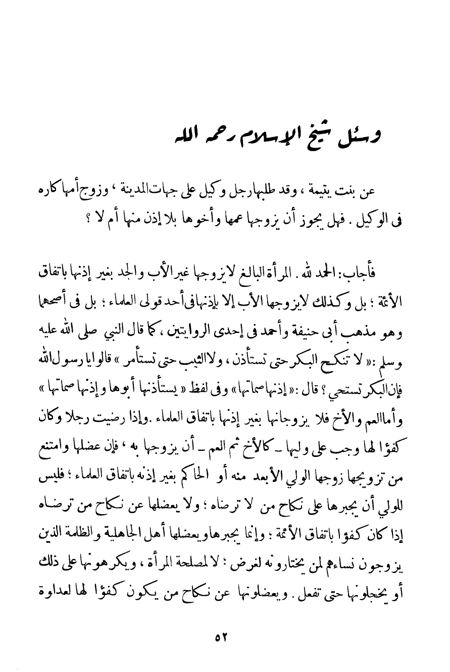 عَنْ بِنْتٍ يَتِيمَةٍ وَقَدْ طَلَبَهَا رَجُلٌ وَكِيلٌ عَلَى جِهَاتِ الْمَدِينَةِ وَزَوْجُ أُمِّهَا كَارِهٌ فِي الْوَكِيلِ. فَهَلْ يَجُوزُ أَنْ يُزَوِّجَهَا عَمُّهَا وَأَخُوهَا بِلَا إذْنٍ مِنْهَا أَمْ لَا؟