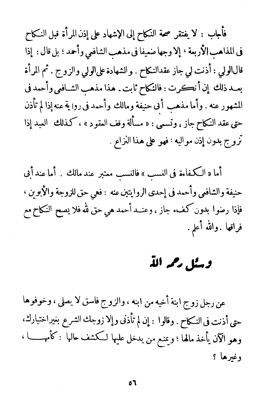 فَأَجَابَ: لَا تَفْتَقِرُ صِحَّةُ النِّكَاحِ إلَى الْإِشْهَادِ عَلَى إذْنِ الْمَرْأَةِ قَبْلَ النِّكَاحِ فِي الْمَذَاهِبِ الْأَرْبَعَةِ إلَّا وَجْهًا ضَعِيفًا فِي مَذْهَبِ الشَّافِعِيِّ وَأَحْمَد؛ بَلْ قَالَ: إذَا قَالَ الْوَلِيُّ: أَذِنَتْ لِي جَازَ عَقْدُ النِّكَاحِ وَالشَّهَادَةُ عَلَى الْوَلِيِّ وَالزَّوْجِ. ثُمَّ الْمَرْأَةُ بَعْدَ ذَلِكَ إنْ أَنْكَرَتْ: فَالنِّكَاحُ ثَابِتٌ. هَذَا مَذْهَبُ الشَّافِعِيِّ وَأَحْمَد فِي الْمَشْهُورِ عَنْهُ. وَأَمَّا مَذْهَبُ أَبِي حَنِيفَةَ وَمَالِكٍ وَأَحْمَد فِي رِوَايَةٍ عَنْهُ إذَا لَمْ تَأْذَنْ حَتَّى عُقِدَ النِّكَاحُ جَازَ وَتُسَمَّى: " مَسْأَلَةُ وَقْفِ الْعُقُودِ " كَذَلِكَ الْعَبْدُ إذَا تَزَوَّجَ بِدُونِ إذْنِ مَوَالِيهِ؛ فَهُوَ عَلَى هَذَا النِّزَاعِ. أَمَّا " الْكَفَاءَةُ فِي النَّسَبِ " فَالنَّسَبُ مُعْتَبَرٌ عِنْد مَالِكٍ. أَمَّا عِنْدَ أَبِي حَنِيفَةَ وَالشَّافِعِيِّ وَأَحْمَد فِي إحْدَى الرِّوَايَتَيْنِ عَنْهُ: فَهِيَ حَقٌّ لِلزَّوْجَةِ وَالْأَبَوَيْنِ فَإِذَا رَضُوا بِدُونِ كُفْءٍ جَازَ وَعِنْدَ أَحْمَد هِيَ حَقٌّ لِلَّهِ فَلَا يَصِحُّ النِّكَاحُ مَعَ فِرَاقِهَا. وَاَللَّهُ أَعْلَمُ.