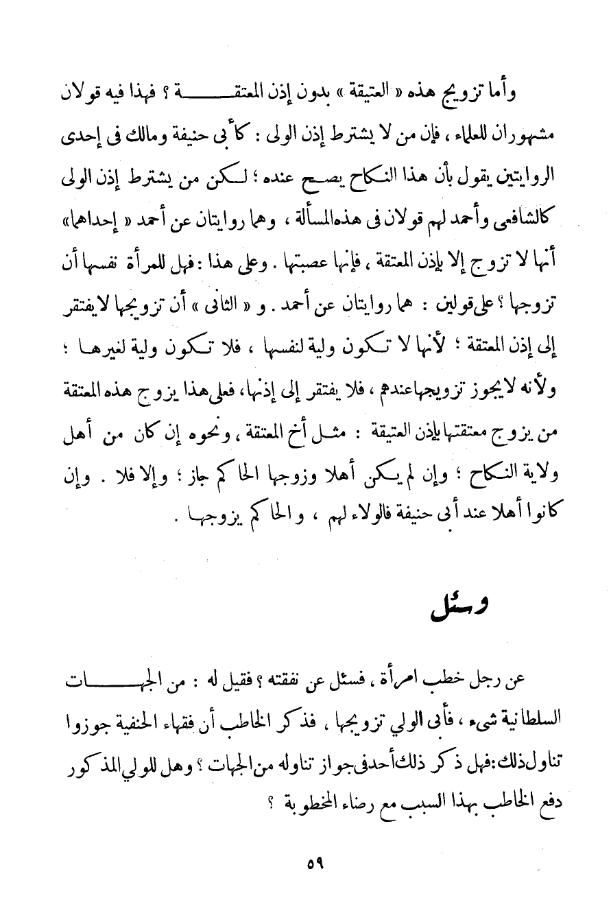 وَأَمَّا تَزْوِيجُ هَذِهِ " الْعَتِيقَةِ " بِدُونِ إذْنِ الْمُعْتِقَةِ؟ فَهَذَا فِيهِ قَوْلَانِ مَشْهُورَانِ لِلْعُلَمَاءِ فَإِنَّ مَنْ لَا يَشْتَرِطُ إذْنَ الْوَلِيِّ: كَأَبِي حَنِيفَةَ وَمَالِكٍ فِي إحْدَى الرِّوَايَتَيْنِ يَقُولُ بِأَنَّ هَذَا النِّكَاحَ يَصِحُّ عِنْدَهُ؛ لَكِنْ مَنْ يَشْتَرِطُ إذْنَ الْوَلِيِّ كَالشَّافِعِيِّ وَأَحْمَد لَهُمْ قَوْلَانِ فِي هَذِهِ الْمَسْأَلَةِ وَهُمَا رِوَايَتَانِ عَنْ أَحْمَد " إحْدَاهُمَا " أَنَّهَا لَا تُزَوَّجُ إلَّا بِإِذْنِ الْمُعْتِقَةِ فَإِنَّهَا عَصَبَتُهَا. وَعَلَى هَذَا: فَهَلْ لِلْمَرْأَةِ نَفْسِهَا أَنْ تُزَوِّجَهَا؟ عَلَى قَوْلَيْنِ: هُمَا رِوَايَتَانِ عَنْ أَحْمَد. و " الثَّانِي " أَنَّ تَزْوِيجَهَا لَا يَفْتَقِرُ إلَى إذْنِ الْمُعْتِقَةِ؛ لِأَنَّهَا لَا تَكُونُ وَلِيَّةً لِنَفْسِهَا فَلَا تَكُونُ وَلِيَّةً لِغَيْرِهَا؛ وَلِأَنَّهُ لَا يَجُوزُ تَزَوُّجُهَا عِنْدَهُمْ فَلَا يَفْتَقِرُ إلَى إذْنِهَا فَعَلَى هَذَا يُزَوِّجُ هَذِهِ الْمُعْتِقَةِ مَنْ يُزَوِّجُ مُعْتَقِهَا بِإِذْنِ الْعَتِيقَةِ: مِثْلُ أَخ الْمُعْتِقَةِ وَنَحْوِهِ إنْ كَانَ مِنْ أَهْلِ وِلَايَةِ النِّكَاحِ؛ وَإِنْ لَمْ يَكُنْ أَهْلًا وَزَوَّجَهَا الْحَاكِمُ جَازَ؛ وَإِلَّا فَلَا. وَإِنْ كَانُوا أَهْلًا عِنْدَ أَبِي حَنِيفَةَ فَالْوَلَاءُ لَهُمْ وَالْحَاكِمُ يُزَوِّجُهَا.