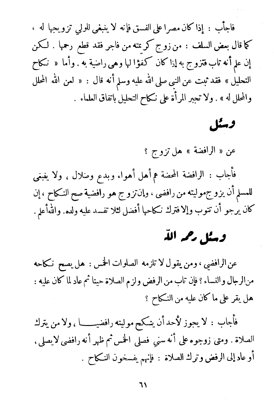 الرَّافِضَةُ الْمَحْضَةُ هُمْ أَهْلُ أَهْوَاءٍ وَبِدَعٍ وَضَلَالٍ وَلَا يَنْبَغِي لِلْمُسْلِمِ أَنْ يُزَوِّجَ مُوَلِّيَتَهُ مِنْ رافضي وَإِنْ تَزَوَّجَ هُوَ رافضية صَحَّ النِّكَاحُ إنْ كَانَ يَرْجُو أَنْ تَتُوبَ وَإِلَّا فَتَرْكُ نِكَاحِهَا أَفْضَلُ لِئَلَّا تُفْسِدَ عَلَيْهِ وَلَدَهُ. وَاَللَّهُ أَعْلَمُ.