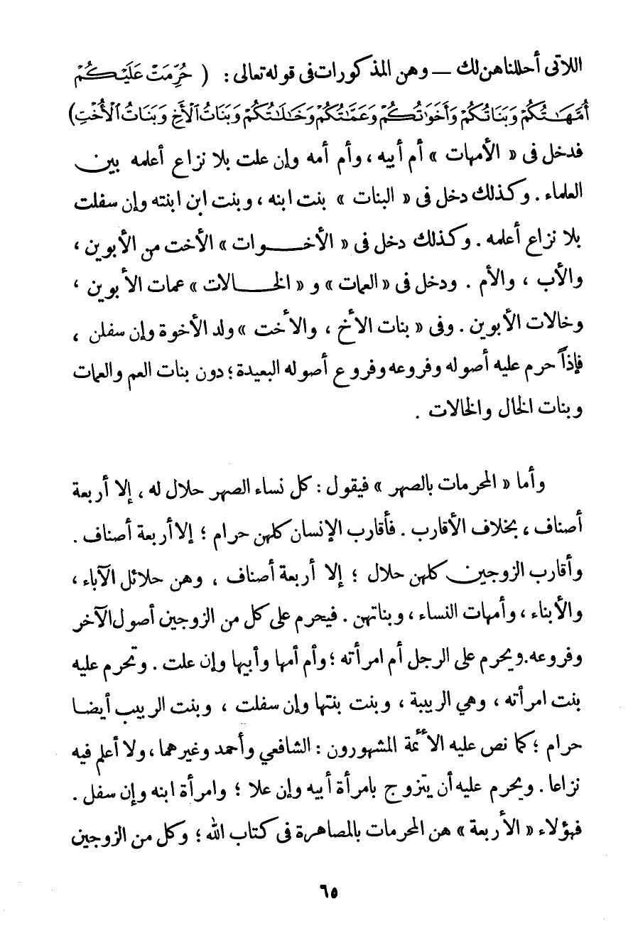 اللَّاتِي أَحْلَلْنَاهُنَّ لَك وَهُنَّ الْمَذْكُورَاتُ فِي قَوْله تَعَالَى {حُرِّمَتْ عَلَيْكُمْ أُمَّهَاتُكُمْ وَبَنَاتُكُمْ وَأَخَوَاتُكُمْ وَعَمَّاتُكُمْ وَخَالَاتُكُمْ وَبَنَاتُ الْأَخِ وَبَنَاتُ الْأُخْتِ} فَدَخَلَ فِي " الْأُمَّهَاتِ " أُمُّ أَبِيهِ وَأُمُّ أُمِّهِ وَإِنْ عَلَتْ بِلَا نِزَاعٍ أَعْلَمُهُ بَيْنَ الْعُلَمَاءِ. وَكَذَلِكَ دَخَلَ فِي " الْبَنَاتِ " بِنْتُ ابْنِهِ وَبِنْتُ ابْنِ ابْنَتِهِ وَإِنْ سَفَلَتْ بِلَا نِزَاعٍ أَعْلَمُهُ. وَكَذَلِكَ دَخَلَ فِي " الْأَخَوَاتِ " الْأُخْتُ مِنْ الْأَبَوَيْنِ وَالْأَبُ وَالْأُمِّ. وَدَخَلَ فِي " الْعَمَّاتِ " و " الْخَالَاتِ " عَمَّاتُ الْأَبَوَيْنِ وَخَالَاتُ الْأَبَوَيْنِ. وَفِي " بَنَاتِ الْأَخِ وَالْأُخْتِ " وَلَدُ الْإِخْوَةِ وَإِنْ سَفُلْنَ فَإِذَا حَرُمَ عَلَيْهِ أُصُولُهُ وَفُرُوعُهُ وَفُرُوعُ أُصُولِهِ الْبَعِيدَةِ؛ دُونَ بَنَاتِ الْعَمِّ وَالْعَمَّاتِ وَبَنَاتِ الْخَالِ وَالْخَالَاتِ. وَأَمَّا " الْمُحَرَّمَاتُ بِالصِّهْرِ " فَيَقُولُ: كُلُّ نِسَاءِ الصِّهْرِ حَلَالٌ لَهُ إلَّا أَرْبَعَةُ أَصْنَافٍ بِخِلَافِ الْأَقَارِبِ. فَأَقَارِبُ الْإِنْسَانِ كُلُّهُنَّ حَرَامٌ؛ إلَّا أَرْبَعَةُ أَصْنَافٍ. وَأُقَارِبُ الزَّوْجَيْنِ كُلُّهُنَّ حَلَالٌ؛ إلَّا أَرْبَعَةُ أَصْنَافٍ وَهُنَّ حَلَائِلُ الْآبَاءِ وَالْأَبْنَاءِ وَأُمَّهَاتُ النِّسَاءِ وَبَنَاتُهُنَّ. فَيَحْرُمُ عَلَى كُلٍّ مِنْ الزَّوْجَيْنِ أُصُولُ الْآخَرِ وَفُرُوعُهُ. وَيَحْرُمُ عَلَى الرَّجُلِ أُمُّ امْرَأَتِهِ؛ وَأُمُّ أُمِّهَا وَأَبِيهَا وَإِنْ عَلَتْ. وَتَحْرُمُ عَلَيْهِ بِنْتُ امْرَأَتِهِ وَهِيَ الرَّبِيبَةُ وَبِنْتُ بِنْتِهَا وَإِنْ سَفَلَتْ وَبِنْتُ الرَّبِيبِ أَيْضًا حَرَامٌ؛ كَمَا نَصَّ عَلَيْهِ الْأَئِمَّةُ الْمَشْهُورُونَ: الشَّافِعِيُّ وَأَحْمَد وَغَيْرُهُمَا وَلَا أَعْلَمُ فِيهِ نِزَاعًا. وَيَحْرُمُ عَلَيْهِ أَنْ يَتَزَوَّجَ بِامْرَأَةِ أَبِيهِ وَإِنْ عَلَا؛ وَامْرَأَةِ ابْنِهِ وَإِنْ سَفَلَ. فَهَؤُلَاءِ " الْأَرْبَعَةُ " هُنَّ الْمُحَرَّمَاتُ بِالْمُصَاهَرَةِ فِي كِتَابِ اللَّهِ؛ وَكُلٌّ مِنْ الزَّوْجَيْنِ
