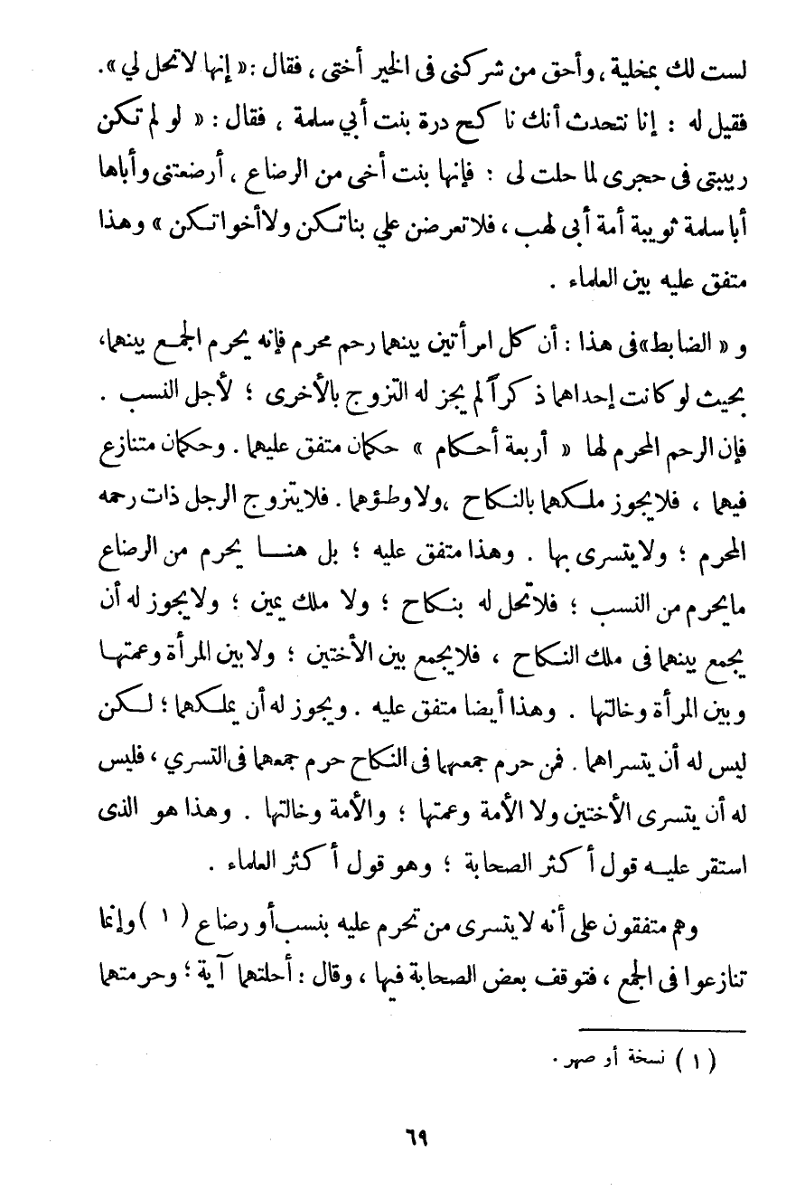 لَسْت لَك بِمُخَلِّيَةِ وَأَحَقُّ مَنْ شَرِكَنِي فِي الْخَيْرِ أُخْتِي فَقَالَ: إنَّهَا لَا تَحِلُّ لِي. فَقِيلَ لَهُ: إنَّا نَتَحَدَّثُ أَنَّك نَاكِحٌ دُرَّةَ بِنْتَ أَبِي سَلَمَةَ فَقَالَ: لَوْ لَمْ تَكُنْ رَبِيبَتِي فِي حِجْرِي لَمَا حَلَّتْ لِي. فَإِنَّهَا بِنْتُ أَخِي مِنْ الرِّضَاعِ أَرْضَعَتْنِي وَأَبَاهَا أَبَا سَلَمَةَ ثويبة أَمَةُ أَبِي لَهَبٍ فَلَا تَعْرِضُنَّ عَلَيَّ بَنَاتِكُنَّ وَلَا أَخَوَاتِكُنَّ} وَهَذَا مُتَّفَقٌ عَلَيْهِ بَيْنَ الْعُلَمَاءِ.