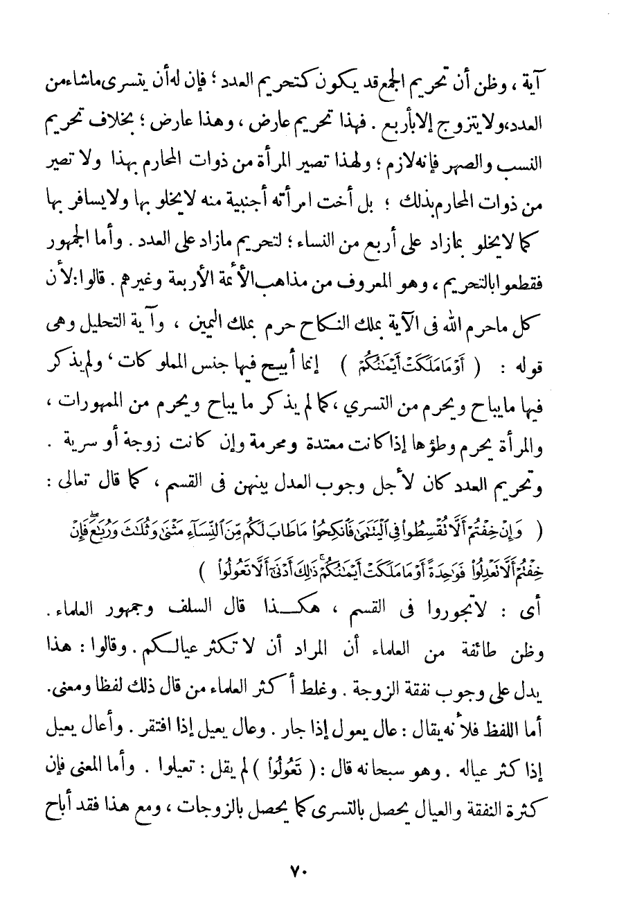 آيَةٌ وَظَنَّ أَنَّ تَحْرِيمَ الْجَمْعِ قَدْ يَكُونُ كَتَحْرِيمِ الْعَدَدِ؛ فَإِنَّ لَهُ أَنْ يَتَسَرَّى مَا شَاءَ مِنْ الْعَدَدِ وَلَا يَتَزَوَّجُ إلَّا بِأَرْبَعِ. فَهَذَا تَحْرِيمٌ عَارِضٌ وَهَذَا عَارِضٌ بِخِلَافِ تَحْرِيمِ النَّسَبِ وَالصِّهْرِ فَإِنَّهُ لَازِمٌ؛ وَلِهَذَا تَصِيرُ الْمَرْأَةُ مِنْ ذَوَاتِ الْمَحَارِمِ بِهَذَا وَلَا تَصِيرُ مِنْ ذَوَاتِ الْمَحَارِمِ بِذَلِكَ؛ بَلْ أُخْتُ امْرَأَتِهِ أَجْنَبِيَّةً مِنْهُ لَا يَخْلُو بِهَا وَلَا يُسَافِرُ بِهَا كَمَا لَا يَخْلُو بِمَا زَادَ عَلَى أَرْبَعٍ مِنْ النِّسَاءِ؛ لِتَحْرِيمِ مَا زَادَ عَلَى الْعَدَدِ. وَأَمَّا الْجُمْهُورُ فَقَطَعُوا بِالتَّحْرِيمِ وَهُوَ الْمَعْرُوفُ مِنْ مَذَاهِبِ الْأَئِمَّةِ الْأَرْبَعَةِ وَغَيْرِهِمْ. قَالُوا: لِأَنَّ كُلَّ مَا حَرَّمَ اللَّهُ فِي الْآيَةِ بِمِلْكِ النِّكَاحِ حَرَّمَ بِمِلْكِ الْيَمِينِ وَآيَةُ التَّحْلِيلِ وَهِيَ قَوْلُهُ: {أَوْ مَا مَلَكَتْ أَيْمَانُكُمْ} إنَّمَا أُبِيحَ فِيهَا جِنْسُ الْمَمْلُوكَاتِ وَلَمْ يُذْكَرْ فِيهَا مَا يُبَاحُ وَيَحْرُمُ مِنْ التَّسَرِّي كَمَا لَمْ يُذْكَرْ مَا يُبَاحُ وَيَحْرُمُ مِنْ الْمَمْهُورَاتِ وَالْمَرْأَةُ يَحْرُمُ وَطْؤُهَا إذَا كَانَتْ مُعْتَدَّةً وَمُحْرِمَةً وَإِنْ كَانَتْ زَوْجَةً أَوْ سُرِّيَّةً. وَتَحْرِيمُ الْعَدَدِ كَانَ لِأَجْلِ وُجُوبِ الْعَدْلِ بَيْنَهُنَّ فِي الْقِسْمِ كَمَا قَالَ تَعَالَى: {وَإِنْ خِفْتُمْ أَلَّا تُقْسِطُوا فِي الْيَتَامَى فَانْكِحُوا مَا طَابَ لَكُمْ مِنَ النِّسَاءِ مَثْنَى وَثُلَاثَ وَرُبَاعَ فَإِنْ خِفْتُمْ أَلَّا تَعْدِلُوا فَوَاحِدَةً أَوْ مَا مَلَكَتْ أَيْمَانُكُمْ ذَلِكَ أَدْنَى أَلَّا تَعُولُوا} أَيْ: لَا تَجُورُوا فِي الْقَسْمِ هَكَذَا قَالَ السَّلَفُ وَجُمْهُورُ الْعُلَمَاءِ. وَظَنَّ طَائِفَةٌ مِنْ الْعُلَمَاءِ أَنَّ الْمُرَادَ أَنْ لَا تَكْثُرَ عِيَالُكُمْ. وَقَالُوا: هَذَا يَدُلُّ عَلَى وُجُوبِ نَفَقَةِ الزَّوْجَةِ. وَغَلِطَ أَكْثَرُ الْعُلَمَاءِ مَنْ قَالَ ذَلِكَ لَفْظًا وَمَعْنًى. أَمَّا اللَّفْظُ فَلِأَنَّهُ يُقَالُ: عَالَ يَعُولُ إذَا جَارَ. وَعَالَ يُعِيلُ إذَا افْتَقَرَ. وَأَعَالَ يُعِيلُ إذَا كَثُرَ عِيَالُهُ. وَهُوَ سُبْحَانَهُ قَالَ: {تَعُولُوا} لَمْ يَقُلْ: تُعِيلُوا. وَأَمَّا الْمَعْنَى فَإِنَّ كَثْرَةَ النَّفَقَةِ وَالْعِيَالِ يَحْصُلُ بِالتَّسَرِّي كَمَا يَحْصُلُ بِالزَّوْجَاتِ وَمَعَ هَذَا فَقَدَ أَبَاحَ