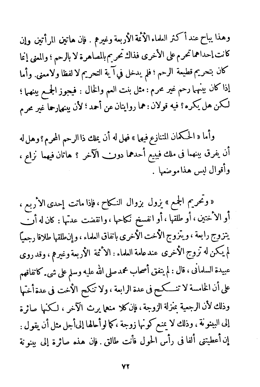 وَهَذَا يُبَاحُ عِنْدَ أَكْثَرِ الْعُلَمَاءِ الْأَئِمَّةِ الْأَرْبَعَةِ وَغَيْرِهِمْ. فَإِنَّ هَاتَيْنِ الْمَرْأَتَيْنِ وَإِنْ كَانَتْ إحْدَاهُمَا تَحْرُمُ عَلَى الْأُخْرَى فَذَاكَ تَحْرِيمٌ بِالْمُصَاهَرَةِ لَا بِالرَّحِمِ؛ وَالْمَعْنَى إنَّمَا كَانَ بِتَحْرِيمِ قَطِيعَةِ الرَّحِمِ؛ فَلَمْ يَدْخُلْ فِي آيَةِ التَّحْرِيمِ لَا لَفْظًا وَلَا مَعْنًى. وَأَمَّا إذَا كَانَ بَيْنَهُمَا رَحِمٌ غَيْرُ مُحَرَّمٍ: مِثْلَ بِنْتِ الْعَمِّ وَالْخَالِ: فَيَجُوزُ الْجَمْعُ بَيْنَهُمَا؛ لَكِنْ هَلْ يُكْرَهُ؟ فِيهِ قَوْلَانِ: هُمَا رِوَايَتَانِ عَنْ أَحْمَد؛ لِأَنَّ بَيْنَهُمَا رَحِمًا غَيْرَ مُحَرَّمٍ وَأَمَّا " الْحُكْمَانِ الْمُتَنَازَعُ فِيهِمَا " فَهَلْ لَهُ أَنْ يَمْلِكَ ذَا الرَّحِمِ الْمُحَرَّمِ؟ وَهَلْ لَهُ أَنْ يُفَرِّقَ بَيْنَهُمَا فِي مِلْكٍ فَيَبِيعُ أَحَدَهُمَا دُونَ الْآخَرِ؟ هَاتَانِ فِيهِمَا نِزَاعٌ وَأَقْوَالٌ لَيْسَ هَذَا مَوْضِعَهَا. " وَتَحْرِيمُ الْجَمْعِ " يَزُولُ بِزَوَالِ النِّكَاحِ فَإِذَا مَاتَتْ إحْدَى الْأَرْبَعِ أَوْ الْأُخْتَيْنِ أَوْ طَلَّقَهَا أَوْ انْفَسَخَ نِكَاحُهَا وَانْقَضَتْ عِدَّتُهَا: كَانَ لَهُ أَنْ يَتَزَوَّجَ رَابِعَةً وَيَتَزَوَّجَ الْأُخْتَ الْأُخْرَى بِاتِّفَاقِ الْعُلَمَاءِ وَإِنْ طَلَّقَهَا طَلَاقًا رَجْعِيًّا لَمْ يَكُنْ لَهُ تَزَوُّجُ الْأُخْرَى عِنْدَ عَامَّةِ الْعُلَمَاءِ. الْأَئِمَّةِ الْأَرْبَعَةِ وَغَيْرِهِمْ وَقَدْ رَوَى عبيدة السلماني قَالَ: لَمْ يَتَّفِقْ أَصْحَابُ مُحَمَّدٍ صَلَّى اللَّهُ عَلَيْهِ وَسَلَّمَ عَلَى شَيْءٍ كَاتِّفَاقِهِمْ عَلَى أَنَّ الْخَامِسَةَ لَا تُنْكَحُ فِي عِدَّةِ الرَّابِعَةِ وَلَا تُنْكَحُ الْأُخْتُ فِي عِدَّةِ أُخْتِهَا وَذَلِكَ لِأَنَّ الرَّجْعِيَّةَ بِمَنْزِلَةِ الزَّوْجَةِ فَإِنَّ كُلًّا مِنْهُمَا يَرِثُ الْآخَرَ لَكِنَّهَا صَائِرَةٌ إلَى الْبَيْنُونَةِ وَذَلِكَ لَا يَمْنَعُ كَوْنَهَا زَوْجَةً كَمَا لَوْ أَحَالَهَا إلَى أَجَلٍ مِثْلَ أَنْ يَقُولَ: إنْ أَعْطَيْتِنِي أَلْفًا فِي رَأْسِ الْحَوْلِ فَأَنْتِ طَالِقٌ. فَإِنَّ هَذِهِ صَائِرَةٌ إلَى بَيْنُونَةٍ