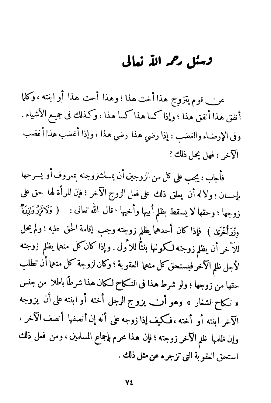 يَجِبُ عَلَى كُلٍّ مِنْ الزَّوْجَيْنِ أَنْ يُمْسِكَ زَوْجَتَهُ بِمَعْرُوفِ أَوْ يُسَرِّحَهَا بِإِحْسَانِ؛ وَلَا لَهُ أَنْ يُعَلِّقَ ذَلِكَ عَلَى فِعْلِ الزَّوْجِ الْآخَرِ. فَإِنَّ الْمَرْأَةَ لَهَا حَقٌّ عَلَى زَوْجِهَا؛ وَحَقُّهَا لَا يَسْقُطُ بِظُلْمِ أَبِيهَا وَأَخِيهَا قَالَ اللَّهُ تَعَالَى: {وَلَا تَزِرُ وَازِرَةٌ وِزْرَ أُخْرَى} فَإِذَا كَانَ أَحَدُهُمَا يَظْلِمُ زَوْجَتَهُ وَجَبَ إقَامَةُ الْحَقِّ عَلَيْهِ؛ وَلَمْ يَحِلَّ لِلْآخَرِ أَنْ يَظْلِمَ زَوْجَتَهُ لِكَوْنِهَا بِنْتًا لِلْأَوَّلِ. وَإِذَا كَانَ كُلٌّ مِنْهُمَا يَظْلِمُ زَوْجَتَهُ لِأَجْلِ ظُلْمِ الْآخَرِ فَيَسْتَحِقُّ كُلٌّ مِنْهُمَا الْعُقُوبَةَ؛ وَكَانَ لِزَوْجَةِ كُلٍّ مِنْهُمَا أَنْ تَطْلُبَ حَقَّهَا مِنْ زَوْجِهَا؛ وَلَوْ شَرَطَ هَذَا فِي النِّكَاحِ لَكَانَ هَذَا شَرْطًا بَاطِلًا مِنْ جِنْسِ " نِكَاحِ الشَّغَارِ " وَهُوَ أَنْ يُزَوِّجَ الرَّجُلُ أُخْتَهُ أَوْ ابْنَتَهُ عَلَى أَنْ يُزَوِّجَهُ الْآخَرُ ابْنَتَهُ أَوْ أُخْتَه فَكَيْفَ إذَا زَوَّجَهُ عَلَى أَنَّهُ إنْ أَنْصَفَهَا أَنْصَفَ الْآخَرُ وَإِنْ ظَلَمَهَا ظَلَمَ الْآخَرُ زَوْجَتَهُ؛ فَإِنَّ هَذَا مُحَرَّمٌ بِإِجْمَاعِ الْمُسْلِمِينَ وَمَنْ فَعَلَ ذَلِكَ اسْتَحَقَّ الْعُقُوبَةَ الَّتِي تَزْجُرُهُ عَنْ مِثْلِ ذَلِكَ.