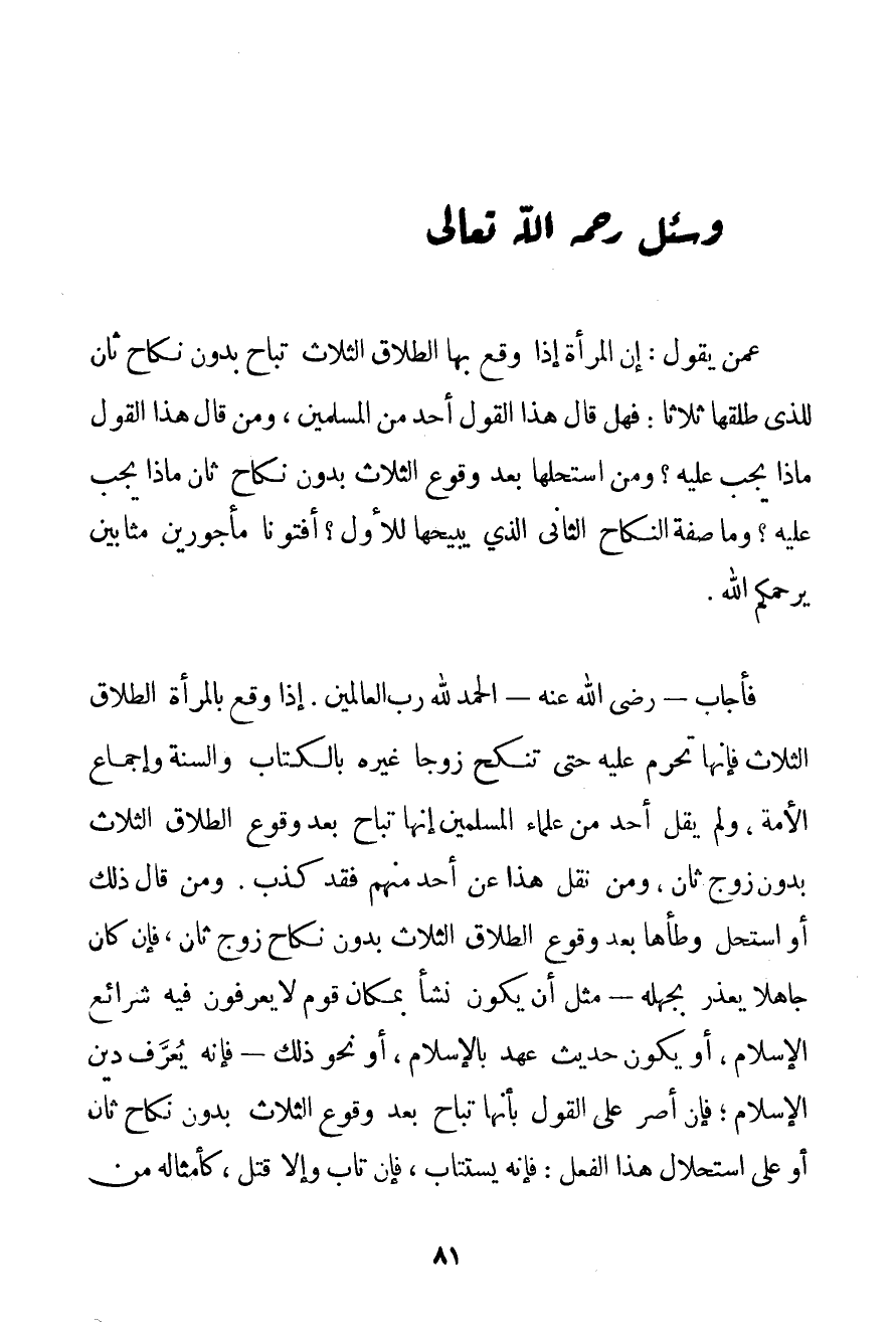 الْحَمْدُ لِلَّهِ رَبِّ الْعَالَمِينَ، إذَا وَقَعَ بِالْمَرْأَةِ الطَّلَاقُ الثَّلَاثُ فَإِنَّهَا تَحْرُمُ عَلَيْهِ حَتَّى تَنْكِحَ زَوْجًا غَيْرَهُ بِالْكِتَابِ وَالسُّنَّةِ وَإِجْمَاعِ الْأُمَّةِ وَلَمْ يَقُلْ أَحَدٌ مِنْ عُلَمَاءِ الْمُسْلِمِينَ إنَّهَا تُبَاحُ بَعْدَ وُقُوعِ الطَّلَاقِ الثَّلَاثِ بِدُونِ زَوْجٍ ثَانٍ وَمَنْ نَقَلَ هَذَا عَنْ أَحَدٍ مِنْهُمْ فَقَدْ كَذَبَ. وَمَنْ قَالَ ذَلِكَ أَوْ اسْتَحَلَّ وَطْأَهَا بَعْدَ وُقُوعِ الطَّلَاقِ الثَّلَاثِ بِدُونِ نِكَاحِ زَوْجٍ ثَانٍ فَإِنْ كَانَ جَاهِلًا يُعْذَرُ بِجَهْلِهِ - مِثْلَ أَنْ يَكُونَ نَشَأَ بِمَكَانِ قَوْمٍ لَا يَعْرِفُونَ فِيهِ شَرَائِعَ الْإِسْلَامِ أَوْ يَكُونَ حَدِيثَ عَهْدٍ بِالْإِسْلَامِ أَوْ نَحْوَ ذَلِكَ - فَإِنَّهُ يُعَرَّفُ دِينَ الْإِسْلَامِ؛ فَإِنْ أَصَرَّ عَلَى الْقَوْلِ بِأَنَّهَا تُبَاحُ بَعْدَ وُقُوعِ الثَّلَاثِ بِدُونِ نِكَاحٍ ثَانٍ أَوْ عَلَى اسْتِحْلَالِ هَذَا الْفِعْلِ: فَإِنَّهُ يُسْتَتَابُ فَإِنْ تَابَ وَإِلَّا قُتِلَ كَأَمْثَالِهِ مِنْ