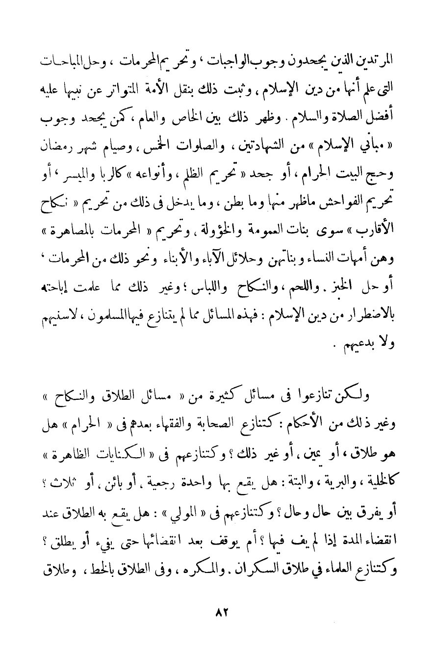 الْمُرْتَدِّينَ الَّذِينَ يَجْحَدُونَ وُجُوبَ الْوَاجِبَاتِ وَتَحْرِيمَ الْمُحَرَّمَاتِ وَحِلَّ الْمُبَاحَاتِ الَّتِي عُلِمَ أَنَّهَا مِنْ دِينِ الْإِسْلَامِ وَثَبَتَ ذَلِكَ بِنَقْلِ الْأُمَّةِ الْمُتَوَاتِرِ عَنْ نَبِيِّهَا عَلَيْهِ أَفْضَلُ الصَّلَاةُ وَالسَّلَامُ. وَظَهَرَ ذَلِكَ بَيْنَ الْخَاصِّ وَالْعَامِّ كَمَنْ يَجْحَدُ وُجُوبَ " مَبَانِي الْإِسْلَامِ " مِنْ الشَّهَادَتَيْنِ وَالصَّلَوَاتِ الْخَمْسِ وَصِيَامِ شَهْرِ رَمَضَانَ وَحِجِّ الْبَيْتِ الْحَرَامِ أَوْ جَحَدَ " تَحْرِيمَ الظُّلْمِ وَأَنْوَاعِهِ " كَالرِّبَا وَالْمَيْسِرِ أَوْ تَحْرِيمَ الْفَوَاحِشِ مَا ظَهَرَ مِنْهَا وَمَا بَطَنَ وَمَا يَدْخُلُ فِي ذَلِكَ مِنْ تَحْرِيمِ " نِكَاحِ الْأَقَارِبِ " سِوَى بَنَاتِ الْعُمُومَةِ وَالْخُؤُولَةِ وَتَحْرِيمَ " الْمُحَرَّمَاتِ بِالْمُصَاهَرَةِ " وَهُنَّ أُمَّهَاتُ النِّسَاءِ وَبَنَاتُهُنَّ وَحَلَائِلُ الْآبَاءِ وَالْأَبْنَاءِ وَنَحْوُ ذَلِكَ مِنْ الْمُحَرَّمَاتِ أَوْ حِلَّ الْخُبْزِ. وَاللَّحْمِ وَالنِّكَاحِ وَاللِّبَاسِ؛ وَغَيْرِ ذَلِكَ مِمَّا عُلِمَتْ إبَاحَتُهُ بِالِاضْطِرَارِ مِنْ دِينِ الْإِسْلَامِ: فَهَذِهِ الْمَسَائِلُ مِمَّا لَمْ يَتَنَازَعْ فِيهَا الْمُسْلِمُونَ لَا سُنِّيُّهُمْ وَلَا بِدْعِيُّهُمْ. وَلَكِنْ تَنَازَعُوا فِي مَسَائِلَ كَثِيرَةٍ مِنْ " مَسَائِلِ الطَّلَاقِ وَالنِّكَاحِ " وَغَيْرِ ذَلِكَ مِنْ الْأَحْكَامِ: كَتَنَازُعِ الصَّحَابَةِ وَالْفُقَهَاءِ بَعْدَهُمْ فِي " الْحَرَامِ " هَلْ هُوَ طَلَاقٌ أَوْ يَمِينٌ أَوْ غَيْرُ ذَلِكَ؟ وَكَتَنَازُعِهِمْ فِي " الْكِنَايَاتِ الظَّاهِرَةِ " كَالْخَلِيَّةِ وَالْبَرِيَّةِ وَالْبَتَّةِ: هَلْ يَقَعُ بِهَا وَاحِدَةٌ رَجْعِيَّةٌ أَوْ بَائِنٌ أَوْ ثَلَاثٌ؟ أَوْ يُفَرَّقُ بَيْنَ حَالٍ وَحَالٍ؟ وَكَتَنَازُعِهِمْ فِي " الْمُولِي ": هَلْ يَقَعُ بِهِ الطَّلَاقُ عِنْدَ انْقِضَاءِ الْمُدَّةِ إذَا لَمْ يَفِ فِيهَا؟ أَمْ يُوقَفُ بَعْدَ انْقِضَائِهَا حَتَّى يَفِيءَ أَوْ يُطَلِّقَ؟ وَكَتَنَازُعِ الْعُلَمَاءِ فِي طَلَاقِ السَّكْرَانِ. وَالْمُكْرَهُ وَفِي الطَّلَاقِ بِالْخَطِّ وَطَلَاقِ