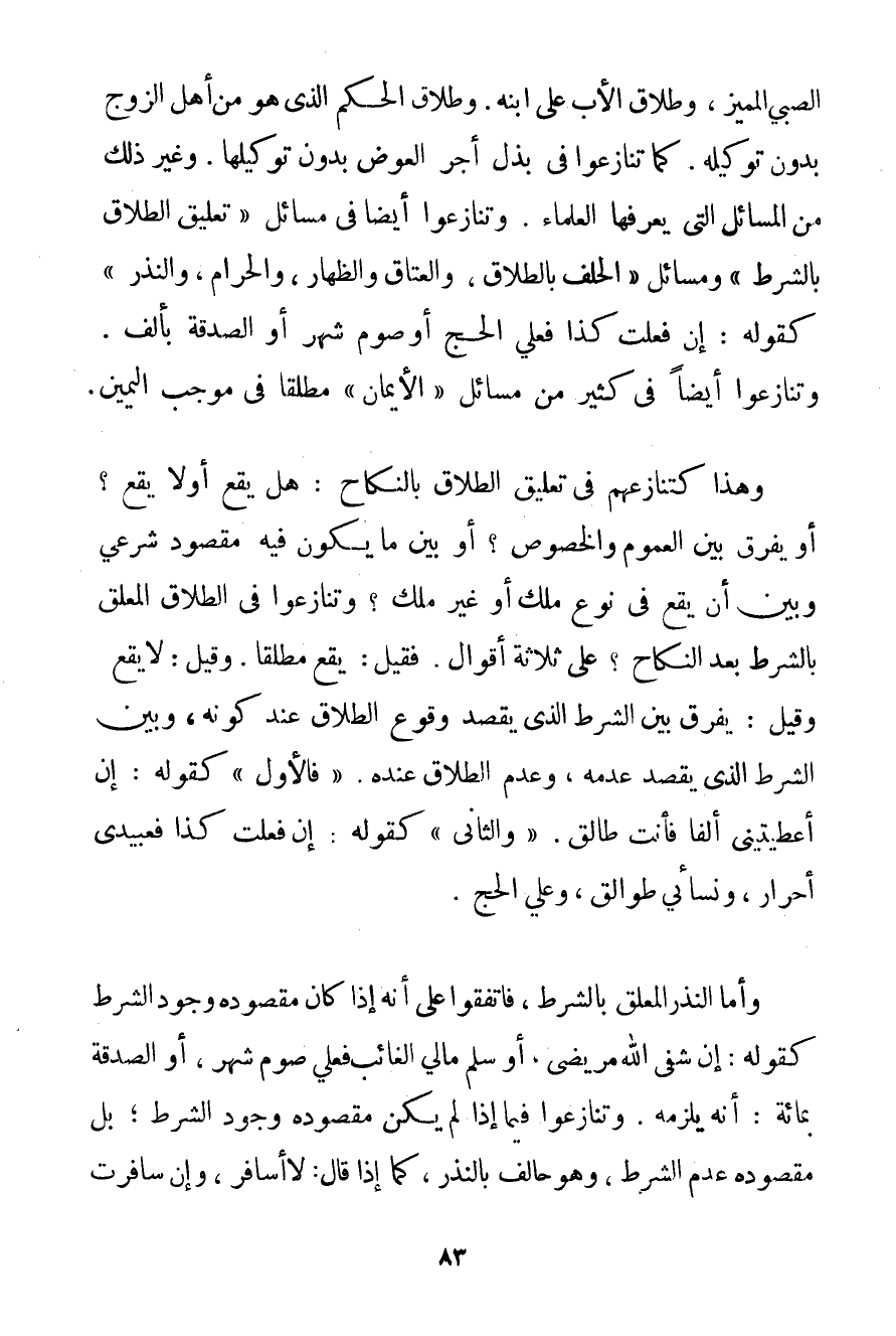 الصَّبِيِّ الْمُمَيِّزِ وَطَلَاقِ الْأَبِ عَلَى ابْنِهِ وَطَلَاقِ الْحَكَمِ الَّذِي هُوَ مِنْ أَهْلِ الزَّوْجِ بِدُونِ تَوْكِيلِهِ. كَمَا تَنَازَعُوا فِي بَذْلِ أَجْرِ الْعِوَضِ بِدُونِ تَوْكِيلِهَا. وَغَيْرِ ذَلِكَ مِنْ الْمَسَائِلِ الَّتِي يَعْرِفُهَا الْعُلَمَاءُ. وَتَنَازَعُوا أَيْضًا فِي مَسَائِلِ " تَعْلِيقِ الطَّلَاقِ بِالشَّرْطِ " وَمَسَائِلِ " الْحَلِفِ بِالطَّلَاقِ وَالْعَتَاقِ وَالظِّهَارِ وَالْحَرَامِ وَالنَّذْرِ " كَقَوْلِهِ: إنْ فَعَلْت كَذَا فَعَلَيَّ الْحَجُّ أَوْ صَوْمُ شَهْرٍ أَوْ الصَّدَقَةُ بِأَلْفِ. وَتَنَازَعُوا أَيْضًا فِي كَثِيرٍ مِنْ مَسَائِلِ " الْأَيْمَانِ " مُطْلَقًا فِي مُوجَبِ الْيَمِينِ وَهَذَا كَتَنَازُعِهِمْ فِي تَعْلِيقِ الطَّلَاقِ بِالنِّكَاحِ: هَلْ يَقَعُ أَوْ لَا يَقَعُ؟ أَوْ يُفَرَّقُ بَيْنَ الْعُمُومِ وَالْخُصُوصِ؟ أَوْ بَيْنَ مَا يَكُونُ فِيهِ مَقْصُودٌ شَرْعِيٌّ وَبَيْنَ أَنْ يَقَعَ فِي نَوْعِ مِلْكٍ أَوْ غَيْرِ مِلْكٍ؟ وَتَنَازَعُوا فِي الطَّلَاقِ الْمُعَلَّقِ بِالشَّرْطِ بَعْدَ النِّكَاحِ؟ عَلَى ثَلَاثَةِ أَقْوَالٍ. فَقِيلَ: يَقَعُ مُطْلَقًا. وَقِيلَ: لَا يَقَعُ. وَقِيلَ: يُفَرَّقُ بَيْنَ الشَّرْطِ الَّذِي يُقْصَدُ وُقُوعُ الطَّلَاقِ عِنْدَ كَوْنِهِ وَبَيْنَ الشَّرْطِ الَّذِي يُقْصَدُ عَدَمُهُ. وَعَدَمُ الطَّلَاقِ عِنْدَهُ. " فَالْأَوَّلُ " كَقَوْلِهِ: إنْ أعطيتيني أَلْفًا فَأَنْتِ طَالِقٌ. " وَالثَّانِي " كَقَوْلِهِ: إنْ فَعَلْت كَذَا فَعَبِيدِي أَحْرَارٌ وَنِسَائِي طَوَالِقُ وَعَلَيَّ الْحَجُّ. وَأَمَّا النَّذْرُ الْمُعَلَّقُ بِالشَّرْطِ فَاتَّفَقُوا عَلَى أَنَّهُ إذَا كَانَ مَقْصُودُهُ وُجُودَ الشَّرْطِ كَقَوْلِهِ: إنْ شَفَى اللَّهُ مَرِيضِي أَوْ سَلَّمَ مَالِي الْغَائِبَ فَعَلَيَّ صَوْمُ شَهْرٍ أَوْ الصَّدَقَةُ بِمِائَةِ: أَنَّهُ يَلْزَمُهُ. وَتَنَازَعُوا فِيمَا إذَا لَمْ يَكُنْ مَقْصُودُهُ وُجُودَ الشَّرْطِ؛ بَلْ مَقْصُودُهُ عَدَمُ الشَّرْطِ وَهُوَ حَالِفٌ بِالنَّذْرِ كَمَا إذَا قَالَ: لَا أُسَافِرُ وَإِنْ سَافَرْت