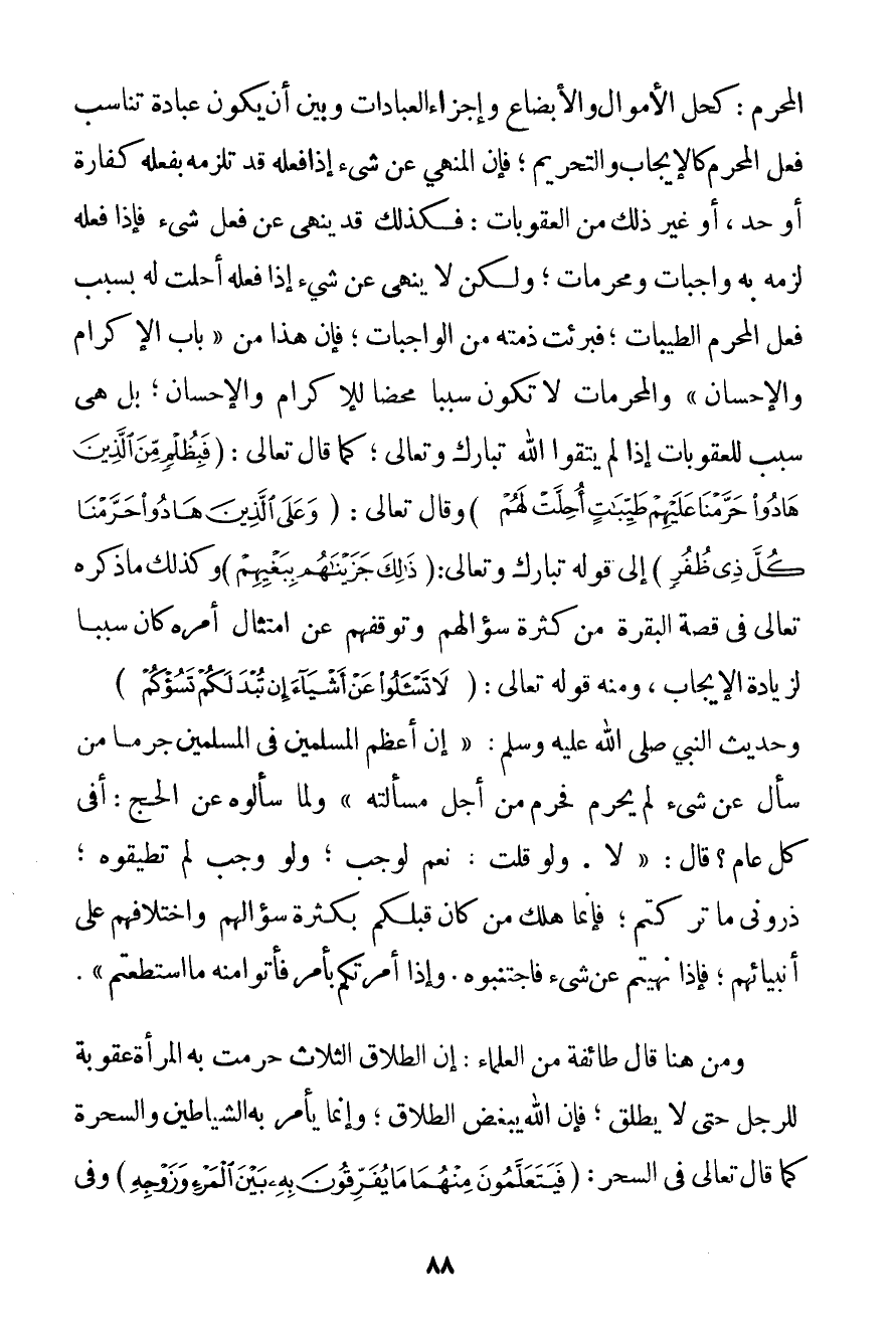 الْمُحَرَّمِ: كَحِلِّ الْأَمْوَالِ وَالْإِبْضَاعِ وَإِجْزَاءِ الْعِبَادَاتِ وَبَيْنَ أَنْ يَكُونَ عِبَادَةً تُنَاسِبُ فِعْلَ الْمُحَرَّمِ كَالْإِيجَابِ وَالتَّحْرِيمِ؛ فَإِنَّ الْمَنْهِيَّ عَنْ شَيْءٍ إذَا فَعَلَهُ قَدْ تَلْزَمُهُ بِفِعْلِهِ كَفَّارَةٌ أَوْ حَدٌّ أَوْ غَيْرُ ذَلِكَ مِنْ الْعُقُوبَاتِ: فَكَذَلِكَ قَدْ يُنْهَى عَنْ فِعْلِ شَيْءٍ فَإِذَا فَعَلَهُ لَزِمَهُ بِهِ وَاجِبَاتٌ وَمُحَرَّمَاتٌ؛ وَلَكِنْ لَا يُنْهَى عَنْ شَيْءٍ إذَا فَعَلَهُ أُحِلَّتْ لَهُ بِسَبَبِ فِعْلِ الْمُحَرَّمِ الطَّيِّبَاتُ؛ فَبَرِئَتْ ذِمَّتُهُ مِنْ الْوَاجِبَاتِ؛ فَإِنَّ هَذَا مِنْ " بَابِ الْإِكْرَامِ وَالْإِحْسَانِ " وَالْمُحَرَّمَاتُ لَا تَكُونُ سَبَبًا مَحْضًا لِلْإِكْرَامِ وَالْإِحْسَانِ؛ بَلْ هِيَ سَبَبٌ لِلْعُقُوبَاتِ إذَا لَمْ يَتَّقُوا اللَّهَ تَبَارَكَ وَتَعَالَى. كَمَا قَالَ تَعَالَى: {فَبِظُلْمٍ مِنَ الَّذِينَ هَادُوا حَرَّمْنَا عَلَيْهِمْ طَيِّبَاتٍ أُحِلَّتْ لَهُمْ} وَقَالَ تَعَالَى: {وَعَلَى الَّذِينَ هَادُوا حَرَّمْنَا كُلَّ ذِي ظُفُرٍ} إلَى قَوْلِهِ تَبَارَكَ وَتَعَالَى: {ذَلِكَ جَزَيْنَاهُمْ بِبَغْيِهِمْ} وَكَذَلِكَ مَا ذَكَرَهُ تَعَالَى فِي قِصَّةِ الْبَقَرَةِ مِنْ كَثْرَةِ سُؤَالِهِمْ وَتَوَقُّفِهِمْ عَنْ امْتِثَالِ أَمْرِهِ كَانَ سَبَبًا لِزِيَادَةِ الْإِيجَابِ وَمِنْهُ قَوْله تَعَالَى {لَا تَسْأَلُوا عَنْ أَشْيَاءَ إنْ تُبْدَ لَكُمْ تَسُؤْكُمْ} وَحَدِيثُ النَّبِيِّ صَلَّى اللَّهُ عَلَيْهِ وَسَلَّمَ {إنَّ أَعْظَمَ الْمُسْلِمِينَ فِي الْمُسْلِمِينَ جُرْمًا مَنْ سَأَلَ عَنْ شَيْءٍ لَمْ يُحَرَّمْ فَحُرِّمَ مِنْ أَجْلِ مَسْأَلَتِهِ} وَلَمَّا {سَأَلُوهُ عَنْ الْحَجِّ: أَفِي كُلِّ عَامٍ؟ قَالَ: لَا. وَلَوْ قُلْت: نَعَمْ لَوَجَبَ؛ وَلَوْ وَجَبَ لَمْ تُطِيقُوهُ؛ ذَرُونِي مَا تَرَكْتُمْ؛ فَإِنَّمَا هَلَكَ مَنْ كَانَ قَبْلَكُمْ بِكَثْرَةِ سُؤَالِهِمْ وَاخْتِلَافِهِمْ عَلَى أَنْبِيَائِهِمْ؛ فَإِذَا نُهِيتُمْ عَنْ شَيْءٍ فَاجْتَنِبُوهُ. وَإِذَا أَمَرْتُكُمْ بِأَمْرِ فَأْتُوا مِنْهُ مَا اسْتَطَعْتُمْ} . وَمِنْ هُنَا قَالَ طَائِفَةٌ مِنْ الْعُلَمَاءِ: إنَّ الطَّلَاقَ الثَّلَاثَ حَرُمَتْ بِهِ الْمَرْأَةُ عُقُوبَةً لِلرَّجُلِ حَتَّى لَا يُطَلِّقَ؛ فَإِنَّ اللَّهَ يُبْغِضُ الطَّلَاقَ؛ وَإِنَّمَا يَأْمُرُ بِهِ الشَّيَاطِينُ وَالسَّحَرَةُ كَمَا قَالَ تَعَالَى فِي السِّحْرِ: {فَيَتَعَلَّمُونَ مِنْهُمَا مَا يُفَرِّقُونَ بِهِ بَيْنَ الْمَرْءِ وَزَوْجِهِ} وَفِي