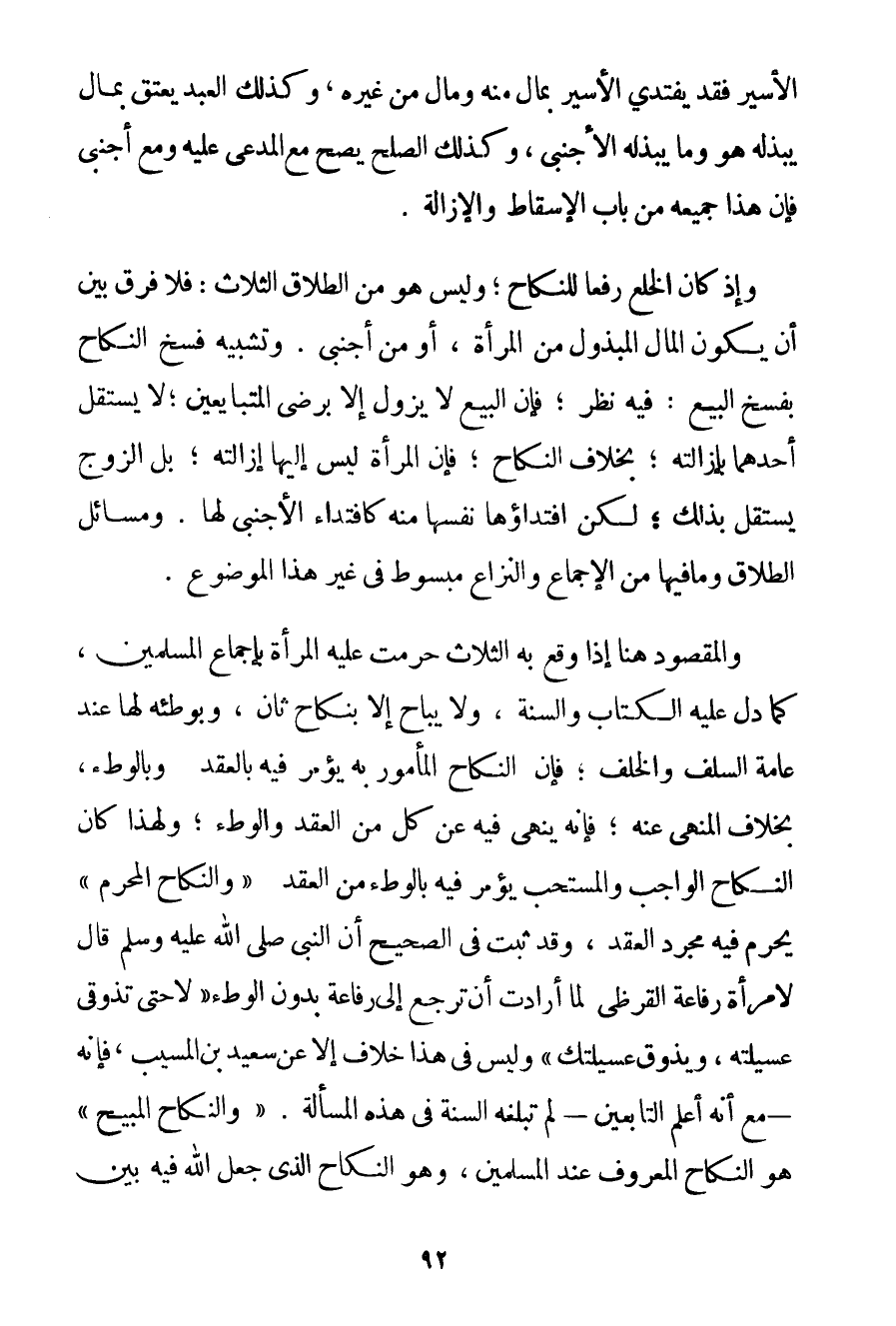 الْأَسِيرُ فَقَدْ يَفْتَدِي الْأَسِيرُ بِمَالِ مِنْهُ وَمَالٍ مِنْ غَيْرِهِ وَكَذَلِكَ الْعَبْدُ يَعْتِقُ بِمَالِ يَبْذُلُهُ هُوَ وَمَا يَبْذُلُهُ الْأَجْنَبِيُّ وَكَذَلِكَ الصُّلْحُ يَصِحُّ مَعَ الْمُدَّعَى عَلَيْهِ وَمَعَ أَجْنَبِيٍّ فَإِنَّ هَذَا جَمِيعَهُ مِنْ بَابِ الْإِسْقَاطِ وَالْإِزَالَةِ. وَإِذْ كَانَ الْخُلْعُ رَفْعًا لِلنِّكَاحِ؛ وَلَيْسَ هُوَ مِنْ الطَّلَاقِ الثَّلَاثِ: فَلَا فَرْقَ بَيْنَ أَنْ يَكُونَ الْمَالُ الْمَبْذُولُ مِنْ الْمَرْأَةِ أَوْ مِنْ أَجْنَبِيٍّ. وَتَشْبِيهُ فَسْخِ النِّكَاحِ بِفَسْخِ الْبَيْعِ: فِيهِ نَظَرٌ؛ فَإِنَّ الْبَيْعَ لَا يَزُولُ إلَّا بِرِضَى الْمُتَابِعَيْنِ؛ لَا يَسْتَقِلُّ أَحَدُهُمَا بِإِزَالَتِهِ؛ بِخِلَافِ النِّكَاحِ؛ فَإِنَّ الْمَرْأَةَ لَيْسَ إلَيْهَا إزَالَتُهُ؛ بَلْ الزَّوْجُ يَسْتَقِلُّ بِذَلِكَ؛ لَكِنْ افْتِدَاؤُهَا نَفْسَهَا مِنْهُ كَافْتِدَاءِ الْأَجْنَبِيِّ لَهَا. وَمَسَائِلُ الطَّلَاقِ وَمَا فِيهَا مِنْ الْإِجْمَاعِ وَالنِّزَاعِ مَبْسُوطٌ فِي غَيْرِ هَذَا الْمَوْضُوعِ. وَالْمَقْصُودُ هُنَا إذَا وَقَعَ بِهِ الثَّلَاثُ حَرُمَتْ عَلَيْهِ الْمَرْأَةُ بِإِجْمَاعِ الْمُسْلِمِينَ كَمَا دَلَّ عَلَيْهِ الْكِتَابُ وَالسُّنَّةُ وَلَا يُبَاحُ إلَّا بِنِكَاحِ ثَانٍ وَبِوَطْئِهِ لَهَا عِنْدَ عَامَّةِ السَّلَفِ وَالْخَلَفِ؛ فَإِنَّ النِّكَاحَ الْمَأْمُورَ بِهِ يُؤْمَرُ فِيهِ بِالْعَقْدِ. وَبِالْوَطْءِ بِخِلَافِ الْمَنْهِيِّ عَنْهُ؛ فَإِنَّهُ يُنْهَى فِيهِ عَنْ كُلٍّ مِنْ الْعَقْدِ وَالْوَطْءِ؛ وَلِهَذَا كَانَ النِّكَاحُ الْوَاجِبُ وَالْمُسْتَحَبُّ يُؤْمَرُ فِيهِ بِالْوَطْءِ مِنْ الْعَقْدِ " وَالنِّكَاحُ الْمُحَرَّمُ " يَحْرُمُ فِيهِ مُجَرَّدُ الْعَقْدِ. وَقَدْ ثَبَتَ فِي الصَّحِيحِ {أَنَّ النَّبِيَّ صَلَّى اللَّهُ عَلَيْهِ وَسَلَّمَ قَالَ لِامْرَأَةِ رِفَاعَةَ القرظي. لَمَّا أَرَادَتْ أَنْ تَرْجِعَ إلَى رِفَاعَةَ بِدُونِ الْوَطْءِ لَا حَتَّى تَذُوقِي عُسَيْلَتَهُ وَيَذُوقَ عُسَيْلَتَك} وَلَيْسَ فِي هَذَا خِلَافٌ إلَّا عَنْ سَعِيدِ بْنِ الْمُسَيِّبِ فَإِنَّهُ - مَعَ أَنَّهُ أَعْلَمُ التَّابِعِينَ - لَمْ تَبْلُغْهُ السُّنَّةُ فِي هَذِهِ الْمَسْأَلَةِ. " وَالنِّكَاحُ الْمُبِيحُ " هُوَ النِّكَاحُ الْمَعْرُوفُ عِنْدَ الْمُسْلِمِينَ وَهُوَ النِّكَاحُ الَّذِي جَعَلَ اللَّهُ فِيهِ بَيْنَ