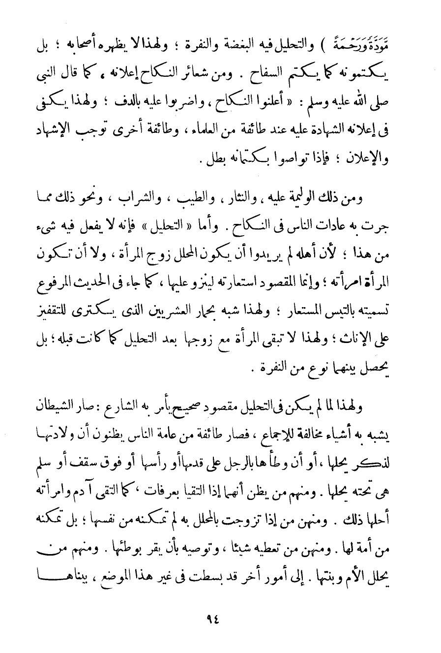 مَوَدَّةً وَرَحْمَةً} وَالتَّحْلِيلُ فِيهِ الْبِغْضَة وَالنُّفْرَةُ؛ وَلِهَذَا لَا يُظْهِرُهُ أَصْحَابُهُ؛ بَلْ يَكْتُمُونَهُ كَمَا يُكْتَمُ السِّفَاحُ. وَمِنْ شَعَائِرِ النِّكَاحِ إعْلَانُهُ كَمَا قَالَ النَّبِيُّ صَلَّى اللَّهُ عَلَيْهِ وَسَلَّمَ {أَعْلِنُوا النِّكَاحَ وَاضْرِبُوا عَلَيْهِ بِالدُّفِّ} وَلِهَذَا يَكْفِي فِي إعْلَانِهِ الشَّهَادَةُ عَلَيْهِ عِنْدَ طَائِفَةٍ مِنْ الْعُلَمَاءِ وَطَائِفَةٌ أُخْرَى تُوجِبُ الْإِشْهَادَ وَالْإِعْلَانَ؛ فَإِذَا تَوَاصَوْا بِكِتْمَانِهِ بَطَلَ. وَمِنْ ذَلِكَ الْوَلِيمَةُ عَلَيْهِ وَالنِّثَارُ وَالطِّيبُ وَالشَّرَابُ وَنَحْوُ ذَلِكَ مِمَّا جَرَتْ بِهِ عَادَاتُ النَّاسِ فِي النِّكَاحِ. وَأَمَّا " التَّحْلِيلُ " فَإِنَّهُ لَا يُفْعَلُ فِيهِ شَيْءٌ مِنْ هَذَا؛ لِأَنَّ أَهْلَهُ لَمْ يُرِيدُوا أَنْ يَكُونَ الْمُحَلِّلُ زَوْجَ الْمَرْأَةِ وَلَا أَنْ تَكُونَ الْمَرْأَةُ امْرَأَتَهُ؛ وَإِنَّمَا الْمَقْصُودُ اسْتِعَارَتُهُ لِيَنْزُوَ عَلَيْهَا كَمَا جَاءَ فِي الْحَدِيثِ الْمَرْفُوعِ تَسْمِيَتُهُ بِالتَّيْسِ الْمُسْتَعَارِ؛ وَلِهَذَا شُبِّهَ بِحِمَارِ الْعَشْرِيَّيْنِ الَّذِي يُكْتَرَى للتقفيز عَلَى الْإِنَاثِ؛ وَلِهَذَا لَا تَبْقَى الْمَرْأَةُ مَعَ زَوْجِهَا بَعْدَ التَّحْلِيلِ كَمَا كَانَتْ قَبْلَهُ؛ بَلْ يَحْصُلُ بَيْنَهُمَا نَوْعٌ مِنْ النُّفْرَةِ. وَلِهَذَا لَمَّا لَمْ يَكُنْ فِي التَّحْلِيلِ مَقْصُودٌ صَحِيحٌ يَأْمُرُ بِهِ الشَّارِعَ: صَارَ الشَّيْطَانُ يُشَبِّهُ بِهِ أَشْيَاءَ مُخَالِفَةً لِلْإِجْمَاعِ فَصَارَ طَائِفَةٌ مِنْ عَامَّةِ النَّاسِ يَظُنُّونَ أَنَّ وِلَادَتَهَا لِذَكَرِ يُحِلُّهَا أَوْ أَنَّ وَطْأَهَا بِالرِّجْلِ عَلَى قَدَمِهَا أَوْ رَأْسِهَا أَوْ فَوْقَ سَقْفٍ أَوْ سُلَّمٍ هِيَ تَحْتَهُ يُحِلُّهَا. وَمِنْهُمْ مَنْ يَظُنُّ أَنَّهُمَا إذَا الْتَقَيَا بِعَرَفَاتِ كَمَا الْتَقَى آدَمَ وَامْرَأَتُهُ أَحَلَّهَا ذَلِكَ. وَمِنْهُنَّ مَنْ إذَا تَزَوَّجَتْ بِالْمُحَلِّلِ بِهِ لَمْ تُمَكِّنْهُ مِنْ نَفْسِهَا؛ بَلْ تُمَكِّنُهُ مِنْ أَمَةٍ لَهَا. وَمِنْهُنَّ مَنْ تُعْطِيهِ شَيْئًا وَتُوصِيه بِأَنْ يُقِرَّ بِوَطْئِهَا. وَمِنْهُمْ مَنْ يُحَلِّلُ الْأُمَّ وَبِنْتَهَا. إلَى أُمُورٍ أُخَرَ قَدْ بُسِطَتْ فِي غَيْرِ هَذَا الْمَوْضِعِ بَيَّنَّاهَا