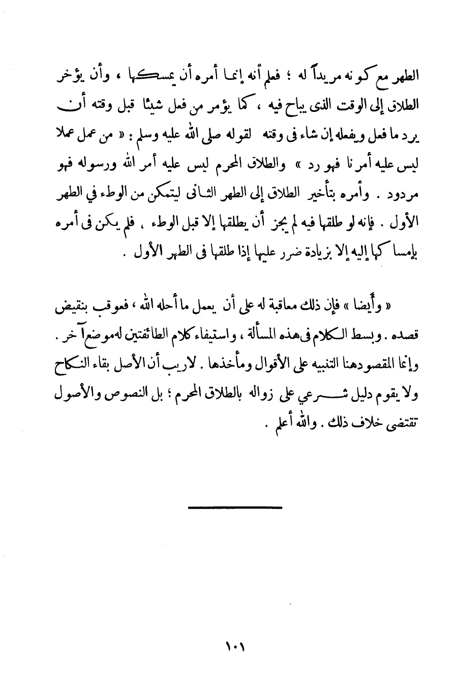 الطُّهْرِ مَعَ كَوْنِهِ مُرِيدًا لَهُ؛ فَعُلِمَ أَنَّهُ إنَّمَا أَمَرَهُ أَنْ يَمْسَحَهَا وَأَنْ يُؤَخِّرَ الطَّلَاقَ إلَى الْوَقْتِ الَّذِي يُبَاحُ فِيهِ كَمَا يُؤْمَرُ مَنْ فَعَلَ شَيْئًا قَبْلَ وَقْتِهِ أَنْ يَرُدَّ مَا فَعَلَ وَيَفْعَلَهُ إنْ شَاءَ فِي وَقْتِهِ. لِقَوْلِهِ صَلَّى اللَّهُ عَلَيْهِ وَسَلَّمَ {مَنْ عَمِلَ عَمَلًا لَيْسَ عَلَيْهِ أَمْرُنَا فَهُوَ رَدٌّ} وَالطَّلَاقُ الْمُحَرَّمُ لَيْسَ عَلَيْهِ أَمْرُ اللَّهِ وَرَسُولِهِ فَهُوَ مَرْدُودٌ. وَأَمَرَهُ بِتَأْخِيرِ الطَّلَاقِ إلَى الطُّهْرِ الثَّانِي لِيَتَمَكَّنَ مِنْ الْوَطْءِ فِي الطُّهْرِ الْأَوَّلِ فَإِنَّهُ لَوْ طَلَّقَهَا فِيهِ لَمْ يَجُزْ أَنْ يُطَلِّقَهَا إلَّا قَبْلَ الْوَطْءِ فَلَمْ يَكُنْ فِي أَمْرِهِ بِإِمْسَاكِهَا إلَيْهِ إلَّا بِزِيَادَةِ ضَرَرٍ عَلَيْهَا إذَا طَلَّقَهَا فِي الطُّهْرِ الْأَوَّلِ. " وَأَيْضًا " فَإِنَّ ذَلِكَ مُعَاقَبَةٌ لَهُ عَلَى أَنْ يَعْمَلَ مَا أَحَلَّهُ اللَّهُ فَعُوقِبَ بِنَقِيضِ قَصْدِهِ. وَبُسِطَ الْكَلَامُ فِي هَذِهِ الْمَسْأَلَةِ وَاسْتِيفَاءُ كَلَامِ الطَّائِفَتَيْنِ لَهُ مَوْضِعٌ آخَرُ. وَإِنَّمَا الْمَقْصُودُ هُنَا التَّنْبِيهُ عَلَى الْأَقْوَالِ وَمَأْخَذُهَا. لَا رَيْبَ أَنَّ الْأَصْلَ بَقَاءُ النِّكَاحِ وَلَا يَقُومُ دَلِيلٌ شَرْعِيٌّ عَلَى زَوَالِهِ بِالطَّلَاقِ الْمُحَرَّمِ؛ بَلْ النُّصُوصُ وَالْأُصُولُ تَقْتَضِي خِلَافَ ذَلِكَ. وَاَللَّهُ أَعْلَمُ.