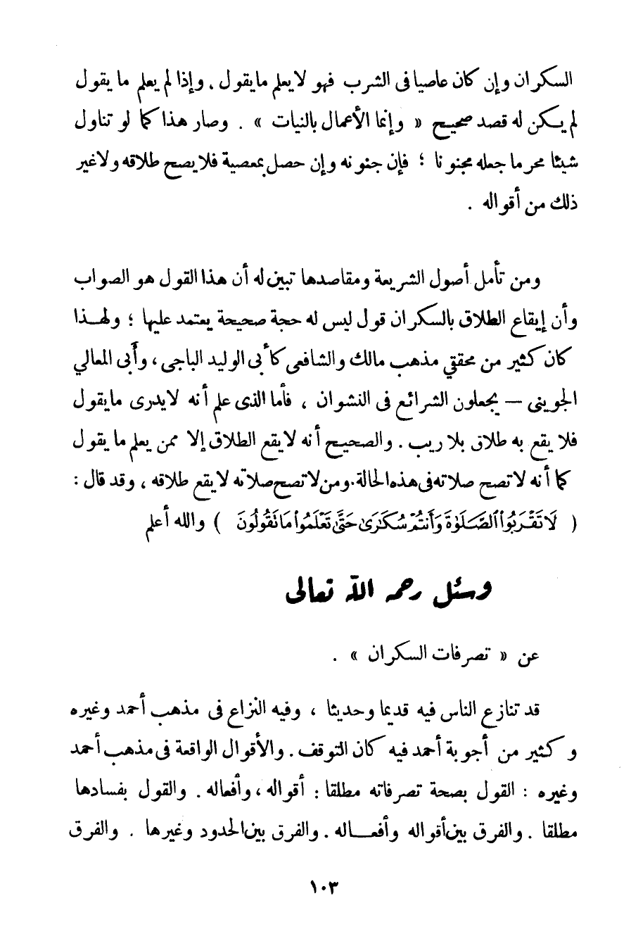 السَّكْرَانَ وَإِنْ كَانَ عَاصِيًا فِي الشُّرْبِ فَهُوَ لَا يَعْلَمُ مَا يَقُولُ وَإِذَا لَمْ يَعْلَمْ مَا يَقُولُ لَمْ يَكُنْ لَهُ قَصْدٌ صَحِيحٌ {وَإِنَّمَا الْأَعْمَالُ بِالنِّيَّاتِ} . وَصَارَ هَذَا كَمَا لَوْ تَنَاوَلَ شَيْئًا مُحَرَّمًا جَعَلَهُ مَجْنُونًا؛ فَإِنَّ جُنُونَهُ وَإِنْ حَصَلَ بِمَعْصِيَةِ فَلَا يَصِحُّ طَلَاقُهُ وَلَا غَيْرُ ذَلِكَ مِنْ أَقْوَالِهِ. وَمَنْ تَأَمَّلَ أُصُولَ الشَّرِيعَةِ وَمَقَاصِدَهَا تَبَيَّنَ لَهُ أَنَّ هَذَا الْقَوْلَ هُوَ الصَّوَابُ وَأَنَّ إيقَاعَ الطَّلَاقِ بِالسَّكْرَانِ قَوْلٌ لَيْسَ لَهُ حُجَّةٌ صَحِيحَةٌ يَعْتَمِدُ عَلَيْهَا؛ وَلِهَذَا كَانَ كَثِيرٌ مِنْ مُحَقِّقِي مَذْهَبِ مَالِكٍ وَالشَّافِعِيِّ كَأَبِي الْوَلِيدِ الباجي وَأَبِي الْمَعَالِي الجُوَيْنِي - يَجْعَلُونَ الشَّرَائِعَ فِي النَّشْوَانِ فَأَمَّا الَّذِي عُلِمَ أَنَّهُ لَا يَدْرِي مَا يَقُولُ فَلَا يَقَعُ بِهِ طَلَاقٌ بِلَا رَيْبٍ. وَالصَّحِيحُ أَنَّهُ لَا يَقَعُ الطَّلَاقُ إلَّا مِمَّنْ يَعْلَمُ مَا يَقُولُ كَمَا أَنَّهُ لَا تَصِحُّ صِلَاتُهُ فِي هَذِهِ الْحَالَةِ وَمَنْ لَا تَصِحُّ صِلَاتُهُ لَا يَقَعُ طَلَاقُهُ وَقَدْ قَالَ: {لَا تَقْرَبُوا الصَّلَاةَ وَأَنْتُمْ سُكَارَى حَتَّى تَعْلَمُوا مَا تَقُولُونَ} وَاَللَّهُ أَعْلَمُ.