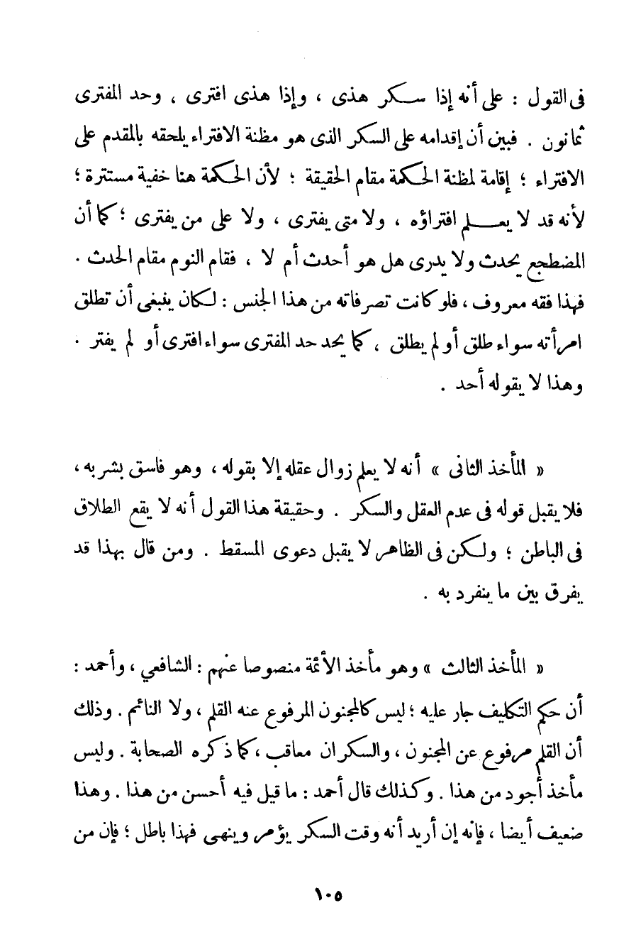فِي الْقَوْلِ: عَلَى أَنَّهُ إذَا سَكِرَ هَذَى وَإِذَا هَذَى افْتَرَى وَحَدُّ الْمُفْتَرِي ثَمَانُونَ. فَبَيَّنَ أَنَّ إقْدَامَهُ عَلَى السُّكْرِ الَّذِي هُوَ مَظِنَّةُ الِافْتِرَاءِ يَلْحَقُهُ بِالْمُقْدِمِ عَلَى الِافْتِرَاءِ؛ إقَامَةً لِمَظِنَّةِ الْحِكْمَةِ مَقَامَ الْحَقِيقَةِ؛ لِأَنَّ الْحِكْمَةَ هُنَا خَفِيَّةٌ مُسْتَتِرَةٌ؛ لِأَنَّهُ قَدْ لَا يُعْلَمُ افْتِرَاؤُهُ وَلَا مَتَى يَفْتَرِي وَلَا عَلَى مَنْ يَفْتَرِي؛ كَمَا أَنَّ الْمُضْطَجِعَ يُحْدِثُ وَلَا يَدْرِي هَلْ هُوَ أَحْدَثَ أَمْ لَا فَقَامَ النَّوْمُ مَقَامَ الْحَدَثِ. فَهَذَا فِقْهٌ مَعْرُوفٌ فَلَوْ كَانَتْ تَصَرُّفَاتُهُ مِنْ هَذَا الْجِنْسِ: لَكَانَ يَنْبَغِي أَنْ تَطْلُقَ امْرَأَتُهُ سَوَاءٌ طَلَّقَ أَوْ لَمْ يُطَلِّقْ كَمَا يُحَدُّ حَدَّ الْمُفْتَرِي سَوَاءٌ افْتَرَى أَوْ لَمْ يَفْتَرِ. وَهَذَا لَا يَقُولُهُ أَحَدٌ. " الْمَأْخَذُ الثَّانِي " أَنَّهُ لَا يَعْلَمُ زَوَالَ عَقْلِهِ إلَّا بِقَوْلِهِ وَهُوَ فَاسِقٌ بِشُرْبِهِ فَلَا يُقْبَلُ قَوْلُهُ فِي عَدَمِ الْعَقْلِ وَالسُّكْرِ. وَحَقِيقَةُ هَذَا الْقَوْلِ أَنَّهُ لَا يَقَعُ الطَّلَاقُ فِي الْبَاطِنِ؛ وَلَكِنْ فِي الظَّاهِرِ لَا يَقْبَلُ دَعْوَى الْمُسْقِطِ. وَمَنْ قَالَ بِهَذَا قَدْ يُفَرِّقُ بَيْنَ مَا يَنْفَرِدُ بِهِ. " الْمَأْخَذُ الثَّالِثُ " وَهُوَ مَأْخَذُ الْأَئِمَّةِ مَنْصُوصًا عَنْهُمْ: الشَّافِعِيُّ وَأَحْمَد: أَنَّ حُكْمَ التَّكْلِيفِ جَارٍ عَلَيْهِ؛ لَيْسَ كَالْمَجْنُونِ الْمَرْفُوعِ عَنْهُ الْقَلَمُ وَلَا النَّائِمِ. وَذَلِكَ أَنَّ الْقَلَمَ مَرْفُوعٌ عَنْ الْمَجْنُونِ وَالسَّكْرَانُ مُعَاقِبٌ كَمَا ذَكَرَهُ الصَّحَابَةُ. وَلَيْسَ مَأْخَذٌ أَجْوَدَ مِنْ هَذَا. وَكَذَلِكَ قَالَ أَحْمَد: مَا قِيلَ فِيهِ أَحْسَنُ مِنْ هَذَا. وَهَذَا ضَعِيفٌ أَيْضًا فَإِنَّهُ إنْ أُرِيدَ أَنَّهُ وَقْتَ السُّكْرِ يُؤْمَرُ وَيُنْهَى فَهَذَا بَاطِلٌ؛ فَإِنَّ مَنْ