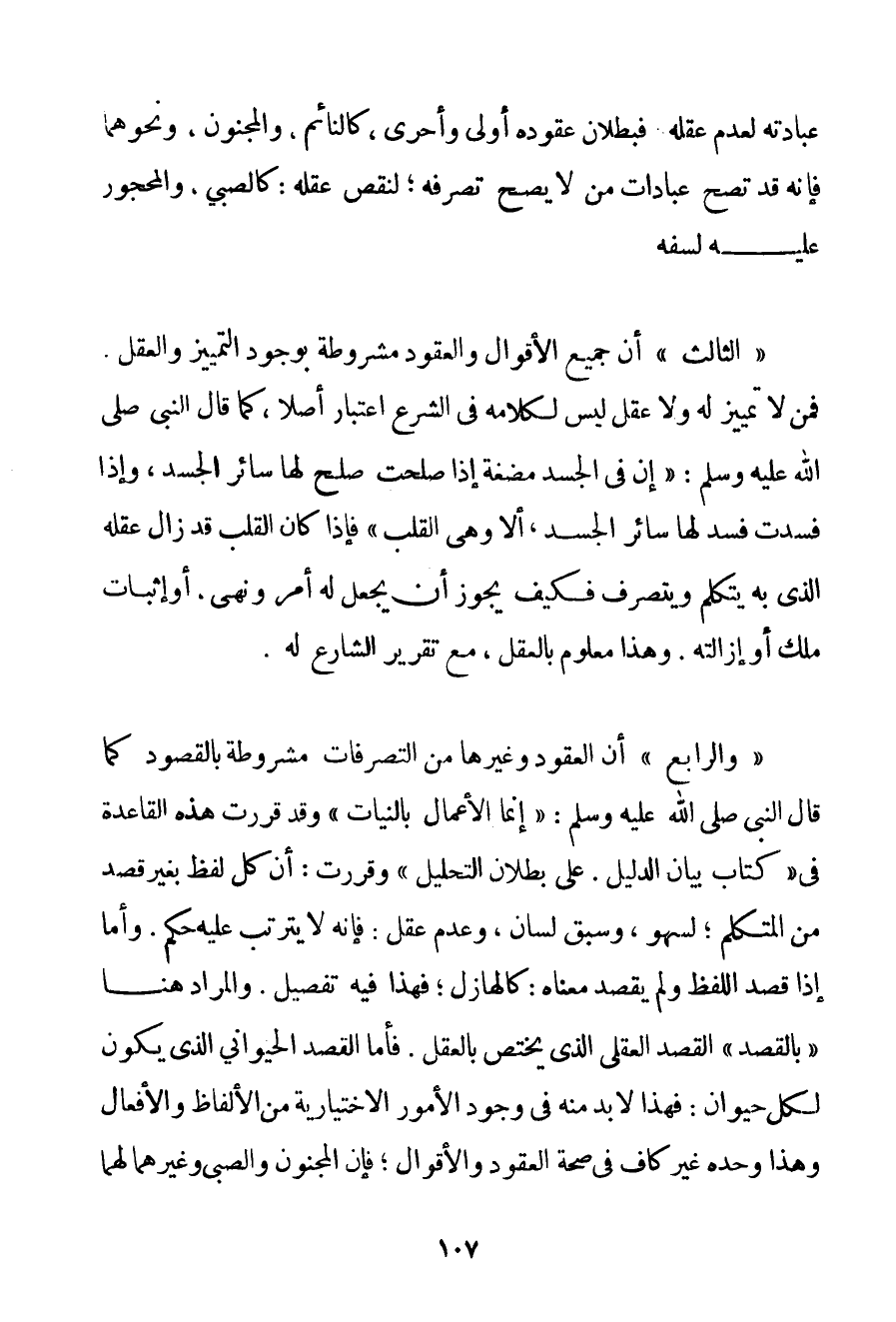 عِبَادَتُهُ لِعَدَمِ عَقْلِهِ فَبُطْلَانُ عُقُودِهِ أَوْلَى وَأَحْرَى كَالنَّائِمِ وَالْمَجْنُونِ وَنَحْوِهِمَا فَإِنَّهُ قَدْ تَصِحُّ عِبَادَاتُ مَنْ لَا يَصِحُّ تَصَرُّفُهُ؛ لِنَقْصِ عَقْلِهِ: كَالصَّبِيِّ وَالْمَحْجُورِ عَلَيْهِ لِسَفَهِ. " الثَّالِثُ " أَنَّ جَمِيعَ الْأَقْوَالِ وَالْعُقُودِ مَشْرُوطَةٌ بِوُجُودِ التَّمْيِيزِ وَالْعَقْلِ. فَمَنْ لَا تَمْيِيزَ لَهُ وَلَا عَقْلَ لَيْسَ لِكَلَامِهِ فِي الشَّرْعِ اعْتِبَارٌ أَصْلًا كَمَا قَالَ النَّبِيُّ صَلَّى اللَّهُ عَلَيْهِ وَسَلَّمَ {إنَّ فِي الْجَسَدِ مُضْغَةً إذَا صَلَحَتْ صَلَحَ لَهَا سَائِرُ الْجَسَدِ وَإِذَا فَسَدَتْ فَسَدَ لَهَا سَائِرُ الْجَسَدِ أَلَا وَهِيَ الْقَلْبُ} فَإِذَا كَانَ الْقَلْبُ قَدْ زَالَ عَقْلُهُ الَّذِي بِهِ يَتَكَلَّمُ وَيَتَصَرَّفُ فَكَيْفَ يَجُوزُ أَنْ يُجْعَلَ لَهُ أَمْرٌ وَنَهْيٌ. أَوْ إثْبَاتُ مِلْكٍ أَوْ إزَالَتُهُ. وَهَذَا مَعْلُومٌ بِالْعَقْلِ مَعَ تَقْرِيرِ الشَّارِعِ لَهُ. " وَالرَّابِعُ " أَنَّ الْعُقُودَ وَغَيْرَهَا مِنْ التَّصَرُّفَاتِ مَشْرُوطَةٌ بالقصود. كَمَا قَالَ النَّبِيُّ صَلَّى اللَّهُ عَلَيْهِ وَسَلَّمَ {إنَّمَا الْأَعْمَالُ بِالنِّيَّاتِ} وَقَدْ قَرَّرَتْ هَذِهِ الْقَاعِدَةُ فِي " كِتَابِ بَيَانِ الدَّلِيلِ. عَلَى بُطْلَانِ التَّحْلِيلِ " وَقَرَّرَتْ: أَنَّ كُلَّ لَفْظٍ بِغَيْرِ قَصْدٍ مِنْ الْمُتَكَلِّمِ؛ لَسَهْوٌ وَسَبْقُ لِسَانٍ وَعَدَمُ عَقْلٍ: فَإِنَّهُ لَا يَتَرَتَّبُ عَلَيْهِ حُكْمٌ. وَأَمَّا إذَا قُصِدَ اللَّفْظُ وَلَمْ يُقْصَدْ مَعْنَاهُ: كَالْهَازِلِ؛ فَهَذَا فِيهِ تَفْصِيلٌ. وَالْمُرَادُ هُنَا " بِالْقَصْدِ " الْقَصْدُ الْعَقْلِيِّ الَّذِي يَخْتَصُّ بِالْعَقْلِ. فَأَمَّا الْقَصْدُ الْحَيَوَانِيُّ الَّذِي يَكُونُ لِكُلِّ حَيَوَانٍ: فَهَذَا لَا بُدَّ مِنْهُ فِي وُجُودِ الْأُمُورِ الِاخْتِيَارِيَّةِ مِنْ الْأَلْفَاظِ وَالْأَفْعَالِ وَهَذَا وَحْدَهُ غَيْرُ كَافٍ فِي صِحَّةِ الْعُقُودِ وَالْأَقْوَالِ؛ فَإِنَّ الْمَجْنُونَ وَالصَّبِيَّ وَغَيْرَهُمَا لَهُمَا