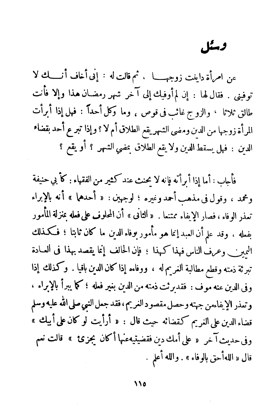 عَنْ امْرَأَةٍ دَايَنَتْ زَوْجَهَا ثُمَّ قَالَتْ لَهُ: إنِّي أَخَافُ أَنَّك لَا تُوَفِّينِي. فَقَالَ لَهَا: إنْ لَمْ أُوَفِّيك إلَى آخِرِ شَهْرِ رَمَضَانَ هَذَا وَإِلَّا فَأَنْتِ طَالِقٌ ثَلَاثًا وَالزَّوْجُ غَائِبٌ فِي قوص وَمَا وَكَّلَ أَحَدًا: فَهَلْ إذَا أَبْرَأَتْ الْمَرْأَةُ زَوْجَهَا مِنْ الدِّينِ وَمَضَى الشَّهْرُ يَقَعُ الطَّلَاقُ أَمْ لَا؟ وَإِذَا تَبَرَّعَ أَحَدٌ (بِقَضَاءِ الدَّيْنِ: فَهَلْ يَسْقُطُ الدَّيْنُ وَلَا يَقَعُ الطَّلَاقُ بِمُضِيِّ الشَّهْرِ؟ أَوْ يَقَعُ؟