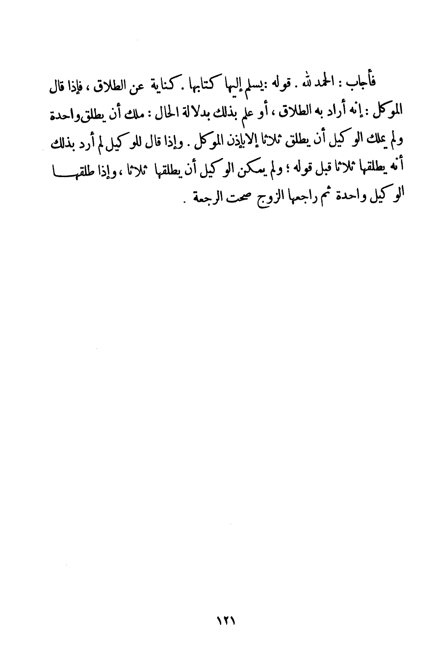الْحَمْدُ لِلَّهِ، قَوْلُهُ: يُسَلِّمُ إلَيْهَا كِتَابَهَا. كِنَايَةً عَنْ الطَّلَاقِ فَإِذَا قَالَ الْمُوَكِّلُ: إنَّهُ أَرَادَ بِهِ الطَّلَاقَ أَوْ عَلِمَ بِذَلِكَ بِدَلَالَةِ الْحَالِ: مَلَكَ أَنْ يُطَلِّقَ وَاحِدَةً وَلَمْ يَمْلِكْ الْوَكِيلُ أَنْ يُطَلِّقَ ثَلَاثًا إلَّا بِإِذْنِ الْمُوَكِّلِ. وَإِذَا قَالَ لِلْوَكِيلِ لَمْ أُرِدْ بِذَلِكَ أَنَّهُ يُطَلِّقُهَا ثَلَاثًا قَبْلَ قَوْلِهِ؛ وَلَمْ يُمْكِنْ الْوَكِيلُ أَنْ يُطَلِّقَهَا ثَلَاثًا وَإِذَا طَلَّقَهَا الْوَكِيلُ وَاحِدَةً ثُمَّ رَاجَعَهَا الزَّوْجُ صَحَّتْ الرَّجْعَةُ.