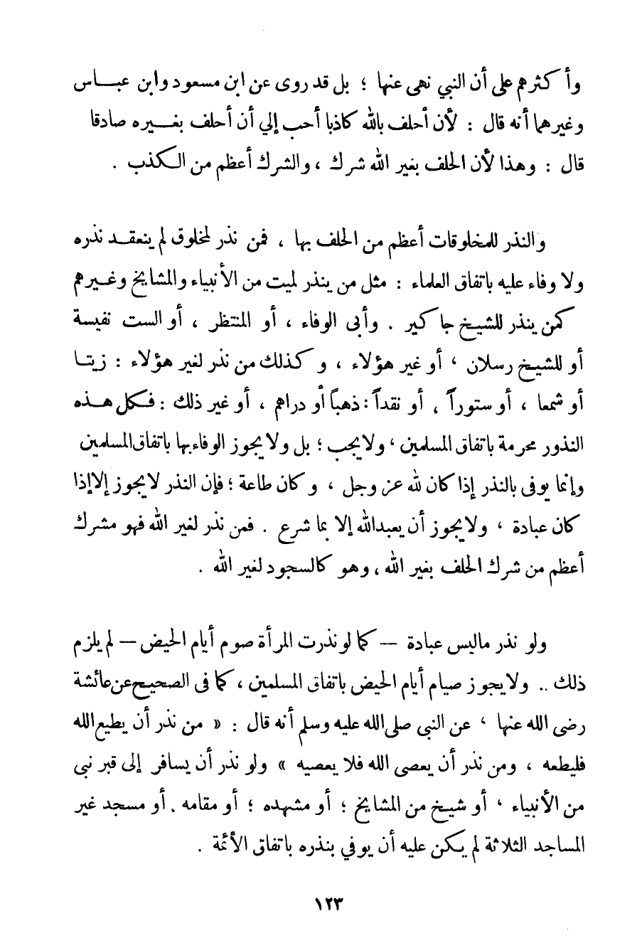 وَأَكْثَرِهِمْ عَلَى أَنَّ النَّبِيَّ نَهَى عَنْهَا؛ بَلْ قَدْ رُوِيَ عَنْ ابْنِ مَسْعُودٍ وَابْنِ عَبَّاسٍ وَغَيْرِهِمَا أَنَّهُ قَالَ: لَأَنْ أَحْلِفَ بِاَللَّهِ كَاذِبًا أَحَبُّ إلَيَّ أَنْ أَحْلِفَ بِغَيْرِهِ صَادِقًا قَالَ: وَهَذَا لِأَنَّ الْحَلِفَ بِغَيْرِ اللَّهِ شِرْكٌ وَالشِّرْكُ أَعْظَمُ مِنْ الْكَذِبِ. وَالنَّذْرُ لِلْمَخْلُوقَاتِ أَعْظَمُ مِنْ الْحَلِفِ بِهَا فَمَنْ نَذَرَ لِمَخْلُوقِ لَمْ يَنْعَقِدْ نَذْرُهُ وَلَا وَفَاءَ عَلَيْهِ بِاتِّفَاقِ الْعُلَمَاءِ: مِثْلَ مَنْ يُنْذِرُ لِمَيِّتِ مِنْ الْأَنْبِيَاءِ وَالْمَشَايِخِ وَغَيْرِهِمْ كَمَنْ يُنْذِرُ لِلشَّيْخِ جاكير. وَأَبِي الْوَفَاءِ أَوْ الْمُنْتَظِرِ أَوْ السِّتِّ نَفِيسَةَ أَوْ لِلشَّيْخِ رَسْلَانَ أَوْ غَيْرِ هَؤُلَاءِ وَكَذَلِكَ مَنْ نَذَرَ لِغَيْرِ هَؤُلَاءِ: زَيْتًا أَوْ شَمْعًا أَوْ سُتُورًا أَوْ نَقْدًا: ذَهَبًا أَوْ دَرَاهِمَ أَوْ غَيْرِ ذَلِكَ: فَكُلُّ هَذِهِ النُّذُورِ مُحَرَّمَةٌ بِاتِّفَاقِ الْمُسْلِمِينَ وَلَا يَجِبُ؛ بَلْ وَلَا يَجُوزُ الْوَفَاءُ بِهَا بِاتِّفَاقِ الْمُسْلِمِينَ وَإِنَّمَا يُوفِي بِالنَّذْرِ إذَا كَانَ لِلَّهِ عَزَّ وَجَلَّ وَكَانَ طَاعَةً؛ فَإِنَّ النَّذْرَ لَا يَجُوزُ إلَّا إذَا كَانَ عِبَادَةً وَلَا يَجُوزُ أَنْ يَعْبُدَ اللَّهَ إلَّا بِمَا شَرَعَ. فَمَنْ نَذَرَ لِغَيْرِ اللَّهِ فَهُوَ مُشْرِكٌ أَعْظَمُ مِنْ شِرْكِ الْحَلِفِ بِغَيْرِ اللَّهِ وَهُوَ كَالسُّجُودِ لِغَيْرِ اللَّهِ. وَلَوْ نَذَرَ مَا لَيْسَ عِبَادَةً - كَمَا لَوْ نَذَرَتْ الْمَرْأَةُ صَوْمَ أَيَّامِ الْحَيْضِ - لَمْ يَلْزَمْ ذَلِكَ. وَلَا يَجُوزُ صِيَامُ أَيَّامِ الْحَيْضِ بِاتِّفَاقِ الْمُسْلِمِينَ كَمَا فِي الصَّحِيحِ عَنْ عَائِشَةَ رَضِيَ اللَّهُ عَنْهَا عَنْ النَّبِيِّ صَلَّى اللَّهُ عَلَيْهِ وَسَلَّمَ أَنَّهُ قَالَ: {مَنْ نَذَرَ أَنْ يُطِيعَ اللَّهَ فَلْيُطِعْهُ وَمَنْ نَذَرَ أَنْ يَعْصِيَ اللَّهَ فَلَا يَعْصِيه} وَلَوْ نَذَرَ أَنْ يُسَافِرَ إلَى قَبْرِ نَبِيٍّ مِنْ الْأَنْبِيَاءِ أَوْ شَيْخٍ مِنْ الْمَشَايِخِ؛ أَوْ مَشْهَدِهِ؛ أَوْ مَقَامِهِ أَوْ مَسْجِدٍ غَيْرِ الْمَسَاجِدِ الثَّلَاثَةِ لَمْ يَكُنْ عَلَيْهِ أَنْ يُوفِيَ بِنَذْرِهِ بِاتِّفَاقِ الْأَئِمَّةِ.