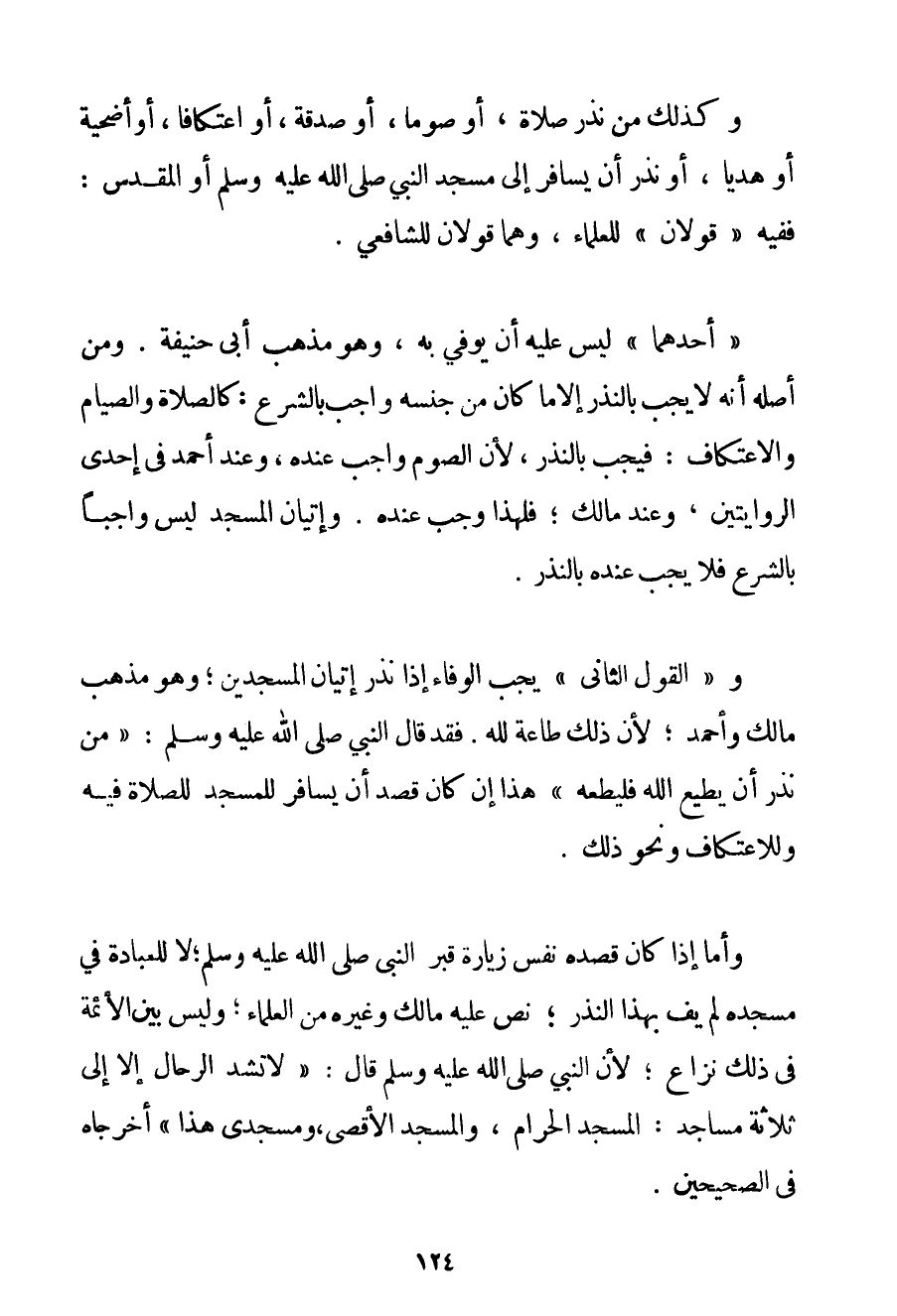 وَكَذَلِكَ مَنْ نَذَرَ صَلَاةً أَوْ صَوْمًا أَوْ صَدَقَةً أَوْ اعْتِكَافًا أَوْ أُضْحِيَّةً أَوْ هَدْيًا أَوْ نَذَرَ أَنْ يُسَافِرَ إلَى مَسْجِدِ النَّبِيِّ صَلَّى اللَّهُ عَلَيْهِ وَسَلَّمَ أَوْ الْمَقْدِسِ: فَفِيهِ " قَوْلَانِ " لِلْعُلَمَاءِ وَهُمَا قَوْلَانِ لِلشَّافِعِيِّ. " أَحَدُهُمَا " لَيْسَ عَلَيْهِ أَنْ يُوفِيَ بِهِ وَهُوَ مَذْهَبُ أَبِي حَنِيفَةَ. وَمَنْ أَصْلُهُ أَنْ لَا يَجِبَ بِالنَّذْرِ إلَّا مَا كَانَ مِنْ جِنْسِهِ وَاجِبٌ بِالشَّرْعِ: كَالصَّلَاةِ وَالصِّيَامِ وَالِاعْتِكَافِ: فَيَجِبُ بِالنَّذْرِ لِأَنَّ الصَّوْمَ وَاجِبٌ عِنْدَهُ وَعِنْدَ أَحْمَد فِي إحْدَى الرِّوَايَتَيْنِ وَعِنْدَ مَالِكٍ؛ فَلِهَذَا وَجَبَ عِنْدَهُ. وَإِتْيَانُ الْمَسْجِدِ لَيْسَ وَاجِبًا بِالشَّرْعِ فَلَا يَجِبُ عِنْدَهُ بِالنَّذْرِ. و " الْقَوْلُ الثَّانِي " يَجِبُ الْوَفَاءُ إذَا نَذَرَ إتْيَانَ الْمَسْجِدَيْنِ؛ وَهُوَ مَذْهَبُ مَالِكٍ وَأَحْمَد؛ لِأَنَّ ذَلِكَ طَاعَةٌ لِلَّهِ. فَقَدْ قَالَ النَّبِيُّ صَلَّى اللَّهُ عَلَيْهِ وَسَلَّمَ {مَنْ نَذَرَ أَنْ يُطِيعَ اللَّهَ فَلْيُطِعْهُ} هَذَا إنْ كَانَ قَصَدَ أَنْ يُسَافِرَ لِلْمَسْجِدِ لِلصَّلَاةِ فِيهِ وَلِلِاعْتِكَافِ وَنَحْوِ ذَلِكَ. وَأَمَّا إذَا كَانَ قَصْدُهُ نَفْسَ زِيَارَةِ قَبْرِ النَّبِيِّ صَلَّى اللَّهُ عَلَيْهِ وَسَلَّمَ لَا لِلْعِبَادَةِ فِي مَسْجِدِهِ لَمْ يَفِ بِهَذَا النَّذْرِ؛ نَصَّ عَلَيْهِ مَالِكٌ وَغَيْرُهُ مِنْ الْعُلَمَاءِ؛ وَلَيْسَ بَيْنَ الْأَئِمَّةِ فِي ذَلِكَ نِزَاعٌ؛ لِأَنَّ النَّبِيَّ صَلَّى اللَّهُ عَلَيْهِ وَسَلَّمَ قَالَ: {لَا تُشَدُّ الرِّحَالُ إلَّا إلَى ثَلَاثَةِ مَسَاجِدَ: الْمَسْجِدِ الْحَرَامِ وَالْمَسْجِدِ الْأَقْصَى وَمَسْجِدِي هَذَا} أَخْرَجَاهُ فِي الصَّحِيحَيْنِ.