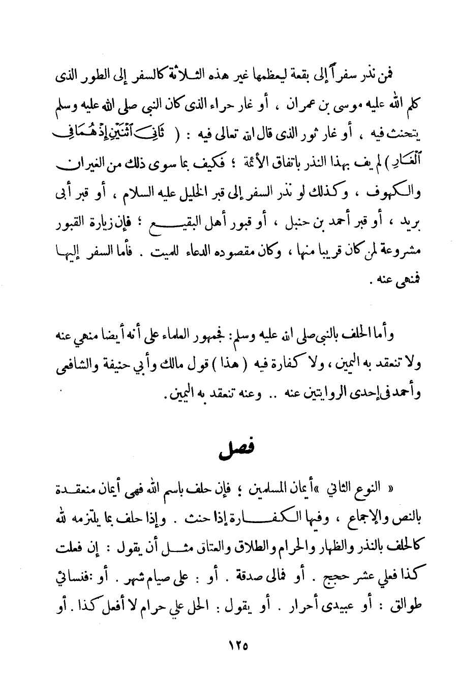 فَمَنْ نَذَرَ سَفَرًا إلَى بُقْعَةٍ لِيُعَظِّمَهَا غَيْرَ هَذِهِ الثَّلَاثَةِ كَالسَّفَرِ إلَى الطُّورِ الَّذِي كَلَّمَ اللَّهُ عَلَيْهِ مُوسَى بْنَ عِمْرَانَ أَوْ غَارِ حِرَاءٍ الَّذِي كَانَ النَّبِيُّ صَلَّى اللَّهُ عَلَيْهِ وَسَلَّمَ يَتَحَنَّثُ فِيهِ أَوْ غَارِ ثَوْرٍ الَّذِي قَالَ اللَّهُ تَعَالَى فِيهِ: {ثَانِيَ اثْنَيْنِ إذْ هُمَا فِي الْغَارِ} لَمْ يَفِ بِهَذَا النَّذْرِ بِاتِّفَاقِ الْأَئِمَّةِ؛ فَكَيْفَ بِمَا سَوَّى ذَلِكَ مِنْ الْغِيَرَانِ وَالْكُهُوفِ وَكَذَلِكَ لَوْ نَذَرَ السَّفَرَ إلَى قَبْرِ الْخَلِيلِ عَلَيْهِ السَّلَامُ أَوْ قَبْرِ أَبِي بريد أَوْ قَبْرِ أَحْمَد بْنِ حَنْبَلٍ أَوْ قُبُورِ أَهْلِ الْبَقِيعِ؛ فَإِنَّ زِيَارَةَ الْقُبُورِ مَشْرُوعَةٌ لِمَنْ كَانَ قَرِيبًا مِنْهَا وَكَانَ مَقْصُودُهُ الدُّعَاءَ لِلْمَيِّتِ. فَأَمَّا السَّفَرُ إلَيْهَا فَمَنْهِيٌّ عَنْهُ. وَأَمَّا الْحَلِفُ بِالنَّبِيِّ صَلَّى اللَّهُ عَلَيْهِ وَسَلَّمَ فَجُمْهُورُ الْعُلَمَاءِ عَلَى أَنَّهُ أَيْضًا مَنْهِيٌّ عَنْهُ وَلَا تَنْعَقِدُ بِهِ الْيَمِينُ وَلَا كَفَّارَةَ فِيهِ (هَذَا قَوْلُ مَالِكٍ وَأَبِي حَنِيفَةَ وَالشَّافِعِيِّ وَأَحْمَد فِي إحْدَى الرِّوَايَتَيْنِ عَنْهُ، وَعَنْهُ تَنْعَقِدُ بِهِ الْيَمِينُ.