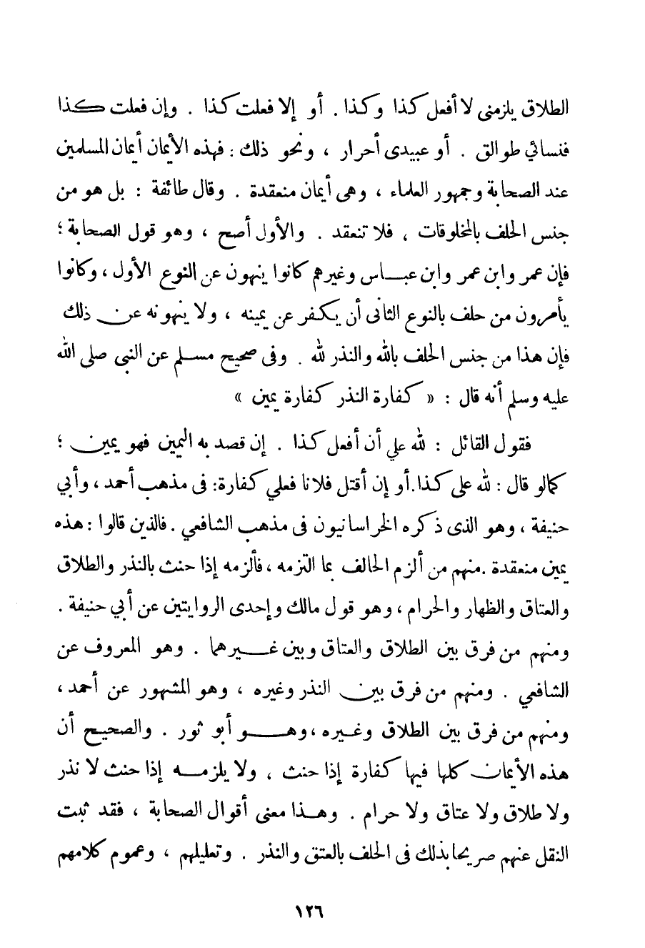الطَّلَاقُ يَلْزَمُنِي لَا أَفْعَلُ كَذَا وَكَذَا. أَوْ إلَّا فَعَلْت كَذَا. وَإِنْ فَعَلْت كَذَا فَنِسَائِي طَوَالِقُ. أَوْ عَبِيدِي أَحْرَارٌ وَنَحْوَ ذَلِكَ؛ فَهَذِهِ الْأَيْمَانُ أَيْمَانُ الْمُسْلِمِينَ عِنْدَ الصَّحَابَةِ وَجُمْهُورِ الْعُلَمَاءِ وَهِيَ أَيْمَانٌ مُنْعَقِدَةٌ. وَقَالَ طَائِفَةٌ: بَلْ هُوَ مِنْ جِنْسِ الْحَلِفِ بِالْمَخْلُوقَاتِ فَلَا تَنْعَقِدُ. وَالْأَوَّلُ أَصَحُّ وَهُوَ قَوْلُ الصَّحَابَةِ؛ فَإِنَّ عُمَرَ وَابْنَ عُمَرَ وَابْنَ عَبَّاسٍ وَغَيْرَهُمْ كَانُوا يَنْهَوْنَ عَنْ النَّوْعِ الْأَوَّلِ. وَكَانُوا يَأْمُرُونَ مَنْ حَلَفَ بِالنَّوْعِ الثَّانِي أَنْ يُكَفِّرَ عَنْ يَمِينِهِ وَلَا يَنْهَوْنَهُ عَنْ ذَلِكَ فَإِنَّ هَذَا مِنْ جِنْسِ الْحَلِفِ بِاَللَّهِ وَالنَّذْرِ لِلَّهِ وَفِي صَحِيحِ مُسْلِمٍ عَنْ النَّبِيِّ صَلَّى اللَّهُ عَلَيْهِ وَسَلَّمَ أَنَّهُ قَالَ: {كَفَّارَةُ النَّذْرِ كَفَّارَةُ يَمِينٍ} فَقَوْلُ الْقَائِلِ: لِلَّهِ عَلَيَّ أَنْ أَفْعَلَ كَذَا. إنْ قَصَدَ بِهِ الْيَمِينَ فَهُوَ يَمِينٌ؛ كَمَا لَوْ قَالَ: لِلَّهِ عَلَيَّ كَذَا. أَوْ إنْ أَقْتُلَ فُلَانًا فَعَلَيَّ كَفَّارَةٌ: فِي مَذْهَبِ أَحْمَد وَأَبِي حَنِيفَةَ وَهُوَ الَّذِي ذَكَرَهُ الخراسانيون فِي مَذْهَبِ الشَّافِعِيِّ. فَاَلَّذِينَ قَالُوا: هَذَا يَمِينٌ مُنْعَقِدَةٌ. مِنْهُمْ مَنْ أَلْزَمَ الْحَالِفَ بِمَا الْتَزَمَهُ فَأَلْزَمَهُ إذَا حَنِثَ بِالنَّذْرِ وَالطَّلَاقِ وَالْعَتَاقِ وَالظِّهَارِ وَالْحَرَامِ وَهُوَ قَوْلُ مَالِكٍ وَإِحْدَى الرِّوَايَتَيْنِ عَنْ أَبِي حَنِيفَةَ. وَمِنْهُمْ مَنْ فَرَّقَ بَيْنَ الطَّلَاقِ وَالْعَتَاقِ وَبَيْنَ غَيْرِهِمَا. وَهُوَ الْمَعْرُوفُ عَنْ الشَّافِعِيِّ. وَمِنْهُمْ مَنْ فَرَّقَ بَيْنَ النَّذْرِ وَغَيْرِهِ وَهُوَ الْمَشْهُورُ عَنْ أَحْمَد وَمِنْهُمْ مَنْ فَرَّقَ بَيْنَ الطَّلَاقِ وَغَيْرِهِ وَهُوَ أَبُو ثَوْرٍ. وَالصَّحِيحُ أَنَّ هَذِهِ الْأَيْمَانَ كُلُّهَا فِيهَا كَفَّارَةٌ إذَا حَنِثَ وَلَا يَلْزَمُهُ إذَا حَنِثَ لَا نَذْرٌ وَلَا طَلَاقٌ وَلَا عَتَاقٌ وَلَا حَرَامٌ. وَهَذَا مَعْنَى أَقْوَالِ الصَّحَابَةِ فَقَدْ ثَبَتَ النَّقْلُ عَنْهُمْ صَرِيحٌ بِذَلِكَ فِي الْحَلِفِ بِالْعِتْقِ وَالنَّذْرِ. وَتَعْلِيلُهُمْ وَعُمُومُ كَلَامِهِمْ