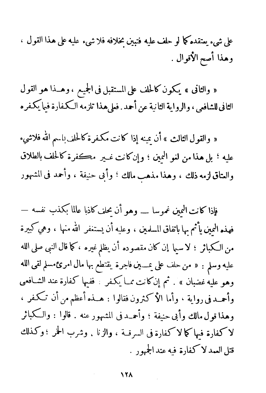 عَلَى شَيْءٍ يَعْتَقِدُهُ كَمَا لَوْ حَلَفَ عَلَيْهِ فَتَبَيَّنَ بِخِلَافِهِ فَلَا شَيْءَ عَلَيْهِ عَلَى هَذَا الْقَوْلِ وَهَذَا أَصَحُّ الْأَقْوَالِ. " وَالثَّانِي " يَكُونُ كَالْحَلِفِ عَلَى الْمُسْتَقْبَلِ فِي الْجَمِيعِ وَهَذَا هُوَ الْقَوْلُ الثَّانِي لِلشَّافِعِيِّ وَالرِّوَايَةُ الثَّانِيَةُ عَنْ أَحْمَد. فَعَلَى هَذَا تَلْزَمُهُ الْكَفَّارَةُ فِيمَا يُكَفِّرُهُ " وَالْقَوْلُ الثَّالِثُ " أَنَّ يَمِينَهُ إذَا كَانَتْ مُكَفِّرَةً كَالْحَلِفِ بِسْمِ اللَّهِ فَلَا شَيْءَ عَلَيْهِ؛ بَلْ هَذَا مِنْ لَغْوِ الْيَمِينِ؛ وَإِنْ كَانَتْ غَيْرَ مُكَفِّرَةٍ كَالْحَلِفِ بِالطَّلَاقِ وَالْعَتَاقِ لَزِمَهُ ذَلِكَ وَهَذَا مَذْهَبُ مَالِكٍ؛ وَأَبِي حَنِيفَةَ وَأَحْمَد فِي الْمَشْهُورِ فَإِذَا كَانَتْ الْيَمِينُ غَمُوسًا - وَهُوَ أَنْ يَحْلِفَ كَاذِبًا عَالِمًا بِكَذِبِ نَفْسِهِ - فَهَذِهِ الْيَمِينُ يَأْثَمُ بِهَا بِاتِّفَاقِ الْمُسْلِمِينَ وَعَلَيْهِ أَنْ يَسْتَغْفِرَ اللَّهَ مِنْهَا وَهِيَ كَبِيرَةٌ مِنْ الْكَبَائِرِ؛ لَا سِيَّمَا إنْ كَانَ مَقْصُودُهُ أَنْ يَظْلِمَ غَيْرَهُ كَمَا قَالَ النَّبِيُّ صَلَّى اللَّهُ عَلَيْهِ وَسَلَّمَ {مَنْ حَلَفَ عَلَى يَمِينٍ فَاجِرَةٍ يَقْتَطِعُ بِهَا مَالَ امْرِئٍ مُسْلِمٍ لَقِيَ اللَّهَ وَهُوَ عَلَيْهِ غَضْبَانُ} ثُمَّ إنْ كَانَتْ مِمَّا يُكَفِّرُ: فَفِيهَا كَفَّارَةٌ عِنْدَ الشَّافِعِيِّ وَأَحْمَد فِي رِوَايَةٍ وَأَمَّا الْأَكْثَرُونَ فَقَالُوا: هَذِهِ أَعْظَمُ مِنْ أَنْ تُكَفَّرَ وَهَذَا قَوْلُ مَالِكٍ وَأَبِي حَنِيفَةَ وَأَحْمَد فِي الْمَشْهُورِ عَنْهُ. قَالُوا: وَالْكَبَائِرُ لَا كَفَّارَةَ فِيهَا كَمَا لَا كَفَّارَةَ فِي السَّرِقَةِ وَالزِّنَا وَشُرْبِ الْخَمْرِ؛ وَكَذَلِكَ قَتْلُ الْعَمْدِ لَا كَفَّارَةَ فِيهِ عِنْدَ الْجُمْهُورِ.
