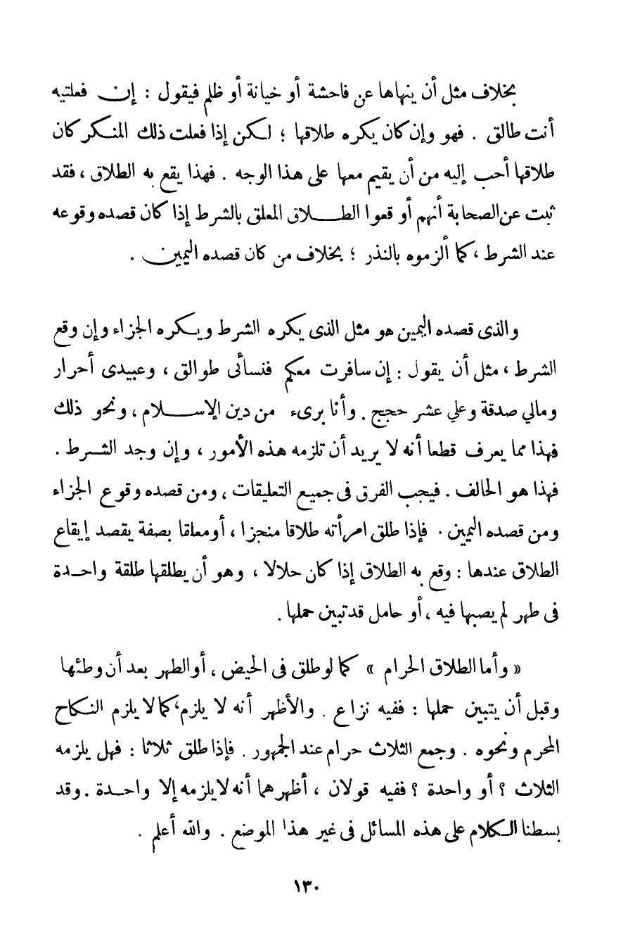 بِخِلَافِ مِثْلَ أَنْ يَنْهَاهَا عَنْ فَاحِشَةٍ أَوْ خِيَانَةٍ أَوْ ظُلْمٍ فَيَقُولُ: إنْ فعلتيه أَنْتِ طَالِقٌ. فَهُوَ وَإِنْ كَانَ يَكْرَهُ طَلَاقَهَا؛ لَكِنْ إذَا فَعَلَتْ ذَلِكَ الْمُنْكَرَ كَانَ طَلَاقُهَا أَحَبَّ إلَيْهِ مِنْ أَنْ يُقِيمَ مَعَهَا عَلَى هَذَا الْوَجْهِ. فَهَذَا يَقَعُ بِهِ الطَّلَاقُ فَقَدْ ثَبَتَ عَنْ الصَّحَابَةِ أَنَّهُمْ أَوْقَعُوا الطَّلَاقَ الْمُعَلَّقَ بِالشَّرْطِ إذَا كَانَ قَصْدُهُ وُقُوعَهُ عِنْدَ الشَّرْطِ كَمَا أَلْزَمُوهُ بِالنَّذْرِ؛ بِخِلَافِ مَنْ كَانَ قَصْدُهُ الْيَمِينَ. وَاَلَّذِي قَصْدُهُ الْيَمِينَ هُوَ مِثْلَ الَّذِي يَكْرَهُ الشَّرْطَ وَيَكْرَهُ الْجَزَاءَ وَإِنْ وَقْعَ الشَّرْطُ مِثْلَ أَنْ يَقُولَ: إنْ سَافَرْت مَعَكُمْ فَنِسَائِي طَوَالِقُ وَعَبِيدِي أَحْرَارٌ وَمَالِي صَدَقَةٌ وَعَلَيَّ عَشْرُ حِجَجٍ. وَأَنَا بَرِيءٌ مِنْ دِينِ الْإِسْلَامِ وَنَحْوِ ذَلِكَ فَهَذَا مِمَّا يُعْرَفُ قَطْعًا أَنَّهُ لَا يُرِيدُ أَنْ تَلْزَمَهُ هَذِهِ الْأُمُورُ وَإِنْ وُجِدَ الشَّرْطُ. فَهَذَا هُوَ الْحَالِفُ. فَيَجِبُ الْفَرْقُ فِي جَمِيعِ التَّعْلِيقَاتِ وَمَنْ قَصْدُهُ وُقُوعَ الْجَزَاءِ وَمَنْ قَصْدُهُ الْيَمِينَ. فَإِذَا طَلَّقَ امْرَأَتَهُ طَلَاقًا مُنَجَّزًا أَوْ مُعَلَّقًا بِصِفَةِ يَقْصِدُ إيقَاعَ الطَّلَاقِ عِنْدَهَا: وَقَعَ بِهِ الطَّلَاقُ إذَا كَانَ حَلَالًا وَهُوَ أَنْ يُطَلِّقَهَا طَلْقَةً وَاحِدَةً فِي طُهْرٍ لَمْ يُصِبْهَا فِيهِ أَوْ حَامِلٌ قَدْ تَبَيَّنَ حَمْلُهَا. " وَأَمَّا الطَّلَاقُ الْحَرَامُ " كَمَا لَوْ طَلَّقَ فِي الْحَيْضِ أَوْ الطُّهْرِ بَعْدَ أَنْ وَطِئَهَا وَقَبْلَ أَنْ يَتَبَيَّنَ حَمْلُهَا: فَفِيهِ نِزَاعٌ. وَالْأَظْهَرُ أَنَّهُ لَا يَلْزَمُ كَمَا لَا يَلْزَمُ النِّكَاحُ الْمُحَرَّمُ وَنَحْوُهُ. وَجَمْعُ الثَّلَاثِ حَرَامٌ عِنْدَ الْجُمْهُورِ. فَإِذَا طَلَّقَ ثَلَاثًا: فَهَلْ يَلْزَمُهُ الثَّلَاثُ؟ أَوْ وَاحِدَةٌ؟ فَفِيهِ قَوْلَانِ أَظْهَرُهُمَا أَنَّهُ لَا يَلْزَمُهُ إلَّا وَاحِدَةٌ. وَقَدْ بَسَطْنَا الْكَلَامَ عَلَى هَذِهِ الْمَسَائِلِ فِي غَيْرِ هَذَا الْمَوْضِعِ. وَاَللَّهُ أَعْلَمُ.