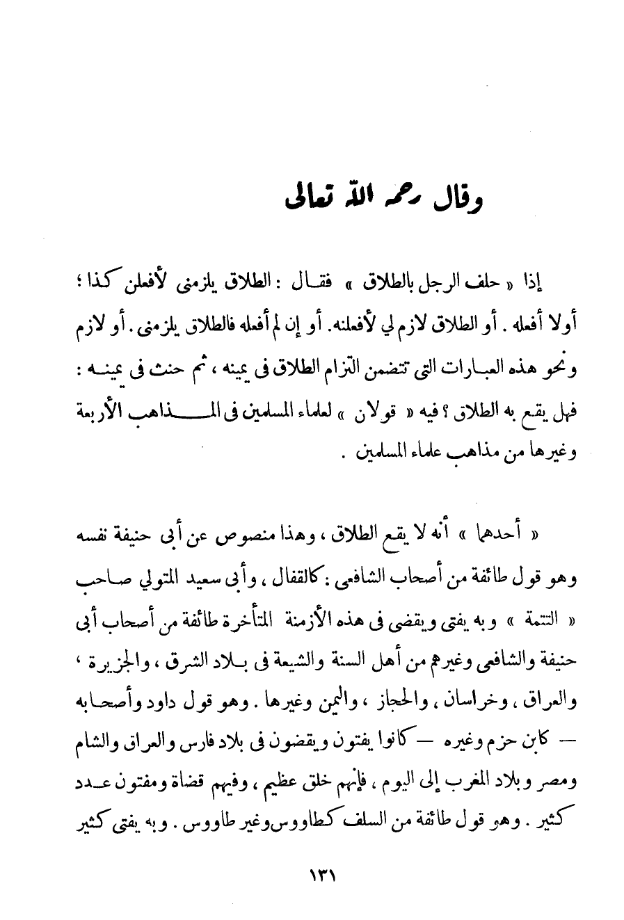 إذَا " حَلَفَ الرَّجُلُ بِالطَّلَاقِ " فَقَالَ: الطَّلَاقُ يَلْزَمُنِي لَأَفْعَلَن كَذَا؛ أَوْ لَا أَفْعَلُهُ. أَوْ الطَّلَاقُ لَازِمٌ لِي لَأَفْعَلَنهُ. أَوْ إنْ لَمْ أَفْعَلْهُ فَالطَّلَاقُ يَلْزَمُنِي. أَوْ لَازِمٌ وَنَحْوُ هَذِهِ الْعِبَارَاتِ الَّتِي تَتَضَمَّنُ الْتِزَامَ الطَّلَاقِ فِي يَمِينِهِ ثُمَّ حَنِثَ فِي يَمِينِهِ: فَهَلْ يَقَعُ بِهِ الطَّلَاقُ؟ فِيهِ " قَوْلَانِ " لِعُلَمَاءِ الْمُسْلِمِينَ فِي الْمَذَاهِبِ الْأَرْبَعَةِ وَغَيْرِهَا مِنْ مَذَاهِبِ عُلَمَاءِ الْمُسْلِمِينَ. " أَحَدُهُمَا " أَنَّهُ لَا يَقَعُ الطَّلَاقُ وَهَذَا مَنْصُوصٌ عَنْ أَبِي حَنِيفَةَ نَفْسِهِ وَهُوَ قَوْلُ طَائِفَةٍ مِنْ أَصْحَابِ الشَّافِعِيِّ: كَالْقَفَّالِ وَأَبِي سَعِيدٍ الْمُتَوَلِّي صَاحِبِ " التَّتِمَّةِ " وَبِهِ يُفْتِي وَيَقْضِي فِي هَذِهِ الْأَزْمِنَةِ الْمُتَأَخِّرَةِ طَائِفَةٌ مِنْ أَصْحَابِ أَبِي حَنِيفَةَ وَالشَّافِعِيِّ وَغَيْرِهِمْ مِنْ أَهْلِ السُّنَّةِ وَالشِّيعَةِ فِي بِلَادِ الشَّرْقِ وَالْجَزِيرَةِ وَالْعِرَاقِ وَخُرَاسَانَ وَالْحِجَازِ وَالْيُمْنِ وَغَيْرِهَا. وَهُوَ قَوْلُ دَاوُد وَأَصْحَابِهِ - كَابْنِ حَزْمٍ وَغَيْرِهِ - كَانُوا يُفْتُونَ وَيَقْضُونَ فِي بِلَادِ فَارِسَ وَالْعِرَاقِ وَالشَّامِ وَمِصْرَ وَبِلَادِ الْمَغْرِبِ إلَى الْيَوْمِ فَإِنَّهُمْ خَلْقٌ عَظِيمٌ وَفِيهِمْ قُضَاةٌ وَمُفْتُونَ عَدَدٌ كَثِيرٌ. وَهُوَ قَوْلُ طَائِفَةٍ مِنْ السَّلَفِ كَطَاوُوسِ وَغَيْرِ طَاوُوسٍ، وَبِهِ يُفْتِي كَثِيرٌ مِنْ