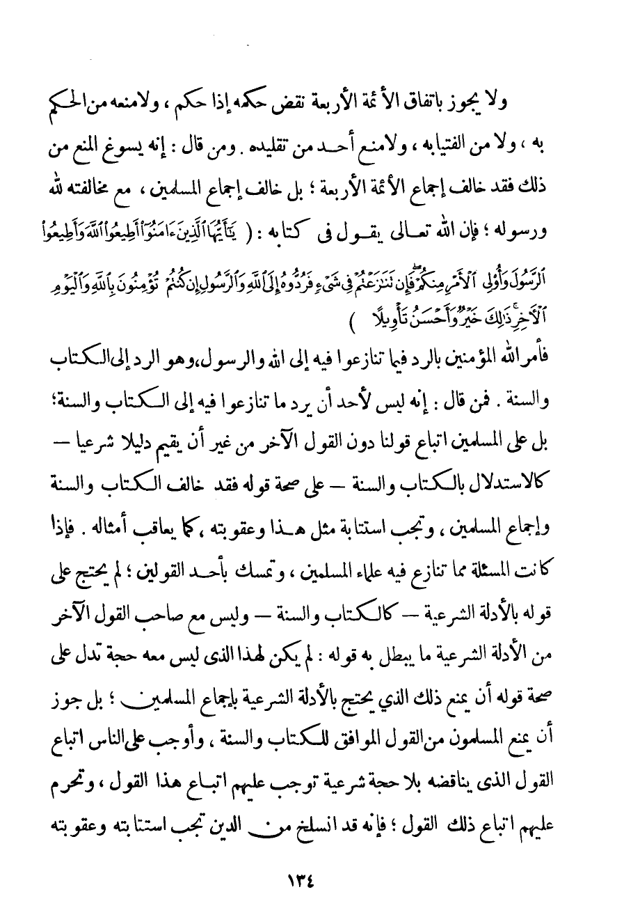 وَلَا يَجُوزُ بِاتِّفَاقِ الْأَئِمَّةِ الْأَرْبَعَةِ نَقْضُ حُكْمِهِ إذَا حَكَمَ وَلَا مَنْعُهُ مِنْ الْحُكْمِ بِهِ وَلَا مِنْ الْفُتْيَا بِهِ وَلَا مَنْعِ أَحَدٍ مِنْ تَقْلِيدِهِ. وَمَنْ قَالَ: إنَّهُ يُسَوِّغُ الْمَنْعَ مِنْ ذَلِكَ فَقَدْ خَالَفَ إجْمَاعَ الْأَئِمَّةِ الْأَرْبَعَةِ؛ بَلْ خَالَفَ إجْمَاعَ الْمُسْلِمِينَ مَعَ مُخَالَفَتِهِ لِلَّهِ وَرَسُولِهِ؛ فَإِنَّ اللَّهَ تَعَالَى يَقُولُ فِي كِتَابِهِ: {يَا أَيُّهَا الَّذِينَ آمَنُوا أَطِيعُوا اللَّهَ وَأَطِيعُوا الرَّسُولَ وَأُولِي الْأَمْرِ مِنْكُمْ فَإِنْ تَنَازَعْتُمْ فِي شَيْءٍ فَرُدُّوهُ إلَى اللَّهِ وَالرَّسُولِ إنْ كُنْتُمْ تُؤْمِنُونَ بِاللَّهِ وَالْيَوْمِ الْآخِرِ ذَلِكَ خَيْرٌ وَأَحْسَنُ تَأْوِيلًا} فَأَمَرَ اللَّهُ الْمُؤْمِنِينَ بِالرَّدِّ فِيمَا تَنَازَعُوا فِيهِ إلَى اللَّهِ وَالرَّسُولِ وَهُوَ الرَّدُّ إلَى الْكِتَابِ وَالسُّنَّةِ. فَمَنْ قَالَ: إنَّهُ لَيْسَ لِأَحَدِ أَنْ يُرَدَّ مَا تَنَازَعُوا فِيهِ إلَى الْكِتَابِ وَالسُّنَّةِ؛ بَلْ عَلَى الْمُسْلِمِينَ اتِّبَاعُ قَوْلِنَا دُونَ الْقَوْلِ الْآخَرِ مِنْ غَيْرِ أَنْ يُقِيمَ دَلِيلًا شَرْعِيًّا - كَالِاسْتِدْلَالِ بِالْكِتَابِ وَالسُّنَّةِ - عَلَى صِحَّةِ قَوْلِهِ فَقَدْ خَالَفَ الْكِتَابَ وَالسُّنَّةَ وَإِجْمَاعَ الْمُسْلِمِينَ وَتَجِبُ اسْتِتَابَةُ مِثْلِ هَذَا وَعُقُوبَتُهُ كَمَا يُعَاقَبُ أَمْثَالُهُ. فَإِذَا كَانَتْ الْمَسْأَلَةُ مِمَّا تَنَازَعَ فِيهِ عُلَمَاءُ الْمُسْلِمِينَ وَتَمَسَّكَ بِأَحَدِ الْقَوْلَيْنِ؛ لَمْ يُحْتَجَّ عَلَى قَوْلِهِ بِالْأَدِلَّةِ الشَّرْعِيَّةِ - كَالْكِتَابِ وَالسُّنَّةِ - وَلَيْسَ مَعَ صَاحِبِ الْقَوْلِ الْآخَرِ مِنْ الْأَدِلَّةِ الشَّرْعِيَّةِ مَا يَبْطُلُ بِهِ قَوْلُهُ: لَمْ يَكُنْ لِهَذَا الَّذِي لَيْسَ مَعَهُ حُجَّةٌ تَدُلُّ عَلَى صِحَّةِ قَوْلِهِ أَنْ يَمْنَعَ ذَلِكَ الَّذِي يَحْتَجُّ بِالْأَدِلَّةِ الشَّرْعِيَّةِ بِإِجْمَاعِ الْمُسْلِمِينَ؛ بَلْ جَوَّزَ أَنْ يَمْنَعَ الْمُسْلِمُونَ مِنْ الْقَوْلِ الْمُوَافِقِ لِلْكِتَابِ وَالسُّنَّةِ وَأَوْجَبَ عَلَى النَّاسِ اتِّبَاعَ الْقَوْلِ الَّذِي يُنَاقِضُهُ بِلَا حُجَّةٍ شَرْعِيَّةٍ تُوجِبُ عَلَيْهِمْ اتِّبَاعَ هَذَا الْقَوْلِ وَتُحَرِّمُ عَلَيْهِمْ اتِّبَاعَ ذَلِكَ الْقَوْلِ؛ فَإِنَّهُ قَدْ انْسَلَخَ مِنْ الدِّينِ تَجِبُ اسْتِتَابَتُهُ وَعُقُوبَتُهُ