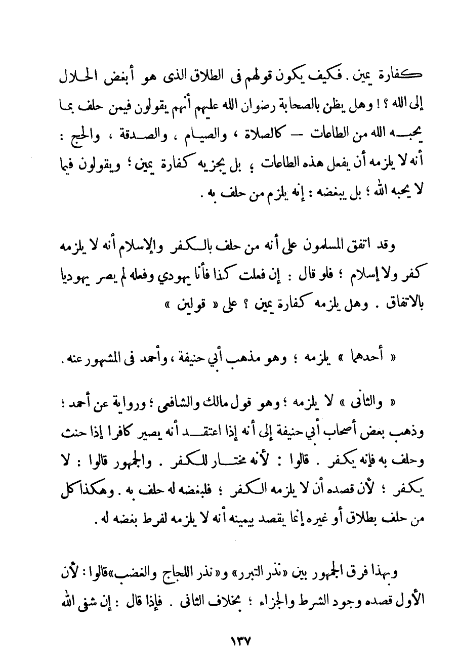 كَفَّارَةُ يَمِينٍ. فَكَيْفَ يَكُونُ قَوْلُهُمْ فِي الطَّلَاقِ الَّذِي هُوَ أَبْغَضُ الْحَلَالِ إلَى اللَّهِ؟ وَهَلْ يُظَنُّ بِالصَّحَابَةِ رِضْوَانُ اللَّهِ عَلَيْهِمْ أَنَّهُمْ يَقُولُونَ فِيمَنْ حَلَفَ بِمَا يُحِبُّهُ اللَّهُ مِنْ الطَّاعَاتِ - كَالصَّلَاةِ وَالصِّيَامِ وَالصَّدَقَةِ وَالْحَجِّ: أَنَّهُ لَا يَلْزَمُهُ أَنْ يَفْعَلَ هَذِهِ الطَّاعَاتِ بَلْ يَجْزِيه كَفَّارَةُ يَمِينٍ؛ وَيَقُولُونَ فِيمَا لَا يُحِبُّهُ اللَّهُ؛ بَلْ يُبْغِضُهُ: إنَّهُ يَلْزَمُ مَنْ حَلَفَ بِهِ. وَقَدْ اتَّفَقَ الْمُسْلِمُونَ عَلَى أَنَّهُ مَنْ حَلَفَ بِالْكُفْرِ وَالْإِسْلَامِ أَنَّهُ لَا يَلْزَمُهُ كُفْرٌ وَلَا إسْلَامٌ. فَلَوْ قَالَ: إنْ فَعَلْت كَذَا فَأَنَا يَهُودِيٌّ وَفِعْلُهُ لَمْ يَصِرْ يَهُودِيًّا بِالِاتِّفَاقِ. وَهَلْ يَلْزَمُهُ كَفَّارَةُ يَمِينٍ؟ عَلَى " قَوْلَيْنِ " " أَحَدُهُمَا " يَلْزَمُهُ؛ وَهُوَ مَذْهَبُ أَبِي حَنِيفَةَ وَأَحْمَد فِي الْمَشْهُورِ عَنْهُ. " وَالثَّانِي " لَا يَلْزَمُهُ؛ وَهُوَ قَوْلُ مَالِكٍ وَالشَّافِعِيِّ؛ وَرِوَايَةً عَنْ أَحْمَد؛ وَذَهَبَ بَعْضُ أَصْحَابِ أَبِي حَنِيفَةَ إلَى أَنَّهُ إذَا اعْتَقَدَ أَنَّهُ يَصِيرُ كَافِرًا إذَا حَنِثَ وَحَلَفَ بِهِ فَإِنَّهُ يَكْفُرُ. قَالُوا: لِأَنَّهُ مُخْتَارٌ لِلْكُفْرِ. وَالْجُمْهُورُ قَالُوا: لَا يَكْفُرُ؛ لِأَنَّ قَصْدَهُ أَنْ لَا يَلْزَمَهُ الْكُفْرُ؛ فَلِبُغْضِهِ لَهُ حَلَفَ بِهِ. وَهَكَذَا كُلُّ مَنْ حَلَفَ بِطَلَاقِ أَوْ غَيْرِهِ إنَّمَا يَقْصِدُ بِيَمِينِهِ أَنَّهُ لَا يَلْزَمُهُ لِفَرْطِ بُغْضِهِ لَهُ. وَبِهَذَا فَرَّقَ الْجُمْهُورُ بَيْنَ " نَذْرِ التَّبَرُّرِ " و " نَذْرِ اللَّجَاجِ وَالْغَضَبِ " قَالُوا: لِأَنَّ الْأَوَّلَ قَصْدُهُ وُجُودَ الشَّرْطِ وَالْجَزَاءِ؛ بِخِلَافِ الثَّانِي. فَإِذَا قَالَ: إنْ شَفَى اللَّهُ
