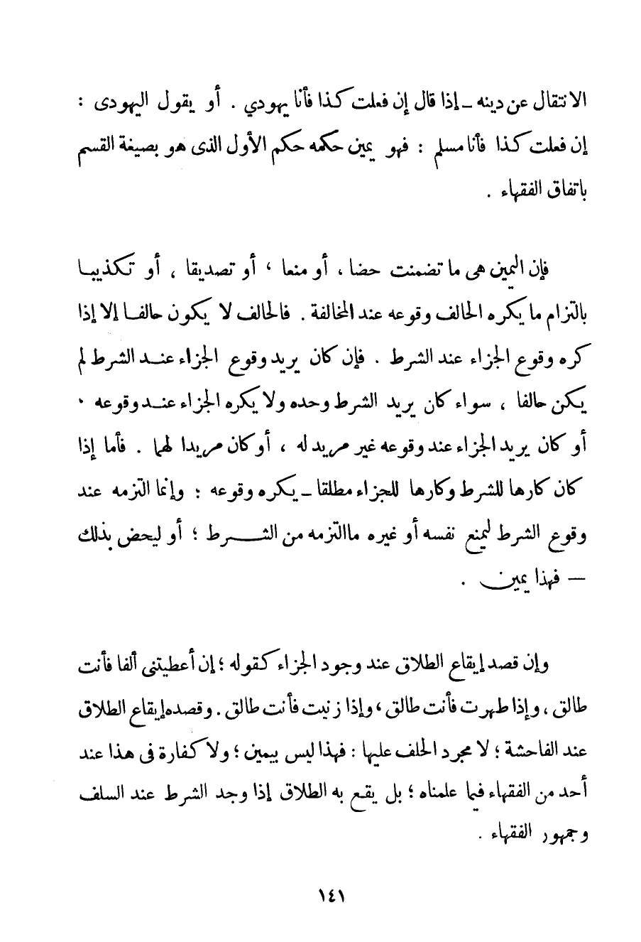 الِانْتِقَالَ عَنْ دِينِهِ - إذَا قَالَ إنْ فَعَلْت كَذَا فَأَنَا يَهُودِيٌّ. أَوْ يَقُولُ الْيَهُودِيُّ: إنْ فَعَلْت كَذَا فَأَنَا مُسْلِمٌ: فَهُوَ يَمِينٌ حُكْمُهُ حُكْمُ الْأَوَّلِ الَّذِي هُوَ بِصِيغَةِ الْقَسَمِ بِاتِّفَاقِ الْفُقَهَاءِ. فَإِنَّ الْيَمِينَ هِيَ مَا تَضَمَّنَتْ حَضًّا أَوْ مَنْعًا أَوْ تَصْدِيقًا أَوْ تَكْذِيبًا بِالْتِزَامِ مَا يَكْرَهُ الْحَالِفُ وُقُوعَهُ عِنْدَ الْمُخَالَفَةِ. فَالْحَالِفُ لَا يَكُونُ حَالِفًا إلَّا إذَا كَرِهَ وُقُوعَ الْجَزَاءِ عِنْدَ الشَّرْطِ. فَإِنْ كَانَ يُرِيدُ وُقُوعَ الْجَزَاءِ عِنْدَ الشَّرْطِ لَمْ يَكُنْ حَالِفًا سَوَاءٌ كَانَ يُرِيدُ الشَّرْطَ وَحْدَهُ وَلَا يَكْرَهُ الْجَزَاءَ عِنْدَ وُقُوعِهِ أَوْ كَانَ يُرِيدُ الْجَزَاءَ عِنْدَ وُقُوعِهِ غَيْرَ مُرِيدٍ لَهُ أَوْ كَانَ مُرِيدًا لَهُمَا. فَأَمَّا إذَا كَانَ كَارِهًا لِلشَّرْطِ وَكَارِهًا لِلْجَزَاءِ مُطْلَقًا - يَكْرَهُ وُقُوعَهُ؛ وَإِنَّمَا الْتَزَمَهُ عِنْدَ وُقُوعِ الشَّرْطِ لِيَمْنَعَ نَفْسَهُ أَوْ غَيْرَهُ مَا الْتَزَمَهُ مِنْ الشَّرْطِ؛ أَوْ لِيَحُضَّ بِذَلِكَ - فَهَذَا يَمِينٌ. وَإِنْ قَصَدَ إيقَاعَ الطَّلَاقِ عِنْدَ وُجُودِ الْجَزَاءِ كَقَوْلِهِ؛ إنْ أَعْطَيْتِنِي أَلْفًا فَأَنْتِ طَالِقٌ وَإِذَا طَهُرْت فَأَنْتِ طَالِقٌ وَإِذَا زَنَيْت فَأَنْتِ طَالِقٌ. وَقَصْدُهُ إيقَاعَ الطَّلَاقِ عِنْدَ الْفَاحِشَةِ؛ لَا مُجَرَّدُ الْحَلِفِ عَلَيْهَا: فَهَذَا لَيْسَ بِيَمِينِ؛ وَلَا كَفَارَّةٍ فِي هَذَا عِنْدَ أَحَدٍ مِنْ الْفُقَهَاءِ فِيمَا عَلِمْنَاهُ؛ بَلْ يَقَعُ بِهِ الطَّلَاقُ إذَا وَجَدَ الشَّرْطَ عِنْدَ السَّلَفِ وَجُمْهُورِ الْفُقَهَاءِ.