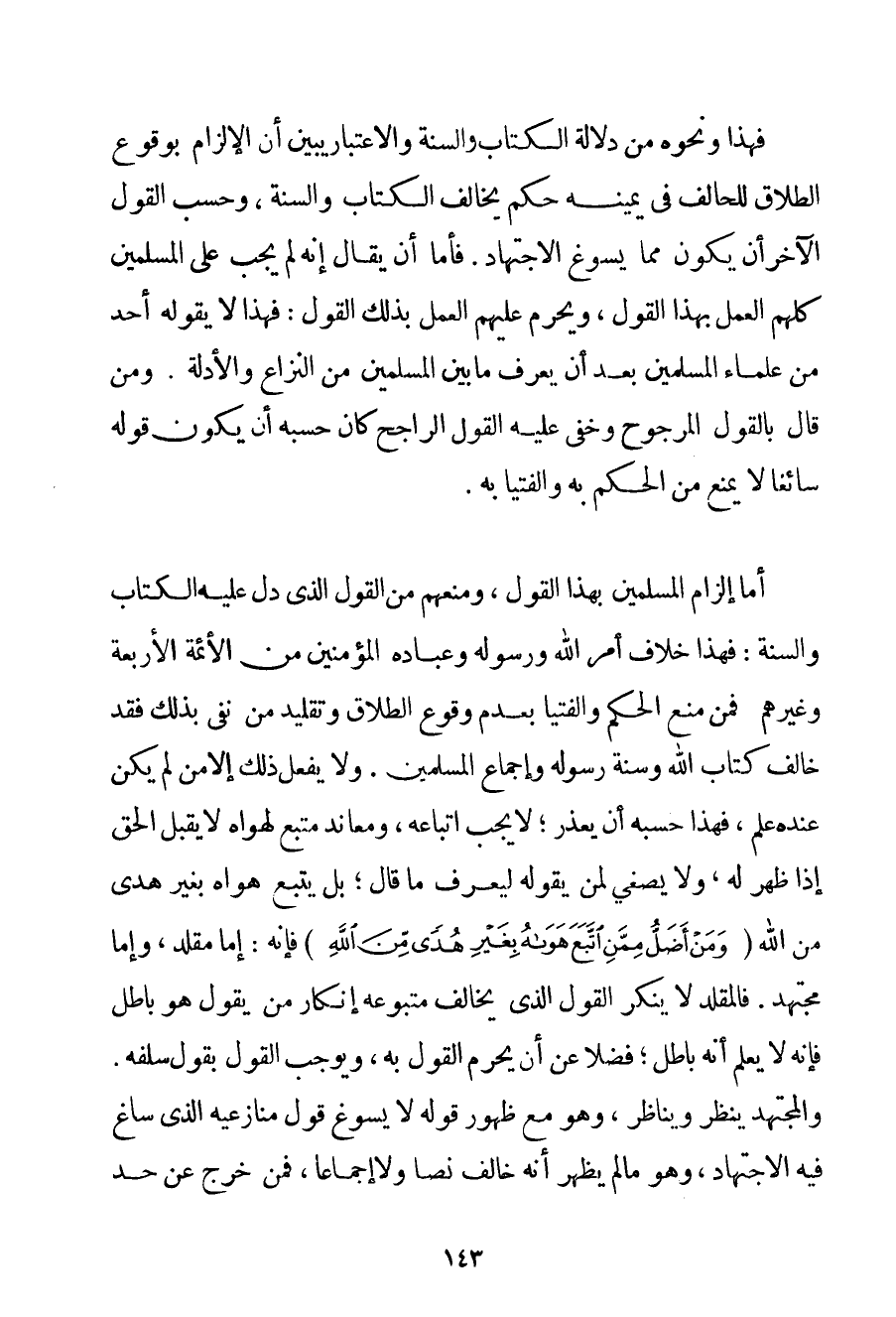 فَهَذَا وَنَحْوُهُ مِنْ دَلَالَةِ الْكِتَابِ وَالسُّنَّةِ وَالِاعْتِبَارِ يُبَيِّنُ أَنَّ الْإِلْزَامَ بِوُقُوعِ الطَّلَاقِ لِلْحَالِفِ فِي يَمِينِهِ حَكَمٌ يُخَالِفُ الْكِتَابَ وَالسُّنَّةَ وَحَسَبُ الْقَوْلِ الْآخَرِ أَنْ يَكُونَ مِمَّا يُسَوِّغُ الِاجْتِهَادَ. فَأَمَّا أَنْ يُقَالَ إنَّهُ لَمْ يَجِبْ عَلَى الْمُسْلِمِينَ كُلِّهِمْ الْعَمَلُ بِهَذَا الْقَوْلِ وَيَحْرُمُ عَلَيْهِمْ الْعَمَلُ بِذَلِكَ الْقَوْلِ: فَهَذَا لَا يَقُولُهُ أَحَدٌ مِنْ عُلَمَاءِ الْمُسْلِمِينَ بَعْدَ أَنْ يَعْرِفَ مَا بَيْنَ الْمُسْلِمِينَ مِنْ النِّزَاعِ وَالْأَدِلَّةِ. وَمَنْ قَالَ بِالْقَوْلِ الْمَرْجُوحِ وَخَفِيَ عَلَيْهِ الْقَوْلُ الرَّاجِحُ كَانَ حَسْبُهُ أَنْ يَكُونَ قَوْلُهُ سَائِغًا لَا يَمْنَعُ مِنْ الْحُكْمِ بِهِ وَالْفُتْيَا بِهِ. أَمَّا إلْزَامُ الْمُسْلِمِينَ بِهَذَا الْقَوْلِ وَمَنْعُهُمْ مِنْ الْقَوْلِ الَّذِي دَلَّ عَلَيْهِ الْكِتَابُ وَالسُّنَّةُ: فَهَذَا خِلَافُ أَمْرِ اللَّهِ وَرَسُولِهِ وَعِبَادِهِ الْمُؤْمِنِينَ مِنْ الْأَئِمَّةِ الْأَرْبَعَةِ وَغَيْرِهِمْ. فَمَنْ مَنَعَ الْحُكْمَ وَالْفُتْيَا بِعَدَمِ وُقُوعِ الطَّلَاقِ وَتَقْلِيدِ مَنْ نَفَى بِذَلِكَ فَقَدْ خَالَفَ كِتَابَ اللَّهِ وَسُنَّةَ رَسُولِهِ وَإِجْمَاعِ الْمُسْلِمِينَ. وَلَا يَفْعَلُ ذَلِكَ إلَّا مَنْ لَمْ يَكُنْ عِنْدَهُ عِلْمٌ فَهَذَا حَسْبُهُ أَنْ يُعْذَرَ؛ لَا يَجِبُ اتِّبَاعُهُ وَمُعَانِدٌ مُتَّبِعٌ لِهَوَاهُ لَا يَقْبَلُ الْحَقَّ إذَا ظَهَرَ لَهُ وَلَا يُصْغِي لِمَنْ يَقُولُهُ لِيَعْرِفَ مَا قَالَ؛ بَلْ يَتَّبِعُ هَوَاهُ بِغَيْرِ هُدًى مِنْ اللَّهِ {وَمَنْ أَضَلُّ مِمَّنَ اتَّبَعَ هَوَاهُ بِغَيْرِ هُدًى مِنَ اللَّهِ} فَإِنَّهُ: إمَّا مُقَلِّدٌ وَإِمَّا مُجْتَهِدٌ. فَالْمُقَلِّدُ لَا يُنْكِرُ الْقَوْلَ الَّذِي يُخَالِفُ مَتْبُوعُهُ إنْكَارَ مَنْ يَقُولُ هُوَ بَاطِلٌ فَإِنَّهُ لَا يَعْلَمُ أَنَّهُ بَاطِلٌ؛ فَضْلًا عَنْ أَنْ يُحْرَمَ الْقَوْلَ بِهِ وَيُوجِبَ الْقَوْلَ بِقَوْلِ سَلَفِهِ. وَالْمُجْتَهِدُ يَنْظُرُ وَيُنَاظِرُ وَهُوَ مَعَ ظُهُورِ قَوْلِهِ لَا يُسَوِّغُ قَوْلَ مُنَازِعِيهِ الَّذِي سَاغَ فِيهِ الِاجْتِهَادُ وَهُوَ مَا لَمْ يَظْهَرْ أَنَّهُ خَالَفَ نَصًّا وَلَا إجْمَاعًا فَمَنْ خَرَجَ عَنْ حَدِّ