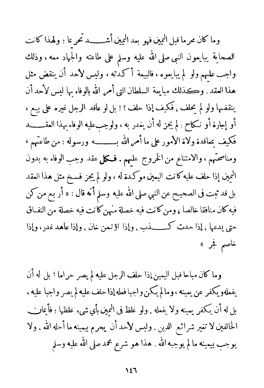 وَمَا كَانَ مُحَرَّمًا قَبْلَ الْيَمِينِ فَهُوَ بَعْدَ الْيَمِينِ أَشَدُّ تَحْرِيمًا؛ وَلِهَذَا كَانَتْ الصَّحَابَةُ يُبَايِعُونَ النَّبِيَّ صَلَّى اللَّهُ عَلَيْهِ وَسَلَّمَ عَلَى طَاعَتِهِ وَالْجِهَادِ مَعَهُ وَذَلِكَ وَاجِبٌ عَلَيْهِمْ وَلَوْ لَمْ يُبَايِعُوهُ فَالْبَيْعَةُ أَكَّدَتْهُ وَلَيْسَ لِأَحَدِ أَنْ يَنْقُضَ مِثْلَ هَذَا الْعَقْدِ. وَكَذَلِكَ مُبَايَعَةُ السُّلْطَانِ الَّتِي أَمَرَ اللَّهُ بِالْوَفَاءِ بِهَا لَيْسَ لِأَحَدِ أَنْ يَنْقُضَهَا وَلَوْ لَمْ يَحْلِفْ فَكَيْفَ إذَا حَلَفَ بَلْ لَوْ عَاقَدَ الرَّجُلُ غَيْرَهُ عَلَى بَيْعٍ أَوْ إجَارَةٍ أَوْ نِكَاحٍ: لَمْ يَجُزْ لَهُ أَنْ يَغْدِرَ بِهِ وَلَوَجَبَ عَلَيْهِ الْوَفَاءُ بِهَذَا الْعَقْدِ فَكَيْفَ بِمُعَاقَدَةِ وُلَاةِ الْأُمُورِ عَلَى مَا أَمَرَ اللَّهُ بِهِ وَرَسُولُهُ: مِنْ طَاعَتِهِمْ وَمُنَاصَحَتِهِمْ وَالِامْتِنَاعِ مِنْ الْخُرُوجِ عَلَيْهِمْ. فَكُلُّ عَقْدٍ وَجَبَ الْوَفَاءُ بِهِ بِدُونِ الْيَمِينِ إذَا حَلَفَ عَلَيْهِ كَانَتْ الْيَمِينُ مُوَكَّدَةً لَهُ وَلَوْ لَمْ يَجُزْ فَسْخُ مِثْلِ هَذَا الْعَقْدِ بَلْ قَدْ ثَبَتَ فِي الصَّحِيحِ عَنْ النَّبِيِّ صَلَّى اللَّهُ عَلَيْهِ وَسَلَّمَ أَنَّهُ قَالَ: {أَرْبَعٌ مَنْ كُنَّ فِيهِ كَانَ مُنَافِقًا خَالِصًا وَمَنْ كَانَتْ فِيهِ خَصْلَةٌ مِنْهُنَّ كَانَتْ فِيهِ خَصْلَةٌ مِنْ النِّفَاقِ حَتَّى يَدَعَهَا إذَا حَدَّثَ كَذَبَ وَإِذَا اُؤْتُمِنَ خَانَ وَإِذَا عَاهَدَ غَدَرَ وَإِذَا خَاصَمَ فَجَرَ} . وَمَا كَانَ مُبَاحًا قَبْلَ الْيَمِينِ إذَا حَلَفَ الرَّجُلُ عَلَيْهِ لَمْ يَصِرْ حَرَامًا؛ بَلْ لَهُ أَنْ يَفْعَلَهُ وَيُكَفِّرَ عَنْ يَمِينِهِ وَمَا لَمْ يَكُنْ وَاجِبًا فِعْلُهُ إذَا حَلَفَ عَلَيْهِ لَمْ يَصِرْ وَاجِبًا عَلَيْهِ بَلْ لَهُ أَنْ يُكَفِّرَ يَمِينَهُ وَلَا يَفْعَلُهُ وَلَوْ غَلَّظَ فِي الْيَمِينِ بِأَيِّ شَيْءٍ غَلَّظَهَا؛ فَأَيْمَانُ الْحَالِفِينَ لَا تُغَيَّرُ شَرَائِعَ الدِّينِ وَلَيْسَ لِأَحَدِ أَنْ يُحَرِّمَ بِيَمِينِهِ مَا أَحَلَّهُ اللَّهُ وَلَا يُوجِبَ بِيَمِينِهِ مَا لَمْ يُوجِبْهُ اللَّهُ. هَذَا هُوَ شَرْعُ مُحَمَّدٍ صَلَّى اللَّهُ عَلَيْهِ وَسَلَّمَ
