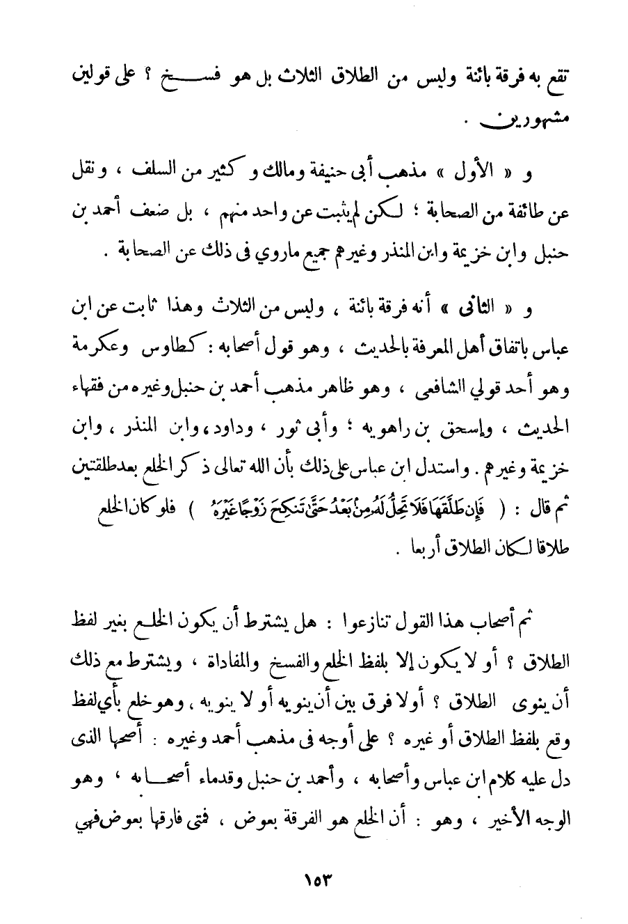 تَقَعُ بِهِ فُرْقَةٌ بَائِنَةٌ وَلَيْسَ مِنْ الطَّلَاقِ الثَّلَاثِ بَلْ هُوَ فَسْخٌ؟ عَلَى قَوْلَيْنِ مَشْهُورَيْنِ. و " الْأَوَّلُ " مَذْهَبُ أَبِي حَنِيفَةَ وَمَالِك وَكَثِيرٍ مِنْ السَّلَفِ وَنُقِلَ عَنْ طَائِفَة مِنْ الصَّحَابَةِ؛ لَكِنْ لَمْ يَثْبُتْ عَنْ وَاحِدٍ مِنْهُمْ بَلْ ضَعَّفَ أَحْمَد بْنُ حَنْبَلٍ وَابْنُ خُزَيْمَة وَابْنُ الْمُنْذِرِ وَغَيْرُهُمْ جَمِيعَ مَا رُوِيَ فِي ذَلِكَ عَنْ الصَّحَابَةِ. و " الثَّانِي " أَنَّهُ فُرْقَةٌ بَائِنَةٌ وَلَيْسَ مِنْ الثَّلَاثِ وَهَذَا ثَابِتٌ عَنْ ابْنِ عَبَّاسٍ بِاتِّفَاقِ أَهْلِ الْمَعْرِفَةِ بِالْحَدِيثِ وَهُوَ قَوْلُ أَصْحَابِهِ: كطاوس وَعِكْرِمَةَ وَهُوَ أَحَدُ قَوْلَيْ الشَّافِعِيِّ وَهُوَ ظَاهِرُ مَذْهَبِ أَحْمَد بْنِ حَنْبَلٍ وَغَيْرِهِ مِنْ فُقَهَاءِ الْحَدِيثِ وَإِسْحَاقَ بْنِ رَاهَوَيْه؛ وَأَبِي ثَوْرٍ ودَاوُد وَابْنِ الْمُنْذِرِ وَابْنِ خُزَيْمَة وَغَيْرِهِمْ. وَاسْتَدَلَّ ابْنُ عَبَّاسٍ عَلَى ذَلِكَ بِأَنَّ اللَّهَ تَعَالَى ذَكَرَ الْخُلْعَ بَعْدَ طَلْقَتَيْنِ ثُمَّ قَالَ: {فَإِنْ طَلَّقَهَا فَلَا تَحِلُّ لَهُ مِنْ بَعْدُ حَتَّى تَنْكِحَ زَوْجًا غَيْرَهُ} فَلَوْ كَانَ الْخُلْعُ طَلَاقًا لَكَانَ الطَّلَاقُ أَرْبَعًا. ثُمَّ أَصْحَابُ هَذَا الْقَوْلِ تَنَازَعُوا: هَلْ يُشْتَرَطُ أَنْ يَكُونَ الْخُلْعُ بِغَيْرِ لَفْظِ الطَّلَاقِ؟ أَوْ لَا يَكُونُ إلَّا بِلَفْظِ الْخُلْعِ وَالْفَسْخِ وَالْمُفَادَاةِ وَيُشْتَرَطُ مَعَ ذَلِكَ أَنْ لَا يَنْوِيَ الطَّلَاقَ؟ أَوْ لَا فَرْقَ بَيْنَ أَنْ يَنْوِيَهُ أَوْ لَا يَنْوِيَهُ وَهُوَ خُلْعٌ بِأَيِّ لَفْظٍ وَقَعَ بِلَفْظِ الطَّلَاقِ أَوْ غَيْرِهِ؟ عَلَى أَوْجُهٍ فِي مَذْهَبِ أَحْمَد وَغَيْرِهِ: أَصَحُّهَا الَّذِي دَلَّ عَلَيْهِ كَلَامُ ابْنِ عَبَّاسٍ وَأَصْحَابِهِ وَأَحْمَد بْنِ حَنْبَلٍ وَقُدَمَاءِ أَصْحَابِهِ وَهُوَ الْوَجْهُ الْأَخِيرُ وَهُوَ: أَنَّ الْخُلْعَ هُوَ الْفُرْقَةُ بِعِوَضِ فَمَتَى فَارَقَهَا بِعِوَضِ فَهِيَ