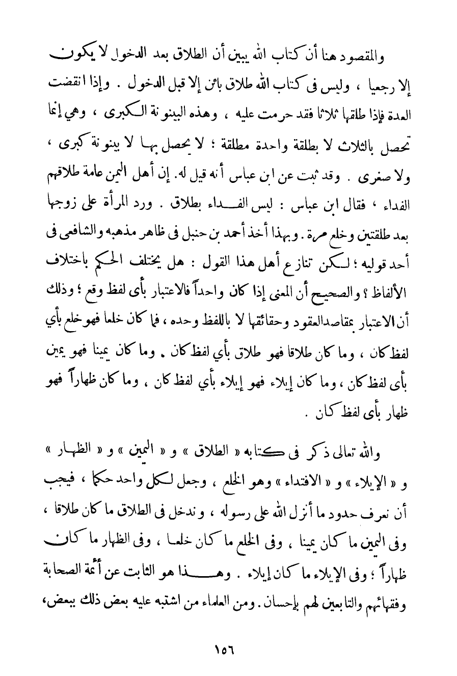 وَالْمَقْصُودُ هُنَا أَنَّ كِتَابَ اللَّهِ يُبَيِّنُ أَنَّ الطَّلَاقَ بَعْدَ الدُّخُولِ لَا يَكُونُ إلَّا رَجْعِيًّا وَلَيْسَ فِي كِتَابِ اللَّهِ طَلَاقٌ بَائِنٌ إلَّا قَبْلَ الدُّخُولِ. وَإِذَا انْقَضَتْ الْعِدَّةُ فَإِذَا طَلَّقَهَا ثَلَاثًا فَقَدْ حَرُمَتْ عَلَيْهِ وَهَذِهِ الْبَيْنُونَةُ الْكُبْرَى وَهِيَ إنَّمَا تَحْصُلُ بِالثَّلَاثِ لَا بِطَلْقَةِ وَاحِدَةٍ مُطْلَقَةٍ؛ لَا يَحْصُلُ بِهَا لَا بَيْنُونَةٌ كُبْرَى وَلَا صُغْرَى. وَقَدْ ثَبَتَ عَنْ ابْنِ عَبَّاسٍ أَنَّهُ قِيلَ لَهُ. إنَّ أَهْلَ الْيَمَنِ عَامَّةً طَلَاقُهُمْ الْفِدَاءُ فَقَالَ ابْنُ عَبَّاسٍ: لَيْسَ الْفِدَاءُ بِطَلَاقِ. وَرَدَّ الْمَرْأَةَ عَلَى زَوْجِهَا بَعْدَ طَلْقَتَيْنِ وَخُلْعٍ مَرَّةً. وَبِهَذَا أَخَذَ أَحْمَد بْنُ حَنْبَلٍ فِي ظَاهِرِ مَذْهَبِهِ وَالشَّافِعِيُّ فِي أَحَدِ قَوْلَيْهِ؛ لَكِنْ تَنَازَعَ أَهْلُ هَذَا الْقَوْلِ: هَلْ يَخْتَلِفُ الْحُكْمُ بِاخْتِلَافِ الْأَلْفَاظِ؟ وَالصَّحِيحُ أَنَّ الْمَعْنَى إذَا كَانَ وَاحِدًا فَالِاعْتِبَارُ بِأَيِّ لَفْظٍ وَقَعَ؛ وَذَلِكَ أَنَّ الِاعْتِبَارَ بِمَقَاصِدِ الْعُقُودِ وَحَقَائِقِهَا لَا بِاللَّفْظِ وَحْدَهُ فَمَا كَانَ خُلْعًا فَهُوَ خُلْعٌ بِأَيِّ لَفْظٍ كَانَ وَمَا كَانَ طَلَاقًا فَهُوَ طَلَاقٌ بِأَيِّ لَفْظٍ كَانَ وَمَا كَانَ يَمِينًا فَهُوَ يَمِينٌ بِأَيِّ لَفْظٍ كَانَ وَمَا كَانَ إيلَاءٌ فَهُوَ إيلَاءٌ بِأَيِّ لَفْظٍ كَانَ وَمَا كَانَ ظِهَارًا فَهُوَ ظِهَارٌ بِأَيِّ لَفْظٍ كَانَ. وَاَللَّهُ تَعَالَى ذَكَرَ فِي كِتَابِهِ " الطَّلَاقُ " و " الْيَمِينُ " و " الظِّهَارُ " و " الْإِيلَاءُ " و " الِافْتِدَاءُ " وَهُوَ الْخُلْعُ وَجَعَلَ لِكُلِّ وَاحِدٍ حُكْمًا فَيَجِبُ أَنْ نَعْرِفَ حُدُودَ مَا أَنْزَلَ اللَّهُ عَلَى رَسُولِهِ وَنَدْخُلَ فِي الطَّلَاقِ مَا كَانَ طَلَاقًا وَفِي الْيَمِينِ مَا كَانَ يَمِينًا وَفِي الْخُلْعِ مَا كَانَ خُلْعًا وَفِي الظِّهَارِ مَا كَانَ ظِهَارًا؛ وَفِي الْإِيلَاءِ مَا كَانَ إيلَاءً. وَهَذَا هُوَ الثَّابِتُ عَنْ أَئِمَّةِ الصَّحَابَةِ وَفُقَهَائِهِمْ وَالتَّابِعِينَ لَهُمْ بِإِحْسَانِ. وَمِنْ الْعُلَمَاءِ مَنْ اشْتَبَهَ عَلَيْهِ بَعْضُ ذَلِكَ بِبَعْضِ