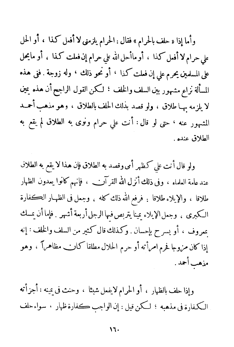 وَأَمَّا إذَا " حَلَفَ بِالْحَرَامِ " فَقَالَ: الْحَرَامُ يَلْزَمُنِي لَا أَفْعَلُ كَذَا أَوْ الْحِلُّ عَلَيَّ حَرَامٌ لَا أَفْعَلُ كَذَا أَوْ مَا أَحَلَّ اللَّهُ عَلَيَّ حَرَامٌ إنْ فَعَلْت كَذَا أَوْ مَا يَحِلُّ عَلَى الْمُسْلِمِينَ يَحْرُمُ عَلَيَّ إنْ فَعَلْت كَذَا أَوْ نَحْوَ ذَلِكَ وَلَهُ زَوْجَةٌ. فَفِي هَذِهِ الْمَسْأَلَةِ نِزَاعٌ مَشْهُورٌ بَيْنَ السَّلَفِ وَالْخَلَفِ؛ لَكِنَّ الْقَوْلَ الرَّاجِحَ أَنَّ هَذِهِ يَمِينٌ لَا يَلْزَمُهُ بِهَا طَلَاقٌ وَلَوْ قَصَدَ بِذَلِكَ الْحَلِفَ بِالطَّلَاقِ وَهُوَ مَذْهَبُ أَحْمَد الْمَشْهُورُ عَنْهُ حَتَّى لَوْ قَالَ: أَنْتِ عَلَيَّ حَرَامٌ وَنَوَى بِهِ الطَّلَاقَ لَمْ يَقَعْ بِهِ الطَّلَاقُ عِنْدَهُ. وَلَوْ قَالَ أَنْتِ عَلَيَّ كَظَهْرِ أُمِّي وَقَصَدَ بِهِ الطَّلَاقَ فَإِنَّ هَذَا لَا يَقَعُ بِهِ الطَّلَاقُ عِنْدَ عَامَّةِ الْعُلَمَاءِ وَفِي ذَلِكَ أَنْزَلَ اللَّهُ الْقُرْآنَ فَإِنَّهُمْ كَانُوا يَعُدُّونَ الظِّهَارَ طَلَاقًا وَالْإِيلَاءَ طَلَاقًا: فَرَفَعَ اللَّهُ ذَلِكَ كُلَّهُ وَجَعَلَ فِي الظِّهَارِ الْكَفَّارَةَ الْكُبْرَى وَجَعَلَ الْإِيلَاءَ يَمِينًا يَتَرَبَّصُ فِيهَا الرَّجُلُ أَرْبَعَةَ أَشْهُرٍ. فَإِمَّا أَنْ يُمْسِكَ بِمَعْرُوفِ أَوْ يُسَرِّحَ بِإِحْسَانِ. وَكَذَلِكَ قَالَ كَثِيرٌ مِنْ السَّلَفِ وَالْخَلَفِ: إنَّهُ إذَا كَانَ مُزَوِّجًا فَحَرَّمَ امْرَأَتَهُ أَوْ حَرَّمَ الْحَلَالَ مُطْلَقًا كَانَ مُظَاهِرًا وَهُوَ مَذْهَبُ أَحْمَد. وَإِذَا حَلَفَ بِالظِّهَارِ أَوْ الْحَرَامِ لَا يَفْعَلُ شَيْئًا وَحَنِثَ فِي يَمِينِهِ: أَجْزَأَتْهُ الْكَفَّارَةُ فِي مَذْهَبِهِ؛ لَكِنْ قِيلَ: إنَّ الْوَاجِبَ كَفَّارَةُ ظِهَارٍ سَوَاءٌ حَلَفَ