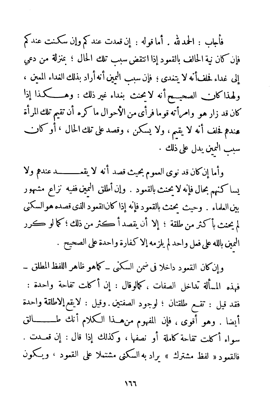 فَأَجَابَ: الْحَمْدُ لِلَّهِ. أَمَّا قَوْلُهُ: إنْ قَعَدْت عِنْدَكُمْ وَإِنْ سَكَنْت عِنْدَكُمْ فَإِنْ كَانَ نِيَّةُ الْحَالِفِ بِالْقُعُودِ إذَا انْتَقَضَ سَبَبُ تِلْكَ الْحَالِ؛ بِمَنْزِلَةِ مَنْ دُعِيَ إلَى غَدَاءٍ فَحَلَفَ أَنَّهُ لَا يَتَغَدَّى؛ فَإِنَّ سَبَبَ الْيَمِينِ أَنَّهُ أَرَادَ بِذَلِكَ الْغَدَاءَ الْمُعَيَّنَ وَلِهَذَا كَانَ الصَّحِيحُ أَنَّهُ لَا يَحْنَثُ بِغَدَاءِ غَيْرِ ذَلِكَ: وَهَكَذَا إذَا كَانَ قَدْ زَارَ هُوَ وَامْرَأَتُهُ قَوْمًا فَرَأَى مِنْ الْأَحْوَالِ مَا كَرِهَ أَنْ تُقِيمَ تِلْكَ الْمَرْأَةُ عِنْدَهُمْ فَحَلَفَ أَنَّهُ لَا يُقِيمُ وَلَا يَسْكُنُ وَقَصَدَ عَلَى تِلْكَ الْحَالِ أَوْ كَانَ سَبَبُ الْيَمِينِ يَدُلُّ عَلَى ذَلِكَ. وَأَمَّا إنْ كَانَ قَدْ نَوَى الْعُمُومَ بِحَيْثُ قَصَدَ أَنَّهُ لَا يَقْعُدُ عِنْدَهُمْ وَلَا يُسَاكِنُهُمْ بِحَالِ فَإِنَّهُ لَا يَحْنَثُ بِالْقُعُودِ. وَإِنْ أَطْلَقَ الْيَمِينَ فَفِيهِ نِزَاعٌ مَشْهُورٌ بَيْنَ الْعُلَمَاءِ. وَحَيْثُ يَحْنَثُ بِالْقُعُودِ فَإِنَّهُ إذَا كَانَ الْقُعُودُ الَّذِي قَصَدَهُ هُوَ السُّكْنَى لَمْ يَحْنَثْ بِأَكْثَرَ مِنْ طَلْقَةٍ؛ إلَّا أَنْ يَقْصِدَ أَكْثَرَ مِنْ ذَلِكَ؛ كَمَا لَوْ كَرَّرَ الْيَمِينَ بِاَللَّهِ عَلَى فِعْلٍ وَاحِدٍ لَمْ يَلْزَمْهُ إلَّا كَفَّارَةٌ وَاحِدَةٌ عَلَى الصَّحِيحِ. وَإِنْ كَانَ الْقُعُودُ دَاخِلًا فِي ضِمْنِ السُّكْنَى - كَمَا هُوَ ظَاهِرُ اللَّفْظِ الْمُطْلَقِ - فَهَذِهِ الْمَسْأَلَةُ تَدَاخُلُ الصِّفَاتِ كَمَا لَوْ قَالَ: إنْ أَكَلْت تُفَّاحَةً وَاحِدَةً: فَقَدْ قِيلَ: تَقَعُ طَلْقَتَانِ؛ لِوُجُودِ الصِّفَتَيْنِ. وَقِيلَ: لَا يَقَعُ إلَّا طَلْقَة وَاحِدَةٌ أَيْضًا. وَهُوَ أَقْوَى فَإِنَّ الْمَفْهُومَ مِنْ هَذَا الْكَلَامِ أَنَّك طَالِقٌ سَوَاءٌ أَكَلَتْ تُفَّاحَةً كَامِلَةً أَوْ نِصْفَهَا وَكَذَلِكَ إذَا قَالَ: إنْ قَعَدْت. فَالْقُعُودُ " لَفْظٌ مُشْتَرَكٌ " يُرَادُ بِهِ السُّكْنَى مُشْتَمِلًا عَلَى الْعُقُودِ وَيَكُونُ