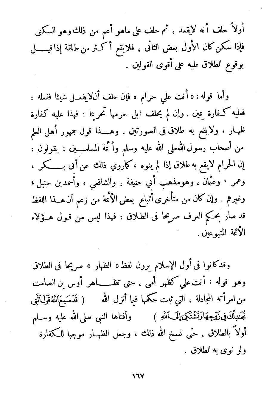أَوَّلًا حَلَفَ أَنَّهُ لَا يَقْعُدُ ثُمَّ حَلَفَ عَلَى مَا هُوَ أَعَمُّ مِنْ ذَلِكَ وَهُوَ السُّكْنَى فَإِذَا سَكَنَ كَانَ الْأَوَّلُ بَعْضَ الثَّانِي فَلَا يَقَعُ أَكْثَرُ مِنْ طَلْقَةٍ إذَا قِيلَ بِوُقُوعِ الطَّلَاقِ عَلَيْهِ عَلَى أَقْوَى الْقَوْلَيْنِ. وَأَمَّا قَوْلُهُ: " أَنْتِ عَلَيَّ حَرَامٌ " فَإِنْ حَلَفَ أَنْ لَا يَفْعَلَ شَيْئًا فَفَعَلَهُ: فَعَلَيْهِ كَفَّارَةُ يَمِينٍ. وَإِنْ لَمْ يَحْلِفْ؛ بَلْ حَرَّمَهَا تَحْرِيمًا: فَهَذَا عَلَيْهِ كَفَّارَةُ ظِهَارٍ وَلَا يَقَعُ بِهِ طَلَاقٌ فِي الصُّورَتَيْنِ. وَهَذَا قَوْلُ جُمْهُورِ أَهْلِ الْعِلْمِ مِنْ أَصْحَابِ رَسُولِ اللَّهِ صَلَّى اللَّهُ عَلَيْهِ وَسَلَّمَ وَأَئِمَّةِ الْمُسْلِمِينَ: يَقُولُونَ: إنَّ الْحَرَامَ لَا يَقَعُ بِهِ طَلَاقٌ إذَا لَمْ يَنْوِهِ كَمَا رُوِيَ ذَلِكَ عَنْ أَبِي بَكْرٍ وَعُمَرَ وَعُثْمَانَ وَهُوَ مَذْهَبُ أَبِي حَنِيفَةَ وَالشَّافِعِيِّ وَأَحْمَد بْنِ حَنْبَلٍ وَغَيْرِهِمْ وَإِنْ كَانَ مِنْ مُتَأَخِّرِي أَتْبَاعِ بَعْضِ الْأَئِمَّةِ مَنْ زَعَمَ أَنَّ هَذَا اللَّفْظَ قَدْ صَارَ بِحُكْمِ الْعُرْفِ صَرِيحًا فِي الطَّلَاقِ: فَهَذَا لَيْسَ مِنْ قَوْلِ هَؤُلَاءِ الْأَئِمَّةِ الْمَتْبُوعِينَ. وَقَدْ كَانُوا فِي أَوَّلِ الْإِسْلَامِ يَرَوْنَ لَفْظَ " الظِّهَارِ " صَرِيحًا فِي الطَّلَاقِ وَهُوَ قَوْلُهُ: أَنْتِ عَلَيَّ كَظَهْرِ أُمِّي حَتَّى تَظَاهَرَ أَوْسُ بْنُ الصَّامِتِ مِنْ امْرَأَتِهِ الْمُجَادِلَةِ الَّتِي ثَبَتَ حُكْمُهَا فِيمَا أَنْزَلَ اللَّهُ {قَدْ سَمِعَ اللَّهُ قَوْلَ الَّتِي تُجَادِلُكَ فِي زَوْجِهَا وَتَشْتَكِي إلَى اللَّهِ} وَأَفْتَاهَا النَّبِيُّ صَلَّى اللَّهُ عَلَيْهِ وَسَلَّمَ أَوَّلًا بِالطَّلَاقِ حَتَّى نَسَخَ اللَّهُ ذَلِكَ وَجَعَلَ الظِّهَارَ مُوجِبًا لِلْكَفَّارَةِ وَلَوْ نَوَى بِهِ الطَّلَاقَ.