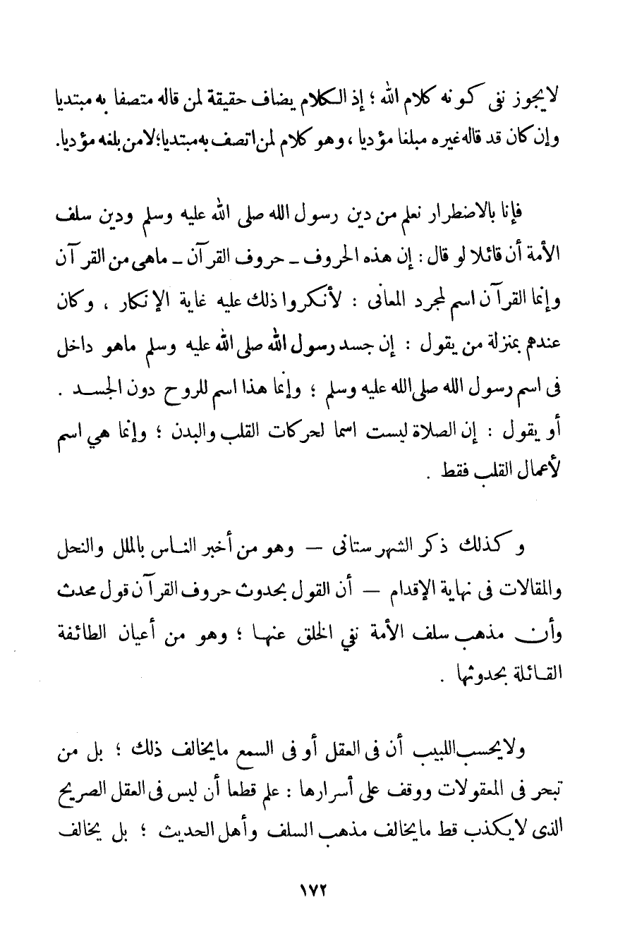 لَا يَجُوزُ نَفْيُ كَوْنِهِ كَلَامَ اللَّهِ؛ إذْ الْكَلَامُ يُضَافُ حَقِيقَةً لِمَنْ قَالَهُ مُتَّصِفًا بِهِ مُبْتَدِيًا وَإِنْ كَانَ قَدْ قَالَهُ غَيْرُهُ مُبَلِّغًا مُؤَدِّيًا وَهُوَ كَلَامٌ لِمَنْ اتَّصَفَ بِهِ مُبْتَدِيًا؛ لَا مَنْ بَلَغَهُ مُؤَدِّيًا. فَإِنَّا بِالِاضْطِرَارِ نَعْلَمُ مِنْ دِينِ رَسُولِ اللَّهِ صَلَّى اللَّهُ عَلَيْهِ وَسَلَّمَ وَدِينِ سَلَفِ الْأُمَّةِ أَنَّ قَائِلًا لَوْ قَالَ: إنَّ هَذِهِ الْحُرُوفَ - حُرُوفُ الْقُرْآنِ - مَا هِيَ مِنْ الْقُرْآنِ وَإِنَّمَا الْقُرْآنُ اسْمٌ لِمُجَرَّدِ الْمَعَانِي: لَأَنْكَرُوا ذَلِكَ عَلَيْهِ غَايَةَ الْإِنْكَارِ وَكَانَ عِنْدَهُمْ بِمَنْزِلَةِ مَنْ يَقُولُ: إنَّ جَسَدَ رَسُولِ اللَّهِ صَلَّى اللَّهُ عَلَيْهِ وَسَلَّمَ مَا هُوَ دَاخِلٌ فِي اسْمِ رَسُولِ اللَّهِ صَلَّى اللَّهُ عَلَيْهِ وَسَلَّمَ وَإِنَّمَا هَذَا اسْمٌ لِلرُّوحِ دُونَ الْجَسَدِ. أَوْ يَقُولُ: إنَّ الصَّلَاةَ لَيْسَتْ اسْمًا لِحَرَكَاتِ الْقَلْبِ وَالْبَدَنِ؛ وَإِنَّمَا هِيَ اسْمٌ لِأَعْمَالِ الْقَلْبِ فَقَطْ. وَكَذَلِكَ ذَكَرَ الشَّهْرَستَانِي - وَهُوَ مِنْ أَخْبَرِ النَّاسِ بِالْمِلَلِ وَالنِّحَلِ وَالْمَقَالَاتِ فِي نِهَايَةِ الْإِقْدَامِ - أَنَّ الْقَوْلَ بِحُدُوثِ حُرُوفِ الْقُرْآنِ قَوْلٌ مُحْدَثٌ وَأَنَّ مَذْهَبَ سَلَفِ الْأُمَّةِ نَفْيُ الْخَلْقِ عَنْهَا؛ وَهُوَ مِنْ أَعْيَانِ الطَّائِفَةِ الْقَائِلَةِ بِحُدُوثِهَا. وَلَا يَحْسَبُ اللَّبِيبُ أَنَّ فِي الْعَقْلِ أَوْ فِي السَّمْعِ مَا يُخَالِفُ ذَلِكَ؛ بَلْ مَنْ تَبَحَّرَ فِي الْمَقُولَاتِ وَوَقَفَ عَلَى أَسْرَارِهَا: عَلِمَ قَطْعًا أَنْ لَيْسَ فِي الْعَقْلِ الصَّرِيحِ الَّذِي لَا يَكْذِبُ قَطُّ مَا يُخَالِفُ مَذْهَبَ السَّلَفِ وَأَهْلِ الْحَدِيثِ؛ بَلْ يُخَالِفُ