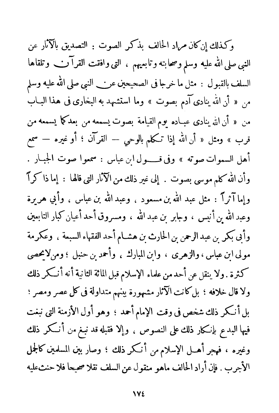 وَكَذَلِكَ إنْ كَانَ مُرَادُ الْحَالِفِ بِذِكْرِ الصَّوْتِ: التَّصْدِيقُ بِالْآثَارِ عَنْ النَّبِيِّ صَلَّى اللَّهُ عَلَيْهِ وَسَلَّمَ وَصَحَابَتِهِ وَتَابِعِيهِمْ الَّتِي وَافَقَتْ الْقُرْآنَ وَتَلَقَّاهَا السَّلَفُ بِالْقَبُولِ: مِثْلَ مَا خَرَّجَا فِي الصَّحِيحَيْنِ عَنْ النَّبِيِّ صَلَّى اللَّهُ عَلَيْهِ وَسَلَّمَ مِنْ {أَنَّ اللَّهَ يُنَادِي آدَمَ بِصَوْتِ} وَمَا اسْتَشْهَدَ بِهِ الْبُخَارِيُّ فِي هَذَا الْبَابِ مِنْ {أَنَّ اللَّهَ يُنَادِي عِبَادَهُ يَوْمَ الْقِيَامَةِ بِصَوْتِ يَسْمَعُهُ مَنْ بَعُدَ كَمَا يَسْمَعُهُ مَنْ قَرُبَ} وَمِثْلَ {أَنَّ اللَّهَ إذَا تَكَلَّمَ بِالْوَحْيِ - الْقُرْآنِ؛ أَوْ غَيْرِهِ - سَمِعَ أَهْلُ السَّمَوَاتِ صَوْتَهُ} وَفِي قَوْلِ ابْنِ عَبَّاسٍ: سَمِعُوا صَوْتَ الْجَبَّارِ. وَأَنَّ اللَّهَ كَلَّمَ مُوسَى بِصَوْتِ. إلَى غَيْرِ ذَلِكَ مِنْ الْآثَارِ الَّتِي قَالَهَا: إمَّا ذَاكِرًا وَإِمَّا آثِرًا: مِثْلَ عَبْدِ اللَّهِ بْنِ مَسْعُودٍ وَعَبْدِ اللَّهِ بْنِ عَبَّاسٍ وَأَبِي هُرَيْرَةَ وَعَبْدِ اللَّهِ بْنِ أنيس وَجَابِرِ بْنِ عَبْدِ اللَّهِ وَمَسْرُوقٍ أَحَدِ أَعْيَانِ كِبَارِ التَّابِعِينَ وَأَبِي بَكْرِ بْنِ عَبْدِ الرَّحْمَنِ بْنِ الْحَارِثِ بْنِ هِشَامٍ أَحَدِ الْفُقَهَاءِ السَّبْعَةِ وَعِكْرِمَةَ مَوْلَى ابْنِ عَبَّاسٍ وَالزُّهْرِيِّ وَابْنِ الْمُبَارَكِ وَأَحْمَد بْنِ حَنْبَلٍ؛ وَمَنْ لَا يُحْصَى كَثْرَةً. وَلَا يُنْقَلُ عَنْ أَحَدٍ مِنْ عُلَمَاءِ الْإِسْلَامِ قَبْلَ الْمِائَةِ الثَّانِيَةِ أَنَّهُ أَنْكَرَ ذَلِكَ وَلَا قَالَ خِلَافَهُ؛ بَلْ كَانَتْ الْآثَارُ مَشْهُورَةٌ بَيْنَهُمْ مُتَدَاوَلَةٌ فِي كُلِّ عَصْرٍ وَمِصْرٍ؛ بَلْ أَنْكَرَ ذَلِكَ شَخْصٌ فِي وَقْتِ الْإِمَامِ أَحْمَد؛ وَهُوَ أَوَّلُ الْأَزْمِنَةِ الَّتِي نَبَغَتْ فِيهَا الْبِدَعُ بِإِنْكَارِ ذَلِكَ عَلَى النُّصُوصِ وَإِلَّا فَقَبْلَهُ قَدْ نَبَغَ مَنْ أَنْكَرَ ذَلِكَ وَغَيْرَهُ فَهَجَرَ أَهْلُ الْإِسْلَامِ مَا أَنْكَرَ ذَلِكَ. وَصَارَ بَيْنَ الْمُسْلِمِينَ كَالْجَمَلِ الْأَجْرَبِ. فَإِنْ أَرَادَ الْحَالِفُ مَا هُوَ مَنْقُولٌ عَنْ السَّلَفِ نَقْلًا صَحِيحًا فَلَا حِنْثَ عَلَيْهِ