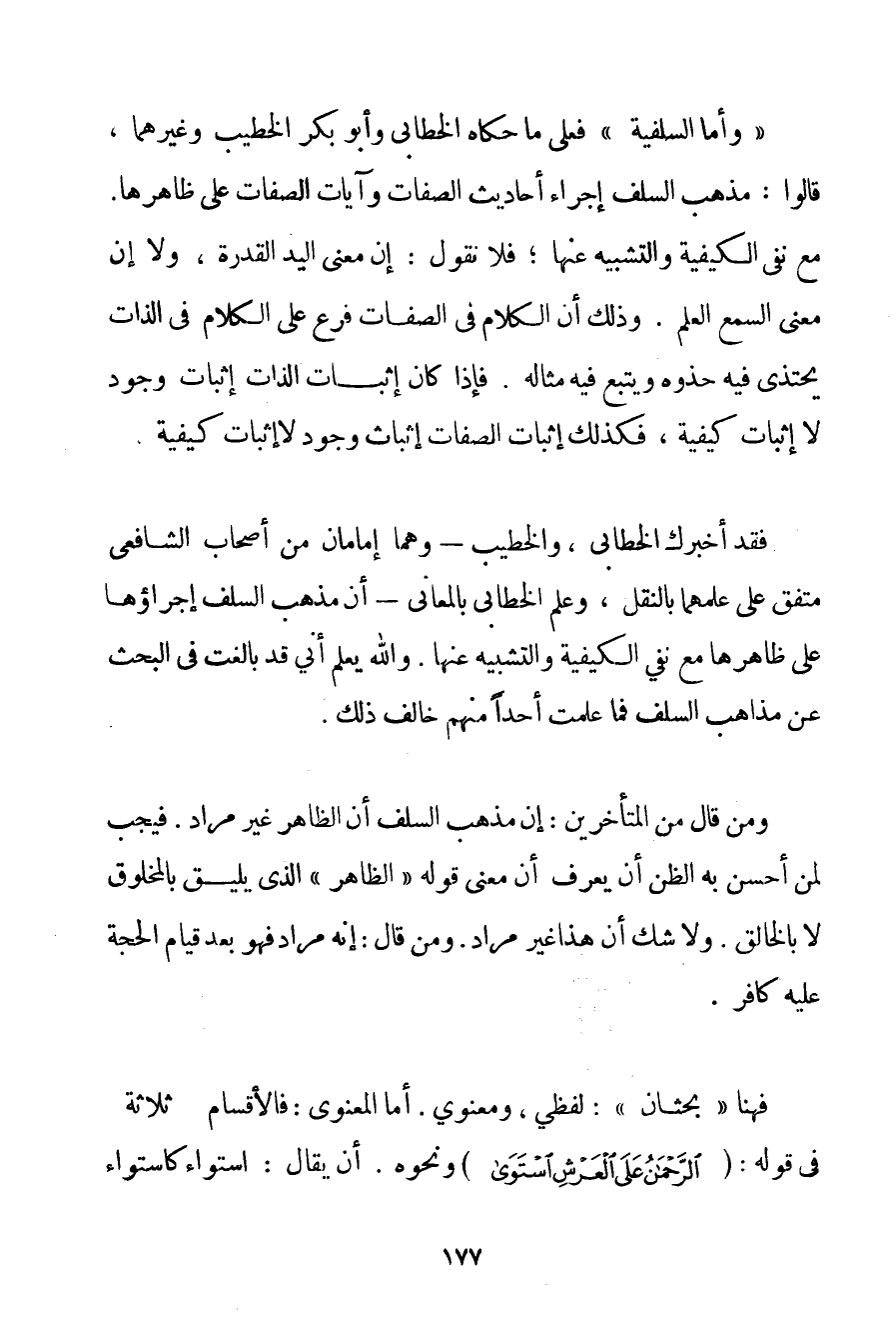 " وَأَمَّا السَّلَفِيَّةُ " فَعَلَى مَا حَكَاهُ الخطابي وَأَبُو بَكْرٍ الْخَطِيبُ وَغَيْرُهُمَا قَالُوا: مَذْهَبُ السَّلَفِ إجْرَاءُ أَحَادِيثِ الصِّفَاتِ وَآيَاتِ الصِّفَاتِ عَلَى ظَاهِرِهَا. مَعَ نَفْيِ الْكَيْفِيَّةِ وَالتَّشْبِيهِ عَنْهَا؛ فَلَا نَقُولُ: إنَّ مَعْنَى الْيَدِ الْقُدْرَةُ وَلَا إنَّ مَعْنَى السَّمْعِ الْعِلْمُ. وَذَلِكَ أَنَّ الْكَلَامَ فِي الصِّفَاتِ فَرْعٌ عَلَى الْكَلَامِ فِي الذَّاتِ يُحْتَذَى فِيهِ حَذْوَهُ وَيُتَّبَعُ فِيهِ مِثَالُهُ. فَإِذَا كَانَ إثْبَاتُ الذَّاتِ إثْبَاتَ وُجُودٍ لَا إثْبَاتَ كَيْفِيَّةٍ فَكَذَلِكَ إثْبَاتُ الصِّفَاتِ إثْبَاتُ وُجُودٍ لَا إثْبَاتُ كَيْفِيَّةٍ. فَقَدْ أَخْبَرَك الخطابي وَالْخَطِيبُ - وَهُمَا إمَامَانِ مِنْ أَصْحَابِ الشَّافِعِيِّ مُتَّفَقٌ عَلَى عِلْمِهِمَا بِالنَّقْلِ وَعِلْمُ الخطابي بِالْمَعَانِي - أَنَّ مَذْهَبَ السَّلَفِ إجْرَاؤُهَا عَلَى ظَاهِرِهَا مَعَ نَفْيِ الْكَيْفِيَّةِ وَالتَّشْبِيهِ عَنْهَا. وَاَللَّهُ يَعْلَمُ أَنِّي قَدْ بَالَغْت فِي الْبَحْثِ عَنْ مَذَاهِبِ السَّلَفِ فَمَا عَلِمْت أَحَدًا مِنْهُمْ خَالَفَ ذَلِكَ. وَمَنْ قَالَ مِنْ الْمُتَأَخِّرِينَ: إنَّ مَذْهَبَ السَّلَفِ أَنَّ الظَّاهِرَ غَيْرُ مُرَادٍ. فَيَجِبُ لِمَنْ أَحْسَنَ بِهِ الظَّنَّ أَنْ يَعْرِفَ أَنَّ مَعْنَى قَوْلِهِ " الظَّاهِرُ " الَّذِي يَلِيقُ بِالْمَخْلُوقِ لَا بِالْخَالِقِ. وَلَا شَكَّ أَنَّ هَذَا غَيْرُ مُرَادٍ. وَمَنْ قَالَ: إنَّهُ مُرَادٌ فَهُوَ بَعْدَ قِيَامِ الْحُجَّةِ عَلَيْهِ كَافِرٌ. فَهُنَا " بَحْثَانِ ": لَفْظِيٌّ وَمَعْنَوِيٌّ. أَمَّا الْمَعْنَوِيّ: فَالْأَقْسَامُ ثَلَاثَةٌ فِي قَوْلِهِ: {الرَّحْمَنُ عَلَى الْعَرْشِ اسْتَوَى} وَنَحْوِهِ. أَنْ يُقَالَ: اسْتِوَاءٌ كَاسْتِوَاءِ