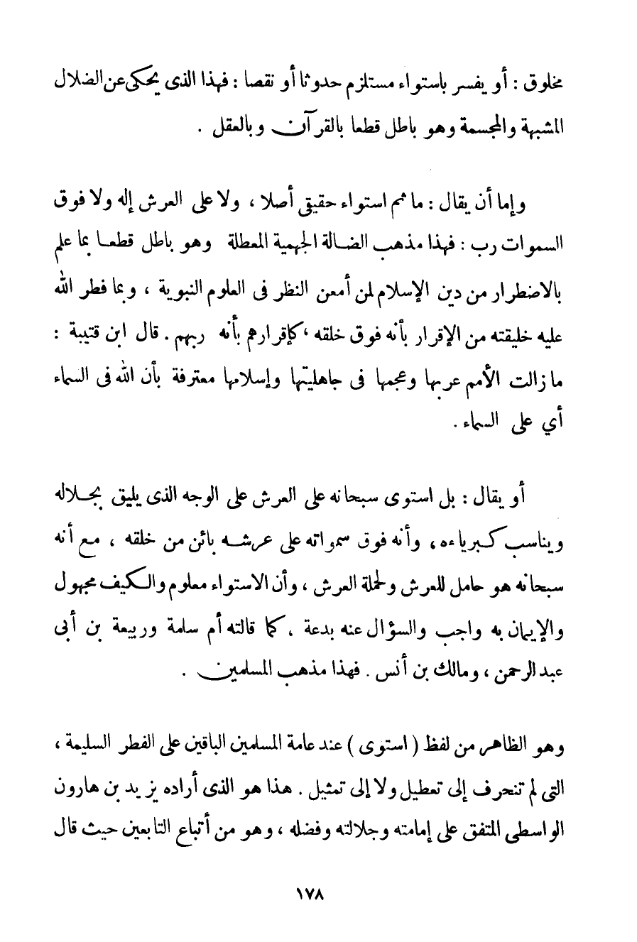 مَخْلُوقٍ: أَوْ يُفَسَّرُ بِاسْتِوَاءِ مُسْتَلْزَمٍ حُدُوثًا أَوْ نَقْصًا: فَهَذَا الَّذِي يَحْكِي عَنْ الضُّلَّالِ الْمُشَبِّهَةِ وَالْمُجَسِّمَةِ وَهُوَ بَاطِلٌ قَطْعًا بِالْقُرْآنِ وَبِالْعَقْلِ. وَإِمَّا أَنْ يُقَالَ: مَا ثَمَّ اسْتِوَاءٌ حَقِيقِيٌّ أَصْلًا وَلَا عَلَى الْعَرْشِ إلَهٌ وَلَا فَوْقَ السَّمَوَاتِ رَبٌّ: فَهَذَا مَذْهَبُ الضَّالَّةِ الْجَهْمِيَّة الْمُعَطِّلَةِ وَهُوَ بَاطِلٌ قَطْعًا بِمَا عُلِمَ بِالِاضْطِرَارِ مِنْ دِينِ الْإِسْلَامِ لِمَنْ أَمْعَنَ النَّظَرَ فِي الْعُلُومِ النَّبَوِيَّةِ وَبِمَا فَطَرَ اللَّهُ عَلَيْهِ خَلِيقَتَهُ مِنْ الْإِقْرَارِ بِأَنَّهُ فَوْقَ خَلْقِهِ كَإِقْرَارِهِمْ بِأَنَّهُ رَبُّهُمْ. قَالَ ابْنُ قُتَيْبَةَ: مَا زَالَتْ الْأُمَمُ عَرَبُهَا وَعَجَمُهَا فِي جَاهِلِيَّتِهَا وَإِسْلَامِهَا مُعْتَرِفَةً بِأَنَّ اللَّهَ فِي السَّمَاءِ أَيْ عَلَى السَّمَاءِ. أَوْ يُقَالُ: بَلْ اسْتَوَى سُبْحَانَهُ عَلَى الْعَرْشِ عَلَى الْوَجْهِ الَّذِي يَلِيقُ بِجَلَالِهِ وَيُنَاسِبُ كِبْرِيَاءَهُ وَأَنَّهُ فَوْقَ سَمَوَاتِهِ عَلَى عَرْشِهِ بَائِنٌ مِنْ خَلْقِهِ مَعَ أَنَّهُ سُبْحَانَهُ هُوَ حَامِلٌ لِلْعَرْشِ وَلِحَمَلَةِ الْعَرْشِ وَإِنَّ الِاسْتِوَاءَ مَعْلُومٌ وَالْكَيْفَ مَجْهُولٌ وَالْإِيمَانَ بِهِ وَاجِبٌ وَالسُّؤَالَ عَنْهُ بِدْعَةٌ كَمَا قَالَتْهُ أُمُّ سَلَمَةَ وَرَبِيعَةُ بْنُ أَبِي عَبْدِ الرَّحْمَنِ وَمَالِكُ بْنُ أَنَسٍ. فَهَذَا مَذْهَبُ الْمُسْلِمِينَ. وَهُوَ الظَّاهِرُ مِنْ لَفْظِ اسْتَوَى عِنْدَ عَامَّةِ الْمُسْلِمِينَ الْبَاقِينَ عَلَى الْفِطَرِ السَّلِيمَةِ الَّتِي لَمْ تَنْحَرِفْ إلَى تَعْطِيلٍ وَلَا إلَى تَمْثِيلٍ. هَذَا هُوَ الَّذِي أَرَادَهُ يَزِيدُ بْنُ هَارُونَ الْوَاسِطِيَّ الْمُتَّفَقُ عَلَى إمَامَتِهِ وَجَلَالَتِهِ وَفَضْلِهِ وَهُوَ مِنْ أَتْبَاعِ التَّابِعِينَ حَيْثُ قَالَ