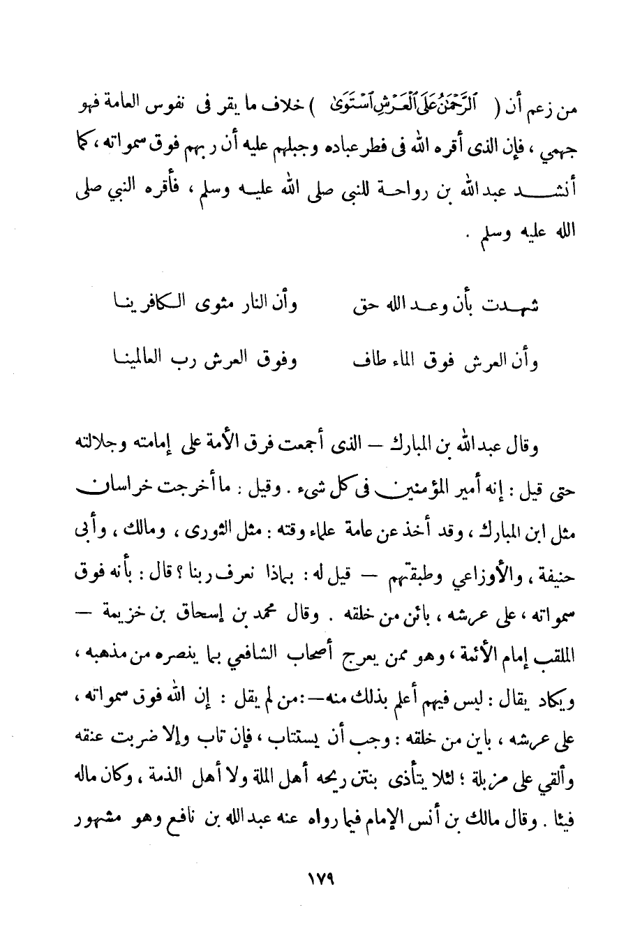 وَقَالَ عَبْدُ اللَّهِ بْنُ الْمُبَارَكِ - الَّذِي أَجْمَعَتْ فِرَقُ الْأُمَّةِ عَلَى إمَامَتِهِ وَجَلَالَتِهِ حَتَّى قِيلَ: إنَّهُ أَمِيرُ الْمُؤْمِنِينَ فِي كُلِّ شَيْءٍ. وَقِيلَ: مَا أَخْرَجَتْ خُرَاسَانُ مِثْلَ ابْنِ الْمُبَارَكِ وَقَدْ أَخَذَ عَنْ عَامَّةِ عُلَمَاءِ وَقْتِهِ: مِثْلَ الثَّوْرِيِّ وَمَالِكٍ وَأَبِي حَنِيفَةَ وَالْأَوْزَاعِي وَطَبَقَتِهِمْ - قِيلَ لَهُ: بِمَاذَا نَعْرِفُ رَبَّنَا؟ قَالَ: بِأَنَّهُ فَوْقَ سَمَوَاتِهِ عَلَى عَرْشِهِ بَائِنٌ مِنْ خَلْقِهِ. وَقَالَ مُحَمَّدُ بْنُ إسْحَاقَ بْنِ خُزَيْمَة - الْمُلَقَّبُ إمَامُ الْأَئِمَّةِ وَهُوَ مِمَّنْ يُعَرِّجُ أَصْحَابَ الشَّافِعِيِّ بِمَا يَنْصُرُهُ مِنْ مَذْهَبِهِ وَيَكَادُ يُقَالُ: لَيْسَ فِيهِمْ أَعْلَمُ بِذَلِكَ مِنْهُ -: مَنْ لَمْ يَقُلْ: إنَّ اللَّهَ فَوْقَ سَمَوَاتِهِ عَلَى عَرْشِهِ باين مِنْ خَلْقِهِ: وَجَبَ أَنْ يُسْتَتَابَ فَإِنْ تَابَ وَإِلَّا ضُرِبَتْ عُنُقُهُ وَأُلْقِيَ عَلَى مَزْبَلَةٍ؛ لِئَلَّا يَتَأَذَّى بِنَتِنِ رِيحِهِ أَهْلُ الْمِلَّةِ وَلَا أَهْلُ الذِّمَّةِ وَكَانَ مَالُهُ فَيْئًا. وَقَالَ مَالِكُ بْنُ أَنَسٍ الْإِمَامُ فِيمَا رَوَاهُ عَنْهُ عَبْدُ اللَّهِ بْنُ نَافِعٍ وَهُوَ مَشْهُورٌ