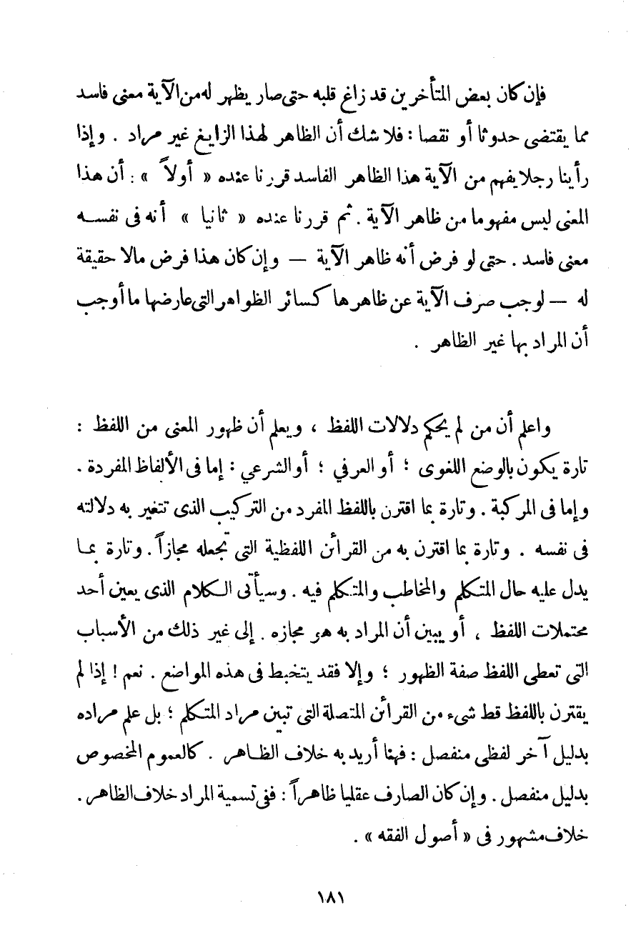 فَإِنْ كَانَ بَعْضُ الْمُتَأَخِّرِينَ قَدْ زَاغَ قَلْبُهُ حَتَّى صَارَ يَظْهَرُ لَهُ مِنْ الْآيَةِ مَعْنًى فَاسِدٌ مِمَّا يَقْتَضِي حُدُوثًا أَوْ نَقْصًا: فَلَا شَكَّ أَنَّ الظَّاهِرَ لِهَذَا الزايغ غَيْرُ مُرَادٍ. وَإِذَا رَأَيْنَا رَجُلًا يَفْهَمُ مِنْ الْآيَةِ هَذَا الظَّاهِرَ الْفَاسِدَ قَرَّرْنَا عِنْدَهُ " أَوَّلًا ": أَنَّ هَذَا الْمَعْنَى لَيْسَ مَفْهُومًا مِنْ ظَاهِرِ الْآيَةِ. ثُمَّ قَرَّرْنَا عِنْدَهُ " ثَانِيًا " أَنَّهُ فِي نَفْسِهِ مَعْنًى فَاسِدٌ. حَتَّى لَوْ فُرِضَ أَنَّهُ ظَاهِرُ الْآيَةِ - وَإِنْ كَانَ هَذَا فَرْضُ مَا لَا حَقِيقَةَ لَهُ - لَوَجَبَ صَرْفُ الْآيَةِ عَنْ ظَاهِرِهَا كَسَائِرِ الظَّوَاهِرِ الَّتِي عَارَضَهَا مَا أَوْجَبَ أَنَّ الْمُرَادَ بِهَا غَيْرُ الظَّاهِرِ. وَاعْلَمْ أَنَّ مَنْ لَمْ يُحَكِّمْ دَلَالَاتِ اللَّفْظِ وَيَعْلَمْ أَنَّ ظُهُورَ الْمَعْنَى مِنْ اللَّفْظِ: تَارَةً يَكُونُ بِالْوَضْعِ اللُّغَوِيِّ؛ أَوْ الْعُرْفِيِّ؛ أَوْ الشَّرْعِيِّ؛ إمَّا فِي الْأَلْفَاظِ الْمُفْرَدَةِ وَإِمَّا فِي الْمُرَكَّبَةِ. وَتَارَةً بِمَا اقْتَرَنَ بِاللَّفْظِ الْمُفْرَدِ مِنْ التَّرْكِيبِ الَّذِي تَتَغَيَّرُ بِهِ دَلَالَتُهُ فِي نَفْسِهِ. وَتَارَةً بِمَا اقْتَرَنَ بِهِ مِنْ الْقَرَائِنِ اللَّفْظِيَّةِ الَّتِي تَجْعَلُهُ مَجَازًا. وَتَارَةً بِمَا يَدُلُّ عَلَيْهِ حَالُ الْمُتَكَلِّمِ وَالْمُخَاطَبِ وَالْمُتَكَلَّمِ فِيهِ. وَسَيَأْتِي الْكَلَامُ الَّذِي يُعَيِّنُ أَحَدَ مُحْتَمَلَاتِ اللَّفْظِ أَوْ يُبَيِّنُ أَنَّ الْمُرَادَ بِهِ هُوَ مَجَازُهُ إلَى غَيْرِ ذَلِكَ مِنْ الْأَسْبَابِ الَّتِي تُعْطِي اللَّفْظَ صِفَةَ الظُّهُورِ؛ وَإِلَّا فَقَدْ يَتَخَبَّطُ فِي هَذِهِ الْمَوَاضِعِ. نَعَمْ إذَا لَمْ يَقْتَرِنْ بِاللَّفْظِ قَطُّ شَيْءٌ مِنْ الْقَرَائِنِ الْمُتَّصِلَةِ الَّتِي تُبَيِّنُ مُرَادَ الْمُتَكَلِّمِ؛ بَلْ عَلِمَ مُرَادَهُ بِدَلِيلِ آخَرَ لَفْظِيٍّ مُنْفَصِلٍ: فَهُنَا أُرِيدَ بِهِ خِلَافُ الظَّاهِرِ. كَالْعُمُومِ الْمَخْصُوصِ بِدَلِيلِ مُنْفَصِلٍ. وَإِنْ كَانَ الصَّارِفُ عَقْلِيًّا ظَاهِرًا: فَفِي تَسْمِيَةِ الْمُرَادِ خِلَافُ الظَّاهِرِ. خِلَافٌ مَشْهُورٌ فِي " أُصُولِ الْفِقْهِ ".