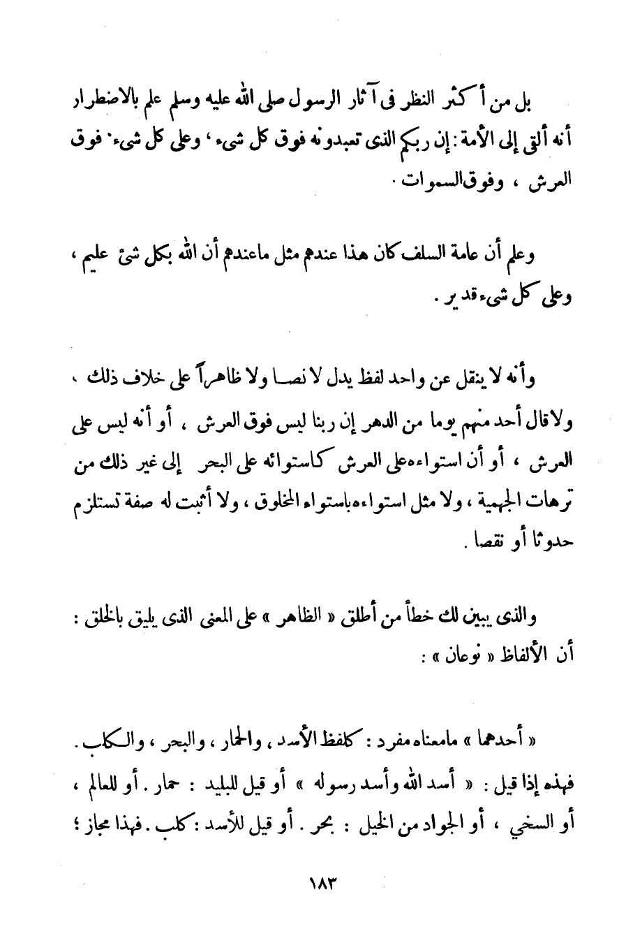بَلْ مَنْ أَكْثَرَ النَّظَرَ فِي آثَارِ الرَّسُولِ صَلَّى اللَّهُ عَلَيْهِ وَسَلَّمَ عَلِمَ بِالِاضْطِرَارِ أَنَّهُ أَلْقَى إلَى الْأُمَّةِ إنَّ رَبَّكُمْ الَّذِي تَعْبُدُونَهُ فَوْقَ كُلِّ شَيْءٍ وَعَلَى كُلِّ شَيْءٍ. فَوْقَ الْعَرْشِ وَفَوْقَ السَّمَوَاتِ. وَعَلِمَ أَنَّ عَامَّةَ السَّلَفِ كَانَ هَذَا عِنْدَهُمْ مِثْلَ مَا عِنْدَهُمْ أَنَّ اللَّهَ بِكُلِّ شَيْءٍ عَلِيمٌ وَعَلَى كُلِّ شَيْءٍ قَدِيرٌ. وَأَنَّهُ لَا يُنْقَلُ عَنْ وَاحِدٍ لَفْظٌ يَدُلُّ لَا نَصًّا وَلَا ظَاهِرًا عَلَى خِلَافِ ذَلِكَ. وَلَا قَالَ أَحَدٌ مِنْهُمْ يَوْمًا مِنْ الدَّهْرِ إنَّ رَبَّنَا لَيْسَ فَوْقَ الْعَرْشِ أَوْ أَنَّهُ لَيْسَ عَلَى الْعَرْشِ أَوْ أَنَّ اسْتِوَاءَهُ عَلَى الْعَرْشِ كَاسْتِوَائِهِ عَلَى الْبَحْرِ. إلَى غَيْرِ ذَلِكَ مِنْ تُرَّهَاتِ الْجَهْمِيَّة وَلَا مَثَّلَ اسْتِوَاءَهُ بِاسْتِوَاءِ الْمَخْلُوقِ وَلَا أَثْبَتَ لَهُ صِفَةً تَسْتَلْزِمُ حُدُوثًا أَوْ نَقْصًا. وَاَلَّذِي يُبَيِّنُ لَك خَطَأَ مَنْ أَطْلَقَ " الظَّاهِرَ " عَلَى الْمَعْنَى الَّذِي يَلِيقُ بِالْخَلْقِ: أَنَّ الْأَلْفَاظَ " نَوْعَانِ ". " أَحَدُهُمَا " مَا مَعْنَاهُ مُفْرَدٌ: كَلَفْظِ الْأَسَدِ وَالْحِمَارِ وَالْبَحْرِ وَالْكَلْبِ. فَهَذِهِ إذَا قِيلَ: " أَسَدُ اللَّهِ وَأَسَدُ رَسُولِهِ " أَوْ قِيلَ لِلْبَلِيدِ: حِمَارٌ. أَوْ لِلْعَالِمِ أَوْ السَّخِيِّ أَوْ الْجَوَادِ مِنْ الْخَيْلِ: بَحْرٌ. أَوْ قِيلَ لِلْأَسَدِ: كَلْبٌ. فَهَذَا مَجَازٌ؛