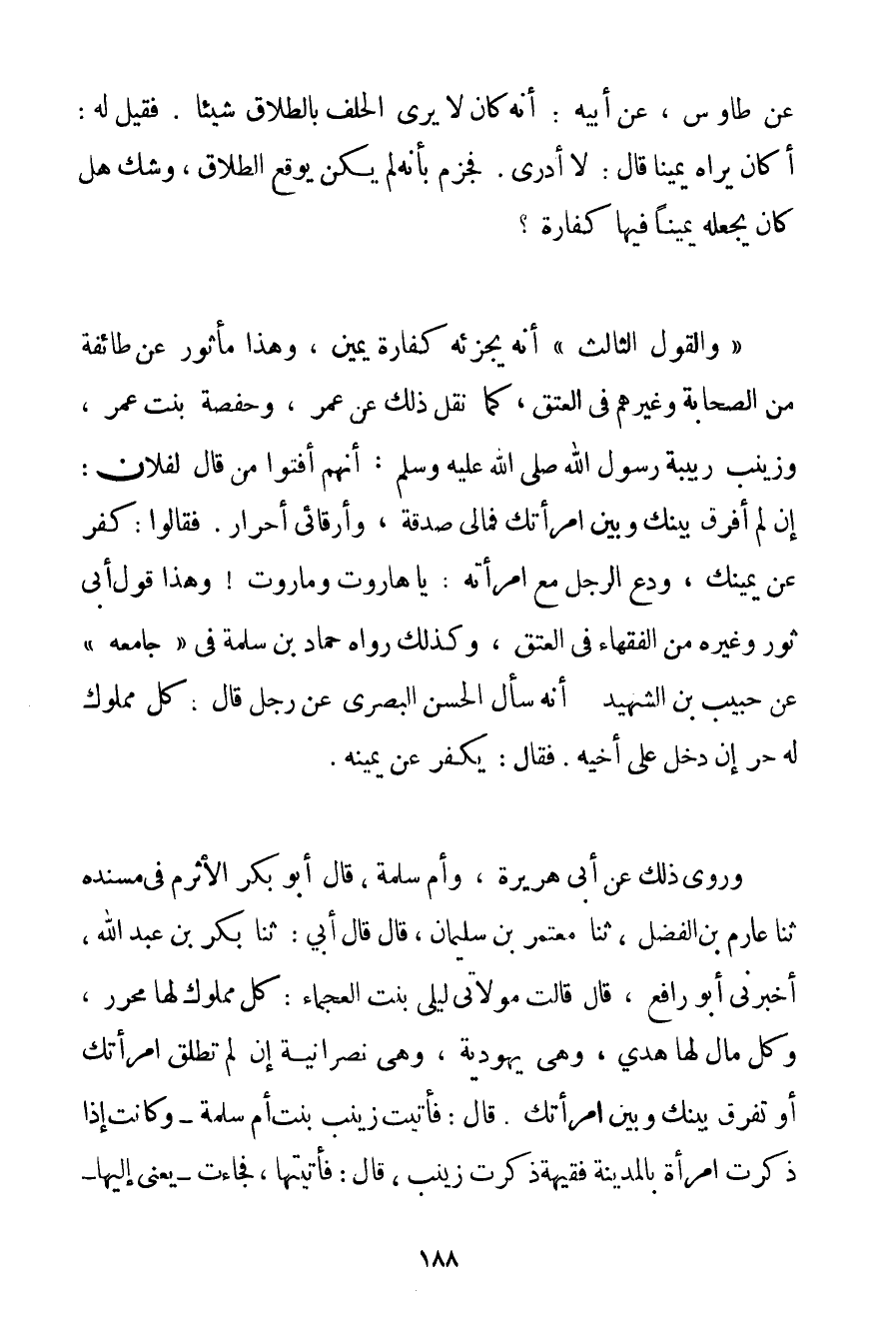 عَنْ طاوس عَنْ أَبِيهِ: أَنَّهُ كَانَ لَا يَرَى الْحَلِفَ بِالطَّلَاقِ شَيْئًا. فَقِيلَ لَهُ: أَكَانَ يَرَاهُ يَمِينًا قَالَ: لَا أَدْرِي. فَجَزَمَ بِأَنَّهُ لَمْ يَكُنْ يُوقِعُ الطَّلَاقَ وَشَكَّ هَلْ كَانَ يَجْعَلُهُ يَمِينًا فِيهَا كَفَّارَةٌ؟ " وَالْقَوْلُ الثَّالِثُ " أَنَّهُ يُجْزِئُهُ كَفَّارَةُ يَمِينٍ وَهَذَا مَأْثُورٌ عَنْ طَائِفَةٍ مِنْ الصَّحَابَةِ وَغَيْرِهِمْ فِي الْعِتْقِ كَمَا نَقَلَ ذَلِكَ عَنْ عُمَرَ وَحَفْصَةَ بِنْتِ عُمَرَ وَزَيْنَبَ رَبِيبَةِ رَسُولِ اللَّهِ صَلَّى اللَّهُ عَلَيْهِ وَسَلَّمَ: أَنَّهُمْ أَفْتَوْا مَنْ قَالَ لِفُلَانِ: إنْ لَمْ أُفَرِّقْ بَيْنَك وَبَيْنَ امْرَأَتِك فَمَالِي صَدَقَةٌ وَأَرِقَّائِي أَحْرَارٌ. فَقَالُوا: كَفِّرْ عَنْ يَمِينِك وَدَعْ الرَّجُلَ مَعَ امْرَأَتِهِ: يَا هَارُوتُ وَمَارُوتُ وَهَذَا قَوْلُ أَبِي ثَوْرٍ وَغَيْرِهِ مِنْ الْفُقَهَاءِ فِي الْعِتْقِ وَكَذَلِكَ رَوَاهُ حَمَّادُ بْنُ سَلَمَةَ فِي " جَامِعِهِ " عَنْ حَبِيبِ بْنِ الشَّهِيدِ. أَنَّهُ سَأَلَ الْحَسَنَ الْبَصْرِيَّ عَنْ رَجُلٍ قَالَ: كُلُّ مَمْلُوكٍ لَهُ حُرٌّ إنْ دَخَلَ عَلَى أَخِيهِ. فَقَالَ: يُكَفِّرُ عَنْ يَمِينِهِ. وَرُوِيَ ذَلِكَ عَنْ أَبِي هُرَيْرَةَ وَأُمِّ سَلَمَةَ قَالَ أَبُو بَكْرٍ الْأَثْرَمُ فِي مُسْنَدِهِ ثَنَا عَارِمُ بْنُ الْفَضْلِ ثَنَا مُعْتَمِرُ بْنُ سُلَيْمَانَ قَالَ قَالَ أَبِي: ثَنَا بَكْرُ بْنُ عَبْدِ اللَّهِ أَخْبَرَنِي أَبُو رَافِعٍ قَالَ قَالَتْ مَوْلَاتِي لَيْلَى بِنْتِ الْعَجْمَاءِ؛ كُلُّ مَمْلُوكٍ لَهَا مُحَرَّرٌ وَكُلُّ مَالٍ لَهَا هَدْيٌ وَهِيَ يَهُودِيَّةٌ وَهِيَ نَصْرَانِيَّةٌ إنْ لَمْ تُطَلِّقْ امْرَأَتَك أَوْ تُفَرِّقْ بَيْنَك وَبَيْنَ امْرَأَتِك. قَالَ: فَأَتَيْت زَيْنَبَ بِنْتَ أُمِّ سَلَمَةَ - وَكَانَتْ إذَا ذُكِرَتْ امْرَأَةٌ بِالْمَدِينَةِ فَقِيهَةٌ ذُكِرَتْ زَيْنَبُ قَالَ: فَأَتَيْتهَا فَجَاءَتْ - يَعْنِي إلَيْهَا -
