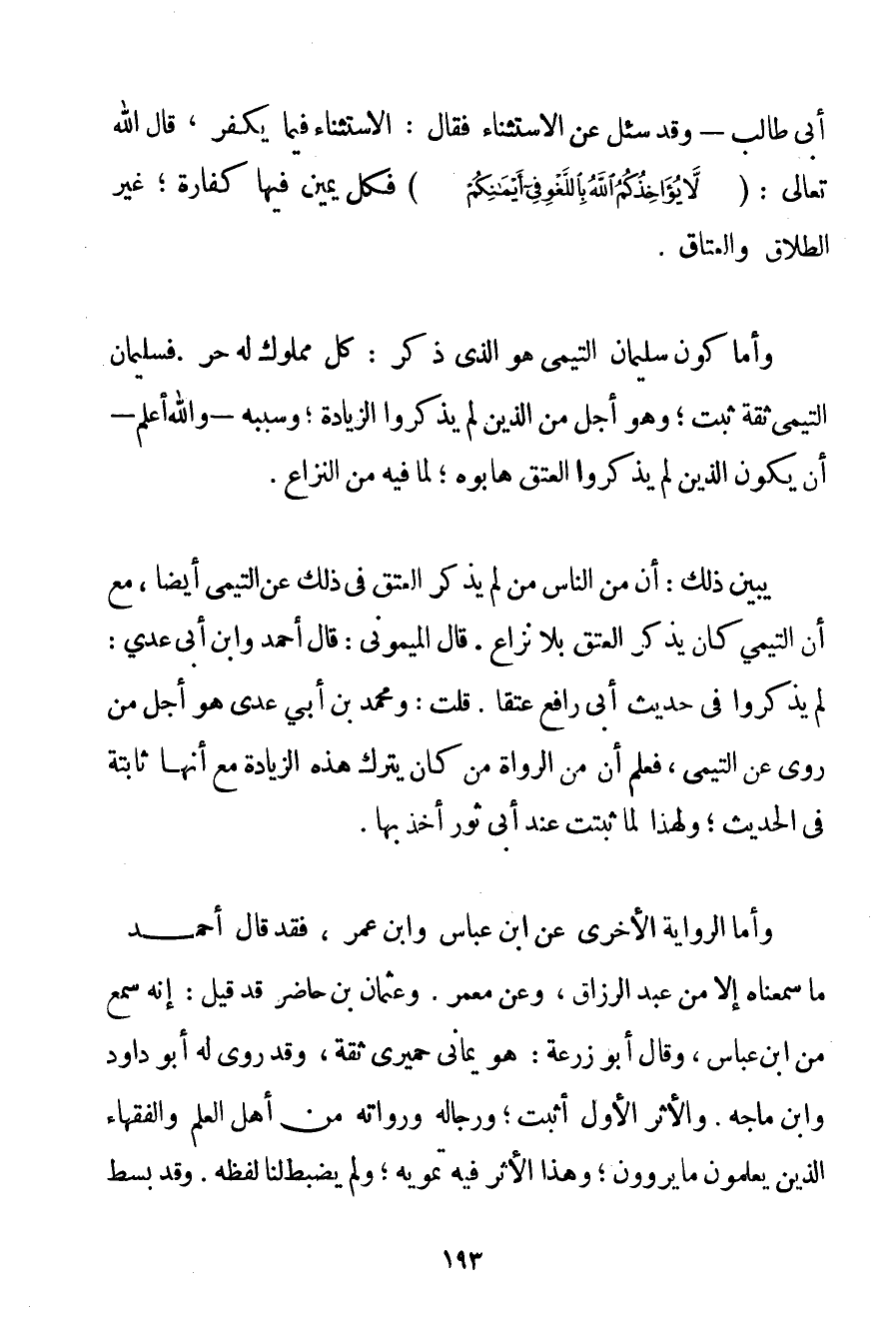 أَبِي طَالِبٍ - وَقَدْ سُئِلَ عَنْ الِاسْتِثْنَاءِ فَقَالَ: الِاسْتِثْنَاءُ فِيمَا يُكَفِّرُ قَالَ اللَّهُ تَعَالَى: {لَا يُؤَاخِذُكُمُ اللَّهُ بِاللَّغْوِ فِي أَيْمَانِكُمْ} فَكُلُّ يَمِينٍ فِيهَا كَفَّارَةٌ؛ غَيْرُ الطَّلَاقِ وَالْعَتَاقِ. وَأَمَّا كَوْنُ سُلَيْمَانَ التيمي هُوَ الَّذِي ذَكَرَ: كُلُّ مَمْلُوكٍ لَهُ حُرٌّ. فَسُلَيْمَانُ التيمي ثِقَةٌ ثَبْتٌ؛ وَهُوَ أَجَلُّ مَنْ الَّذِينَ لَمْ يَذْكُرُوا الزِّيَادَةَ؛ وَسَبَبُهُ - وَاَللَّهُ أَعْلَمُ - أَنْ يَكُونَ الَّذِينَ لَمْ يَذْكُرُوا الْعِتْقَ هَابُوهُ؛ لِمَا فِيهِ مِنْ النِّزَاعِ. يُبَيِّنُ ذَلِكَ: أَنَّ مِنْ النَّاسِ مَنْ لَمْ يَذْكُرْ الْعِتْقَ فِي ذَلِكَ عَنْ التيمي أَيْضًا مَعَ أَنَّ التيمي كَانَ يَذْكُرُ الْعِتْقَ بِلَا نِزَاعٍ. قَالَ الْمَيْمُونِيَّ: قَالَ أَحْمَد وَابْنُ أَبِي عَدِيّ: لَمْ يَذْكُرُوا فِي حَدِيثِ أَبِي رَافِعٍ عَتَقَ. قُلْت: وَمُحَمَّدُ بْنُ أَبِي عَدِيّ هُوَ أَجَلُّ مَنْ رَوَى عَنْ التيمي فَعَلِمَ أَنَّ مِنْ الرُّوَاةِ مَنْ كَانَ يَتْرُكُ هَذِهِ الزِّيَادَةَ مَعَ أَنَّهَا ثَابِتَةٌ فِي الْحَدِيثِ؛ وَلِهَذَا لَمَّا ثَبَتَتْ عِنْدَ أَبِي ثَوْرٍ أَخَذَ بِهَا. وَأَمَّا الرِّوَايَةُ الْأُخْرَى عَنْ ابْنِ عَبَّاسٍ وَابْنِ عُمَرَ فَقَدْ قَالَ أَحْمَد مَا سَمِعْنَاهُ إلَّا مِنْ عَبْدِ الرَّزَّاقِ وَعَنْ مَعْمَرٍ. وَعُثْمَانَ بْنِ حَاضِرٍ قَدْ قِيلَ: إنَّهُ سَمِعَ مِنْ ابْنِ عَبَّاسٍ وَقَالَ أَبُو زَرْعَةَ: هُوَ يَمَانِيٌّ حِمْيَرِيٌّ ثِقَةٌ وَقَدْ رَوَى لَهُ أَبُو دَاوُد وَابْنُ مَاجَه. وَالْأَثَرُ الْأَوَّلُ أَثْبَتُ؛ وَرِجَالُهُ وَرُوَاتُهُ مِنْ أَهْلِ الْعِلْمِ وَالْفُقَهَاءِ الَّذِينَ يَعْلَمُونَ مَا يَرْوُونَ؛ وَهَذَا الْأَثَرُ فِيهِ تَمْوِيهٌ؛ وَلَمْ يُضْبَطْ لَنَا لَفْظُهُ. وَقَدْ بُسِطَ