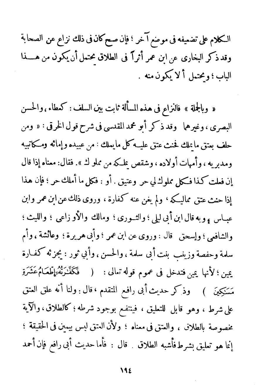 الْكَلَامُ عَلَى تَضْعِيفِهِ فِي مَوْضِعٍ آخَرَ؛ فَإِنْ صَحَّ كَانَ فِي ذَلِكَ نِزَاعٌ عَنْ الصَّحَابَةِ وَقَدْ ذَكَرَ الْبُخَارِيُّ عَنْ ابْنِ عُمَرَ أَثَرًا فِي الطَّلَاقِ يَحْتَمِلُ أَنْ يَكُونَ مِنْ هَذَا الْبَابِ وَيَحْتَمِلُ أَلَّا يَكُونَ مِنْهُ. " وَبِالْجُمْلَةِ " فَالنِّزَاعُ فِي هَذِهِ الْمَسْأَلَةِ ثَابِتٌ بَيْنَ السَّلَفِ: كَعَطَاءِ وَالْحَسَنِ الْبَصْرِيِّ وَغَيْرِهِمَا وَقَدْ ذَكَرَ أَبُو مُحَمَّدٍ المقدسي فِي شَرْحِ قَوْلِ الخرقي: " وَمَنْ حَلَفَ بِعِتْقِ مَا يَمْلِكُ فَحَنِثَ عَتَقَ عَلَيْهِ كُلُّ مَا يَمْلِكُ: مِنْ عَبِيدِهِ وَإِمَائِهِ وَمُكَاتِبِيهِ وَمُدَبِّرِيهِ وَأُمَّهَاتِ أَوْلَادِهِ وَشِقْصٍ يَمْلِكُهُ مِنْ مَمْلُوكٍ ". فَقَالَ: مَعْنَاهُ إذَا قَالَ إنْ فَعَلْت كَذَا فَكُلُّ مَمْلُوكٍ لِي حُرٌّ وَعَتِيقٌ. أَوْ: فَكُلُّ مَا أَمْلِكُ حُرٌّ؛ فَإِنَّ هَذَا إذَا حَنِثَ عَتَقَ مَمَالِيكُهُ وَلَمْ يُغْنِ عَنْهُ كَفَّارَةٌ وَرُوِيَ ذَلِكَ عَنْ ابْنِ عُمَرَ وَابْنِ عَبَّاسٍ؛ وَبِهِ قَالَ ابْنُ أَبِي لَيْلَى؛ وَالثَّوْرِيُّ؛ وَمَالِكٌ وَالْأَوْزَاعِي؛ وَاللَّيْثُ؛ وَالشَّافِعِيُّ؛ وَإِسْحَاقُ قَالَ: وَرُوِيَ عَنْ ابْنِ عُمَرَ؛ وَأَبِي هُرَيْرَةَ؛ وَعَائِشَةَ وَأُمِّ سَلَمَةَ وَحَفْصَةَ وَزَيْنَبَ بِنْتِ أَبِي سَلَمَةَ وَالْحَسَنِ وَأَبِي ثَوْرٍ: يُجْزِئُهُ كَفَّارَةُ يَمِينٍ؛ لِأَنَّهَا يَمِينٌ فَتَدْخُلُ فِي عُمُومِ قَوْله تَعَالَى {فَكَفَّارَتُهُ إطْعَامُ عَشَرَةِ مَسَاكِينَ} وَذَكَرَ حَدِيثَ أَبِي رَافِعٍ الْمُتَقَدِّمِ قَالَ: وَلَنَا أَنَّهُ عَلَّقَ الْعِتْقَ عَلَى شَرْطٍ وَهُوَ قَابِلٌ لِلتَّعْلِيقِ فَيَنْتَفِعُ بِوُجُودِ شَرْطِهِ كَالطَّلَاقِ وَالْآيَةُ مَخْصُوصَةٌ بِالطَّلَاقِ وَالْعِتْقِ فِي مَعْنَاهُ؛ وَلِأَنَّ الْعِتْقَ لَيْسَ بِيَمِينِ فِي الْحَقِيقَةِ؛ إنَّمَا هُوَ تَعْلِيقٌ بِشَرْطِ فَأَشْبَهَ الطَّلَاقَ. قَالَ: فَأَمَّا حَدِيثُ أَبِي رَافِعٍ فَإِنَّ أَحْمَد