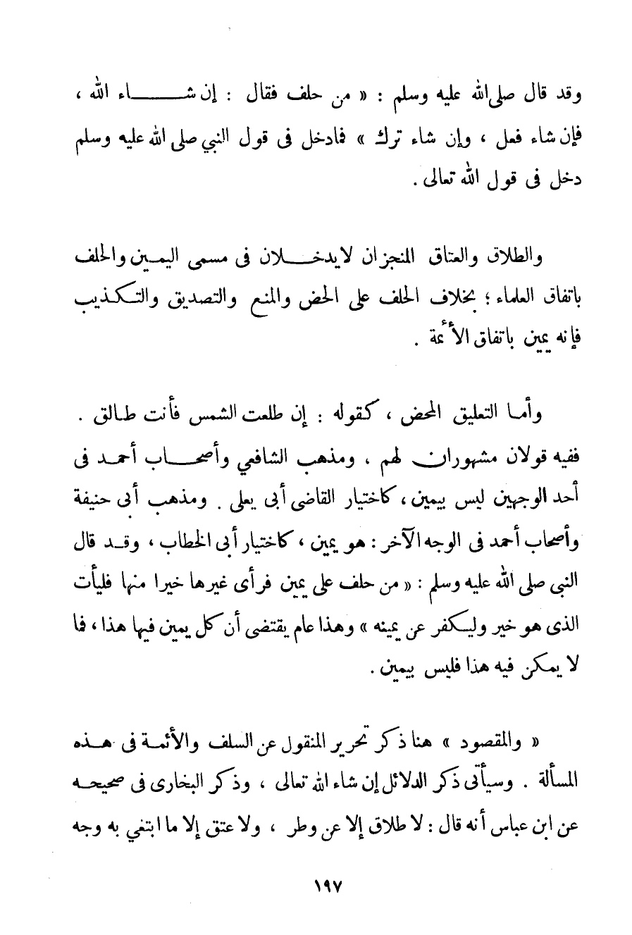 وَأَمَّا التَّعْلِيقُ الْمَحْضُ كَقَوْلِهِ: إنْ طَلَعَتْ الشَّمْسُ فَأَنْتِ طَالِقٌ. فَفِيهِ قَوْلَانِ مَشْهُورَانِ لَهُمْ وَمَذْهَبُ الشَّافِعِيِّ وَأَصْحَابِ أَحْمَد فِي أَحَدِ الْوَجْهَيْنِ لَيْسَ بِيَمِينِ كَاخْتِيَارِ الْقَاضِي أَبِي يَعْلَى. وَمَذْهَبِ أَبِي حَنِيفَةَ وَأَصْحَابِ أَحْمَد فِي الْوَجْهِ الْآخَرِ: هُوَ يَمِينٌ كَاخْتِيَارِ أَبِي الْخَطَّابِ وَقَدْ قَالَ النَّبِيُّ صَلَّى اللَّهُ عَلَيْهِ وَسَلَّمَ {مَنْ حَلَفَ عَلَى يَمِينٍ فَرَأَى غَيْرَهَا خَيْرًا مِنْهَا فَلْيَأْتِ الَّذِي هُوَ خَيْرٌ وَلْيُكَفِّرْ عَنْ يَمِينِهِ} وَهَذَا عَامٌّ يَقْتَضِي أَنَّ كُلَّ يَمِينٍ فِيهَا هَذَا فَمَا لَا يُمْكِنُ فِيهِ هَذَا فَلَيْسَ بِيَمِينِ. " وَالْمَقْصُودُ " هُنَا ذَكَرَ تَحْرِيرِ الْمَنْقُولِ عَنْ السَّلَفِ وَالْأَئِمَّةِ فِي هَذِهِ الْمَسْأَلَةِ. وَسَيَأْتِي ذِكْرُ الدَّلَائِلِ إنْ شَاءَ اللَّهُ تَعَالَى وَذَكَرَ الْبُخَارِيُّ فِي صَحِيحِهِ عَنْ ابْنِ عَبَّاسٍ أَنَّهُ قَالَ: لَا طَلَاقَ إلَّا عَنْ وَطَرٍ وَلَا عِتْقَ إلَّا مَا اُبْتُغِيَ بِهِ وَجْهُ